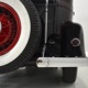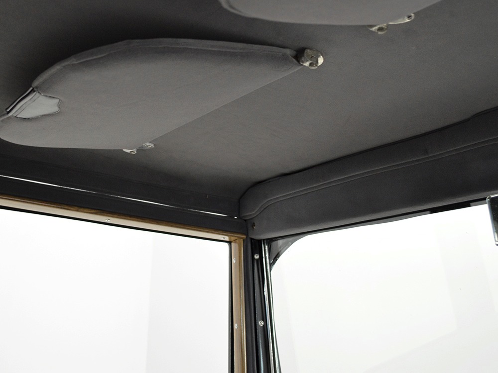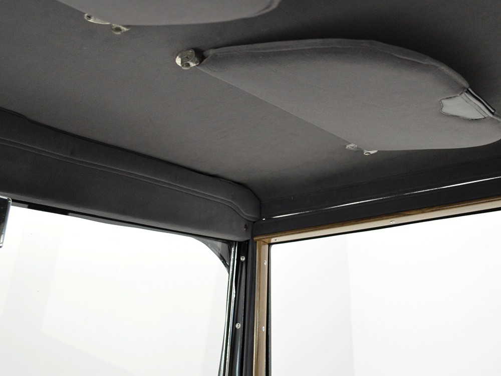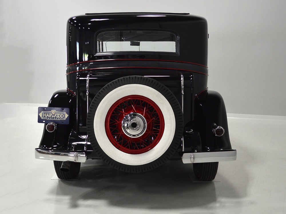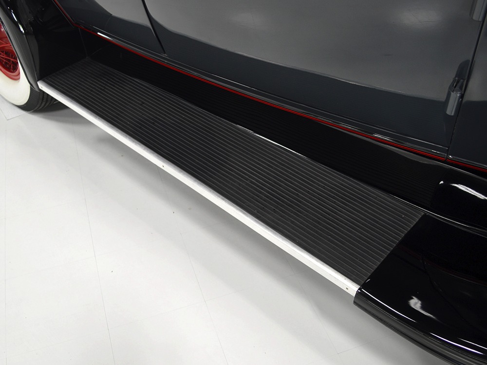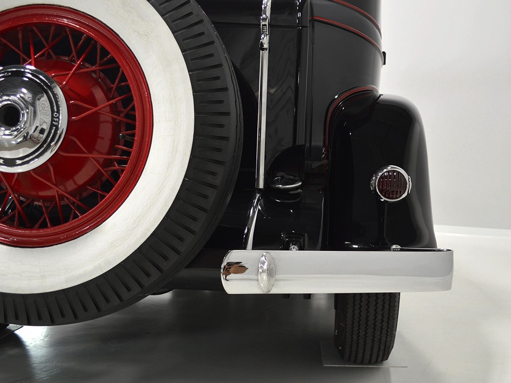 We have the original build sheet for this lovely Town Sedan and Monsoon Gray is indeed the original color. In fact, it is fully restored exactly the way it was when it was new, complete with black trim and scarlet red pinstripes and wheels. Quality is impressive, even after several years. The paint has a deep shine, the masking between the colors is crisp, and the pinstripes are sharp, all befitting a Cadillac of this stature. Town Sedan was Cadillac’s name for the more familiar “club sedan” which is a close-coupled 4-door that’s a bit more intimate and sporting than the standard 4-door. It gives up a little leg room in the back but gains a very handsome built-in trunk and near-ideal proportions that make it one of the best-looking 4-doors of the era. We also like the rear-mounted spare tire, which visually lengthens the Town Sedan (although on a 134-inch wheelbase, it doesn’t really need help in that regard) and makes the hood and fenders especially graceful. There’s simply not an angle from which this car doesn’t look good. And as a Cadillac, the doors close with genuine authority, a pleasing kerchunk that feels permanent and secure. Individual doors on the hood can be opened to cool the engine with an additional door on each side of the cowl to cool the interior.