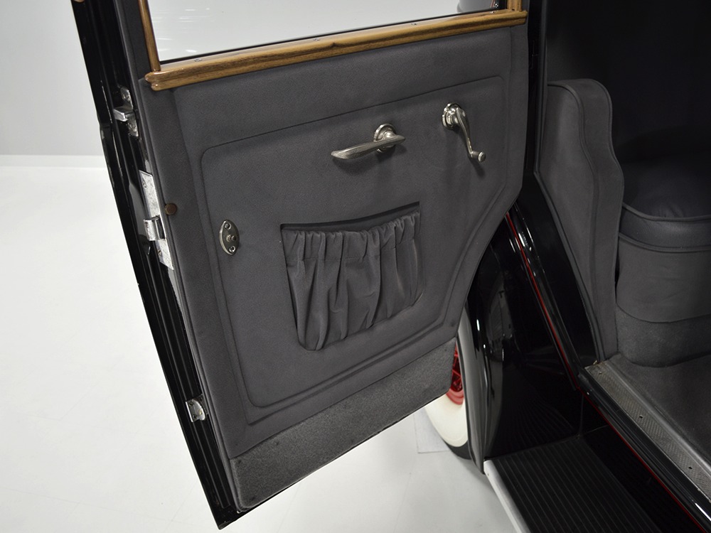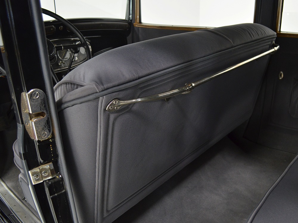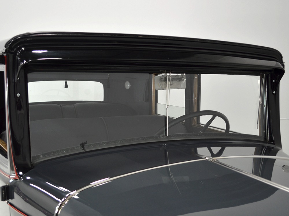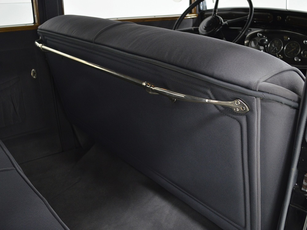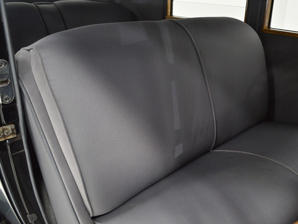 The lovely gray Bedford cord interior is expertly tailored and looks very correct for 1931. The fabrics and stitching, complete with wide piping around the cushions, is how it was originally done and there’s fresh stuffing underneath so it feels firm and comfortable behind the wheel. Plush carpets feel upscale and help control noise and heat and the simple door panels are trimmed with refinished wood garnish moldings. Original door hardware is nickel plated and has a soft satin shine that looks right and the big 4-spoke steering wheel is a bit more detailed than those from earlier years. Looking closely you’ll see that the lever for the headlight control on the hub of the wheel has broken off, a very common problem, as your shirt sleeve tends to snag on it (I know I’ve almost broken mine several times just getting out of the car). The handsome instrument panel is more upscale-looking than in previous years where the gauges were just scattered across an expanse of painted steel, and the ornate background is in good original condition. Factory gauges have slender pointers and Art-Deco numbering and they all work save for the temperature gauge (and possibly the clock, which appears to be a hand-wound unit that we haven’t tested). Controls for the instrument lights and unique sliding windshield wipers are to the left of the steering column and the burled walnut trim at the base of the windshield is in great shape. Rear seat passengers have plenty of room despite the close-coupled body style and there are small ashtrays and lighters in nooks by the armrests. A larger center arm rest folds down and there is a silk shade for the rear window. Somebody spent a lot of money here.