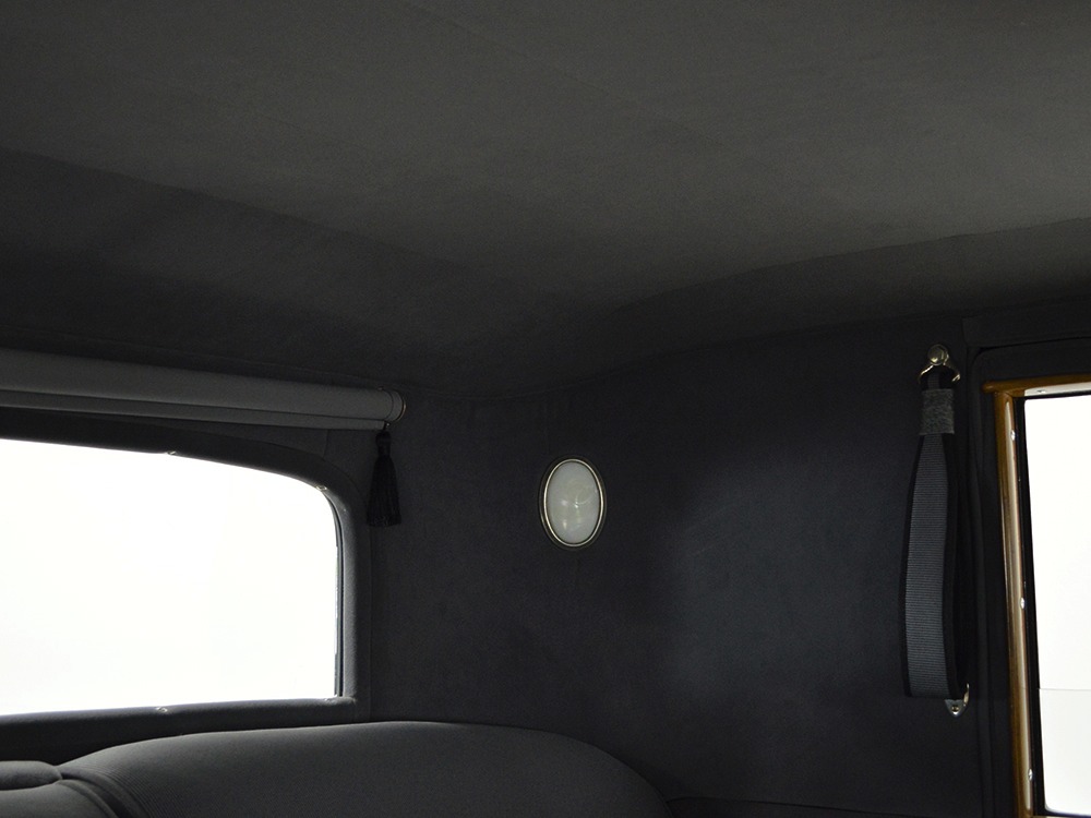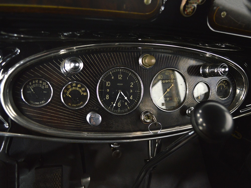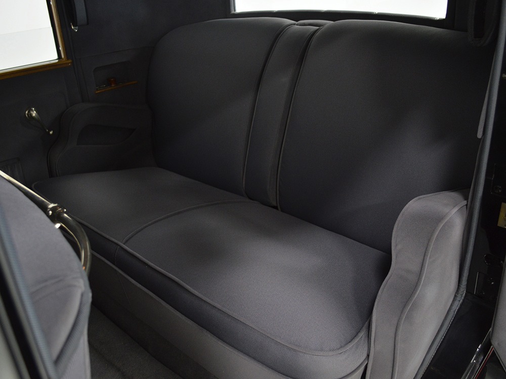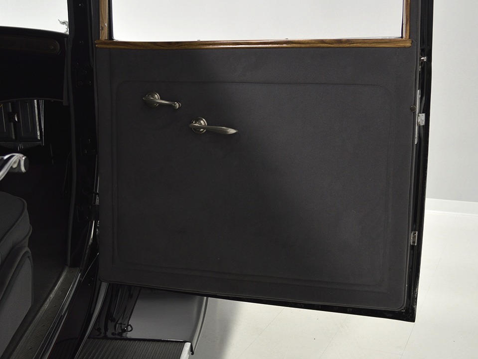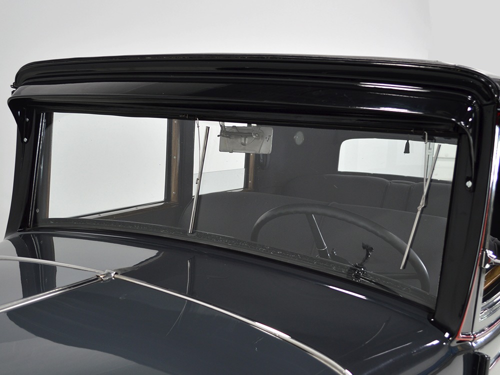 The lovely gray Bedford cord interior is expertly tailored and looks very correct for 1931. The fabrics and stitching, complete with wide piping around the cushions, is how it was originally done and there’s fresh stuffing underneath so it feels firm and comfortable behind the wheel. Plush carpets feel upscale and help control noise and heat and the simple door panels are trimmed with refinished wood garnish moldings. Original door hardware is nickel plated and has a soft satin shine that looks right and the big 4-spoke steering wheel is a bit more detailed than those from earlier years. Looking closely you’ll see that the lever for the headlight control on the hub of the wheel has broken off, a very common problem, as your shirt sleeve tends to snag on it (I know I’ve almost broken mine several times just getting out of the car). The handsome instrument panel is more upscale-looking than in previous years where the gauges were just scattered across an expanse of painted steel, and the ornate background is in good original condition. Factory gauges have slender pointers and Art-Deco numbering and they all work save for the temperature gauge (and possibly the clock, which appears to be a hand-wound unit that we haven’t tested). Controls for the instrument lights and unique sliding windshield wipers are to the left of the steering column and the burled walnut trim at the base of the windshield is in great shape. Rear seat passengers have plenty of room despite the close-coupled body style and there are small ashtrays and lighters in nooks by the armrests. A larger center arm rest folds down and there is a silk shade for the rear window. Somebody spent a lot of money here.