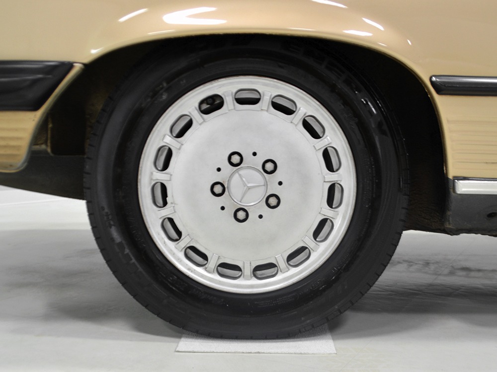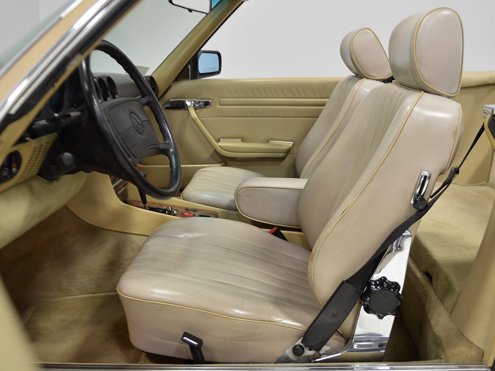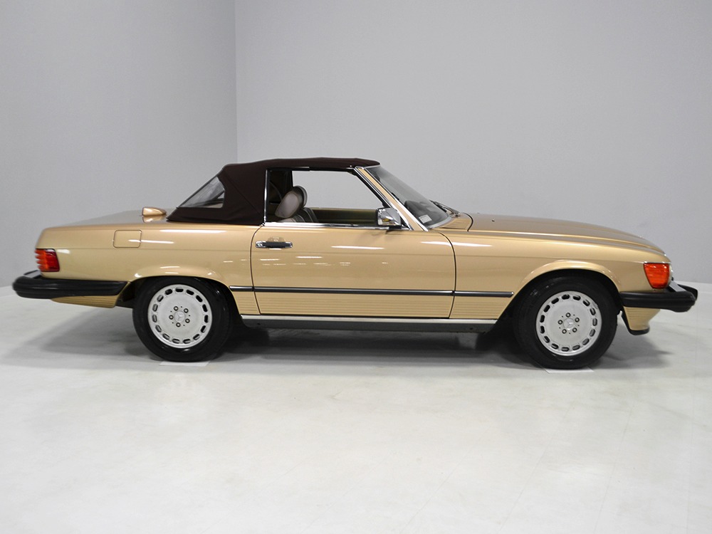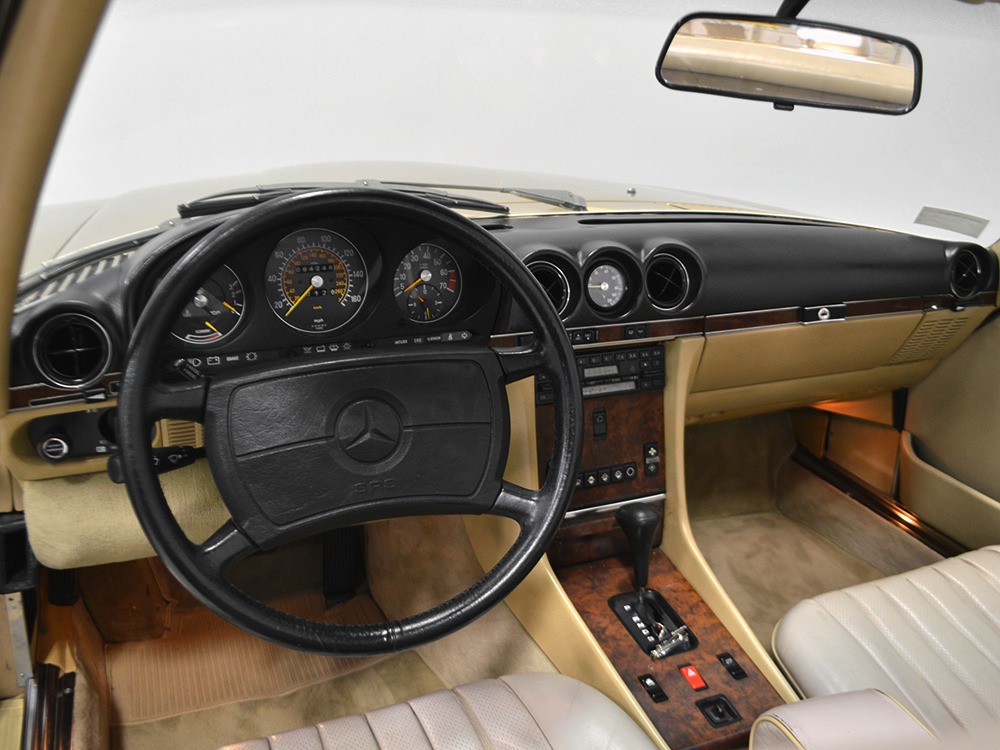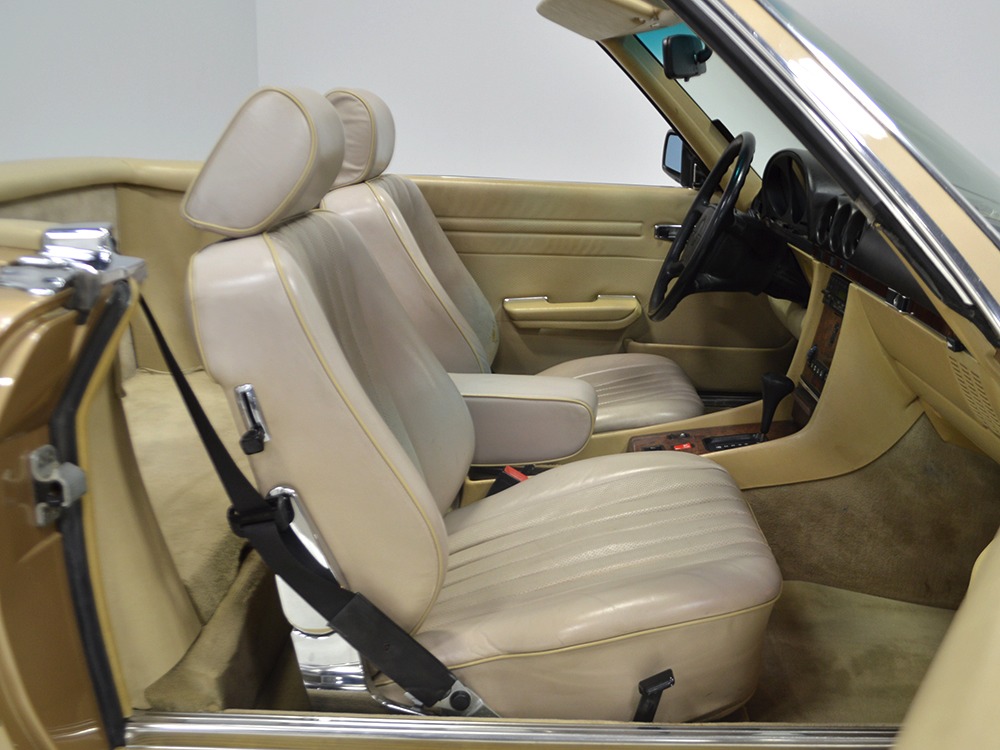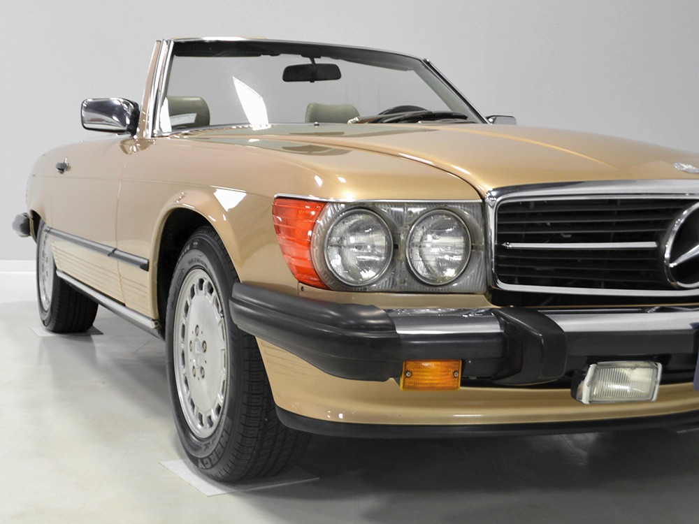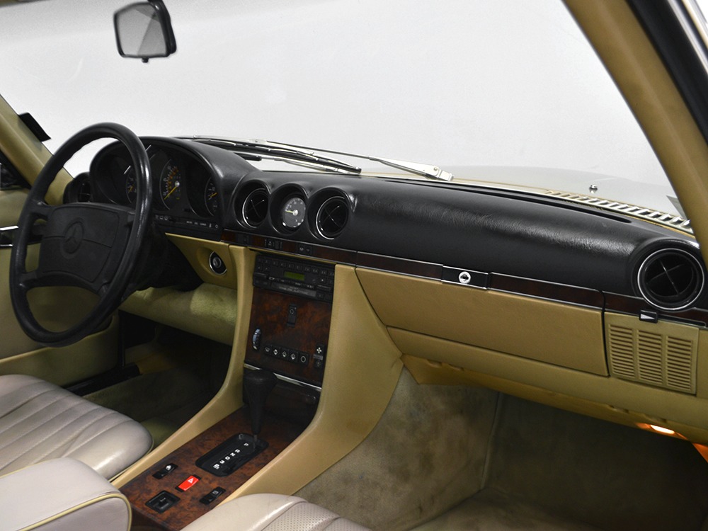 Remarkably, that remains true today, but given the affordable prices on many of the R107 SLs, you no longer need a seven-figure bank balance to put one in your garage. This 1986 560SL represents the pinnacle of R107 development and if you seek one of these cars, it’s exactly what you should be buying. There are cheaper SLs available, but if you do a little research you’ll quickly discover that there are definitely good SLs and bad SLs and that a cheap SL is perhaps the most expensive car you can own if service has been neglected. In contrast, this one has had just one owner and comes to us from his estate, so it’s got a known history. It shows just 84,213 original miles and is in excellent original condition. That’s factory-applied Desert Tan paint (which really looks like gold metallic) that is just the right shade to accentuate the long, low lines of the SL roadster and it remains in excellent condition overall. There are few nits to pick and the only notable one is that the driver’s front fender appears to have been repainted at some point (don’t worry, it’s far less noticeable out in the real world than in our photo studio—we didn’t even spot it until we saw the photos). Otherwise, this car is in very good condition throughout.