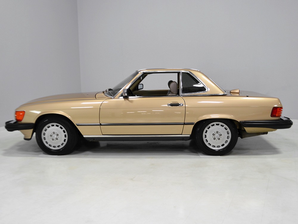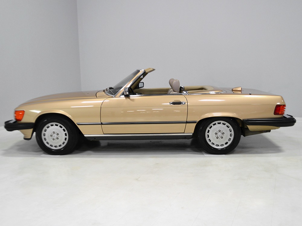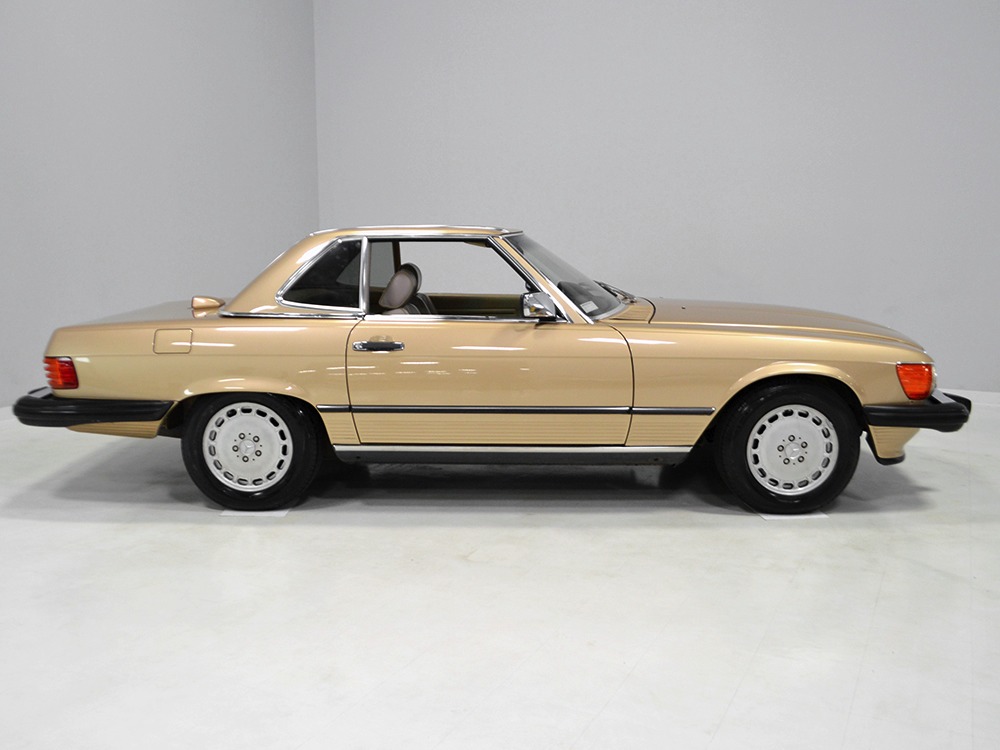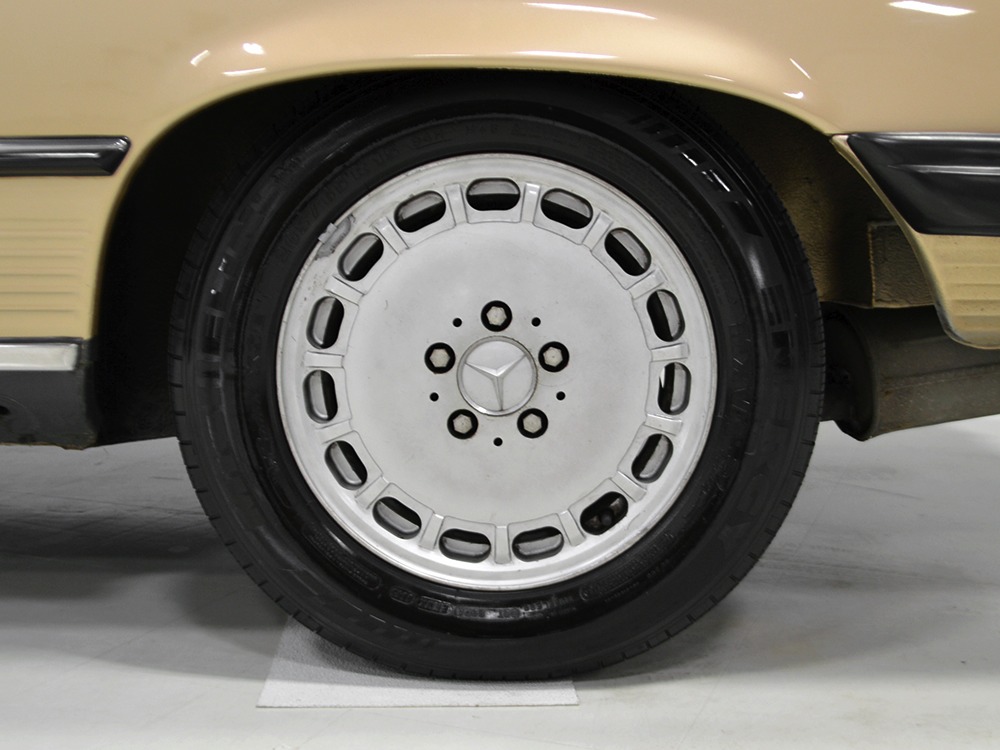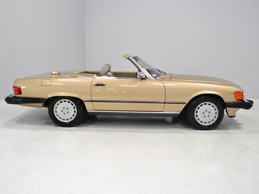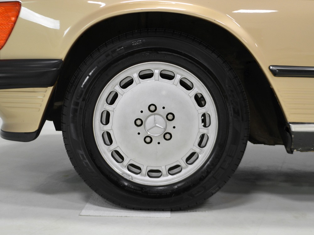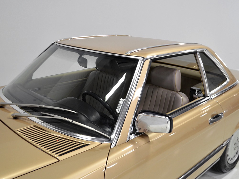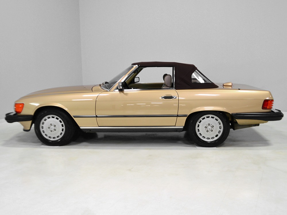 Remarkably, that remains true today, but given the affordable prices on many of the R107 SLs, you no longer need a seven-figure bank balance to put one in your garage. This 1986 560SL represents the pinnacle of R107 development and if you seek one of these cars, it’s exactly what you should be buying. There are cheaper SLs available, but if you do a little research you’ll quickly discover that there are definitely good SLs and bad SLs and that a cheap SL is perhaps the most expensive car you can own if service has been neglected. In contrast, this one has had just one owner and comes to us from his estate, so it’s got a known history. It shows just 84,213 original miles and is in excellent original condition. That’s factory-applied Desert Tan paint (which really looks like gold metallic) that is just the right shade to accentuate the long, low lines of the SL roadster and it remains in excellent condition overall. There are few nits to pick and the only notable one is that the driver’s front fender appears to have been repainted at some point (don’t worry, it’s far less noticeable out in the real world than in our photo studio—we didn’t even spot it until we saw the photos). Otherwise, this car is in very good condition throughout.