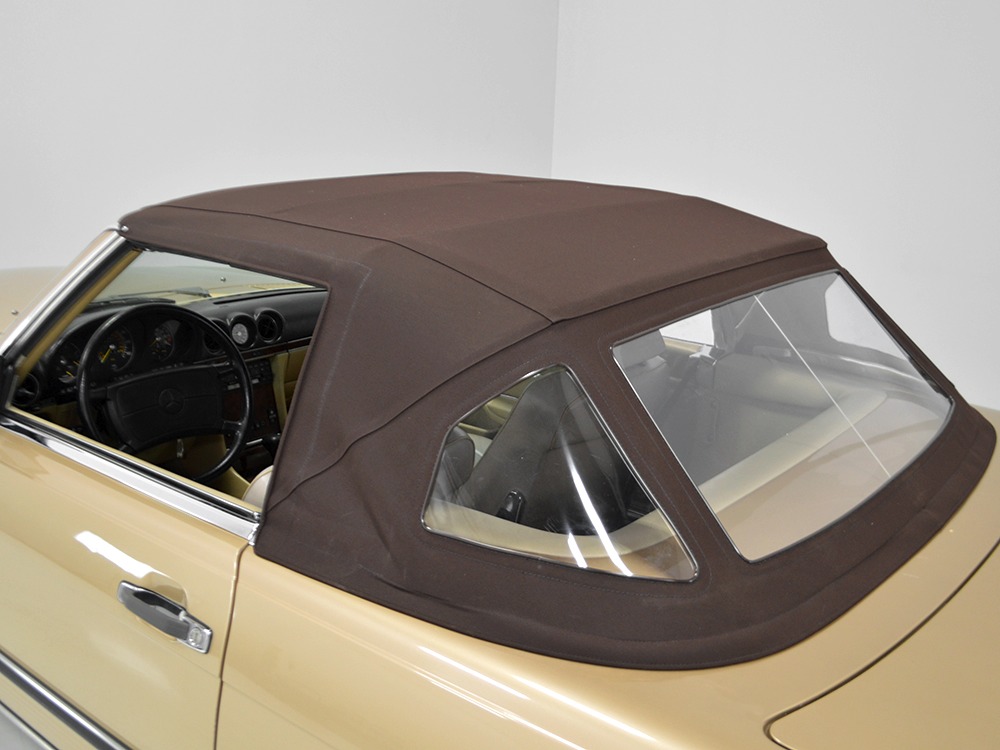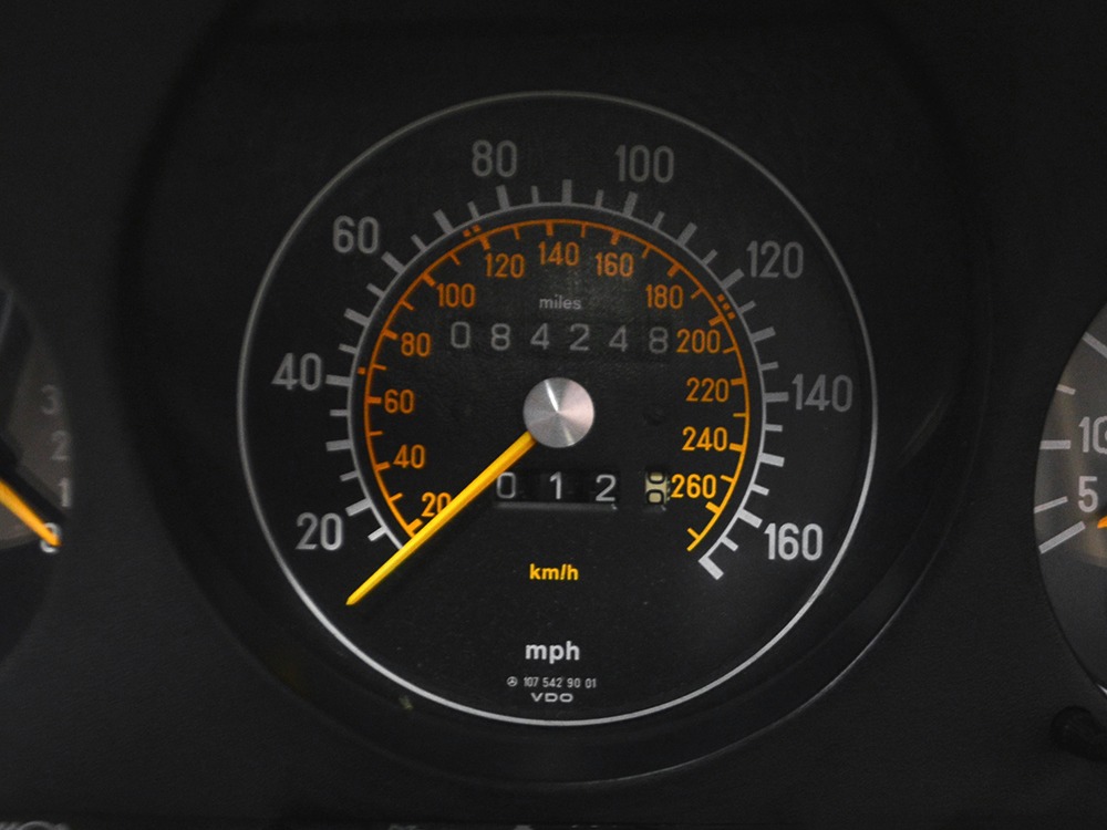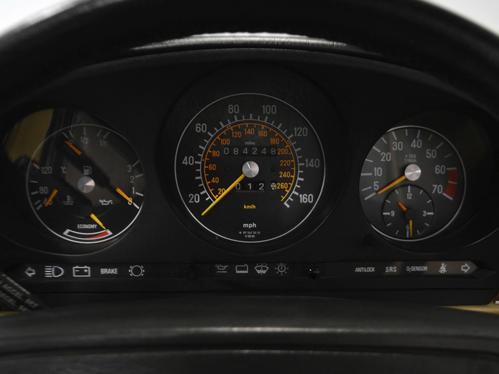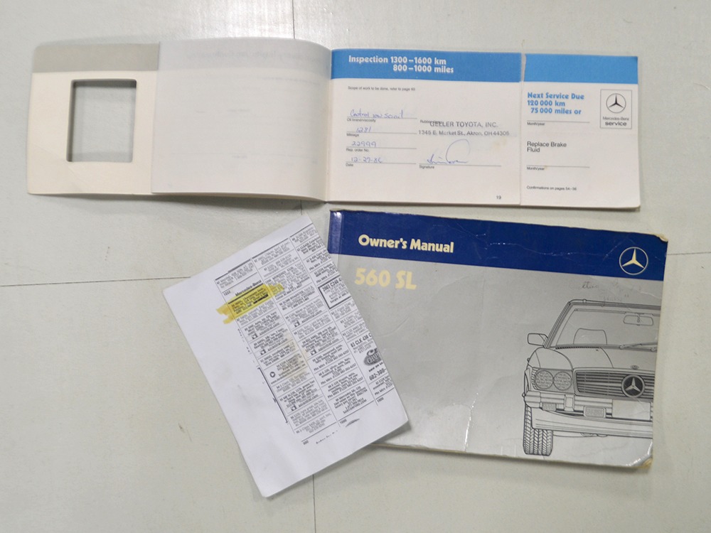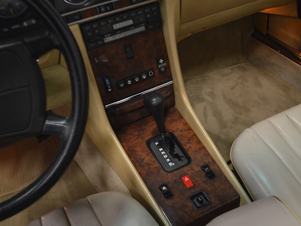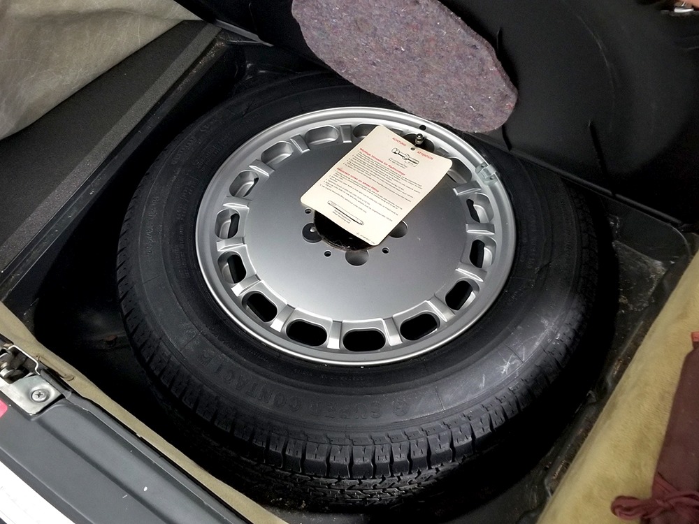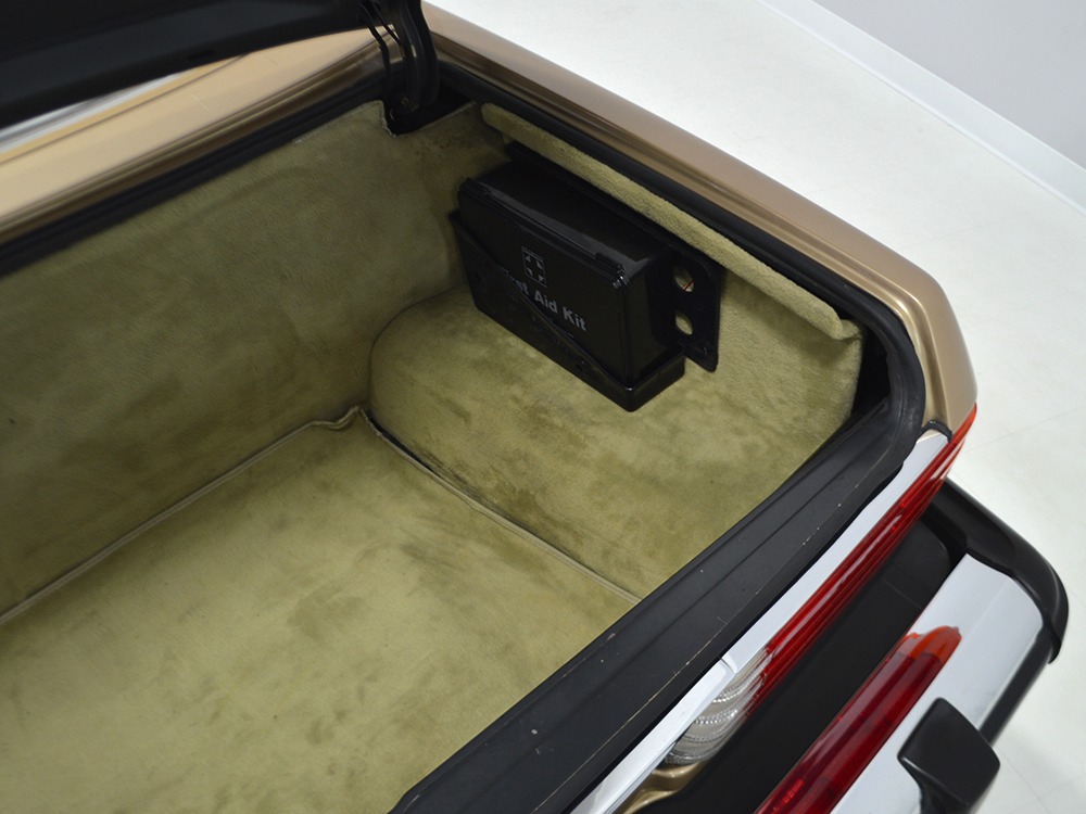 Among the many upgrades the 560s received was standard leather upholstery in place of the previous MB-Tex vinyl. While the MB-Tex wears like iron, if you’re spending $65,000 1986 dollars on a new luxury car, leather really should be standard equipment. As a result, the interesting light tan hides in this 560 remain in excellent condition with only the most minor signs of use on the driver’s lower seat cushion, wear that many would call “comfort marks.” Yes, that’s the original interior and it’s got to be a rare combination. There are no splits or tears in the leather and the only notable wear is on the driver’s outer bolster, which isn’t a surpise. An airbag steering wheel was also a new arrival in the 560, eliminating the need for other passive restraints (remember those early motorized seat belts?) and giving it a much more finished look. The gauges should look familiar to anyone who has driven a Mercedes-Benz in the 1970s and ‘80s, and everything is fully functional. Climate control, cruise control, power windows, mirrors, and locks, and all the other accessories are operational, with the A/C being converted to R134a so it’ll be easy to service in the future. An original Becker Grand Prix AM/FM/cassette stereo remains in the center of the dash and still sounds good, and that is, indeed, real walnut on the center console and dashboard. The trunk is outfitted with more plush carpets and includes a full tool kit and the original spare tire that has never been used. The brown canvas convertible top is a brand new Mercedes-Benz piece that fits well and folds easily, and all SLs came with a removable hardtop and a folding stand.
