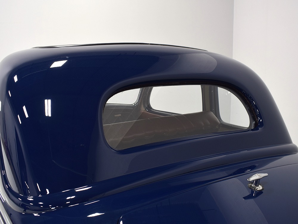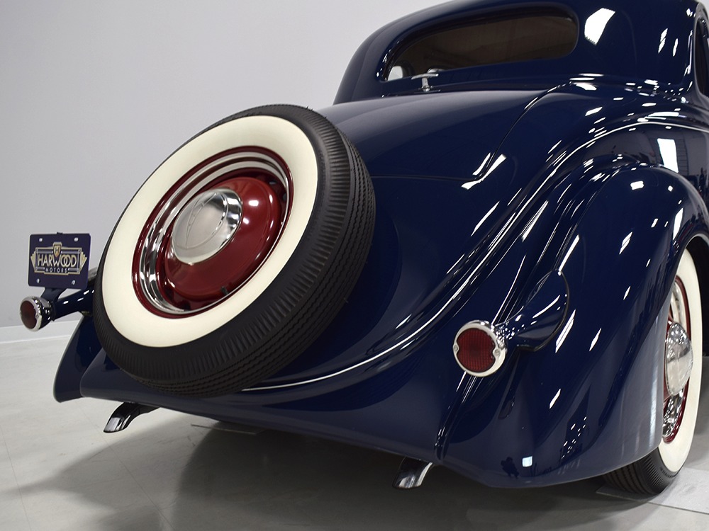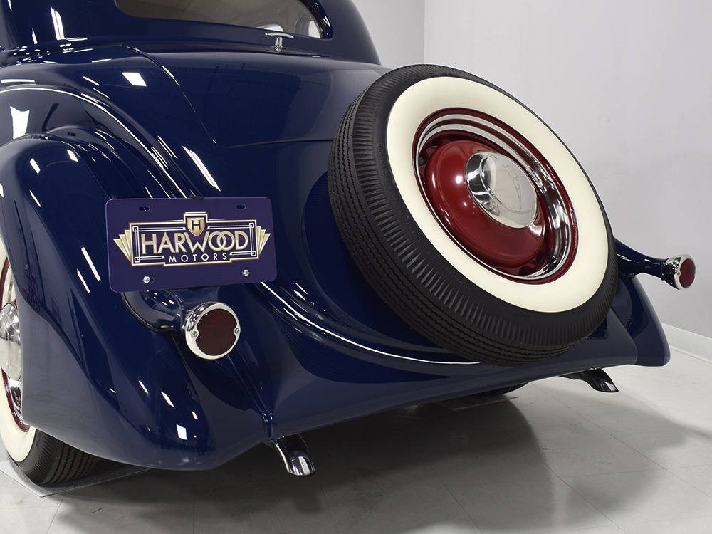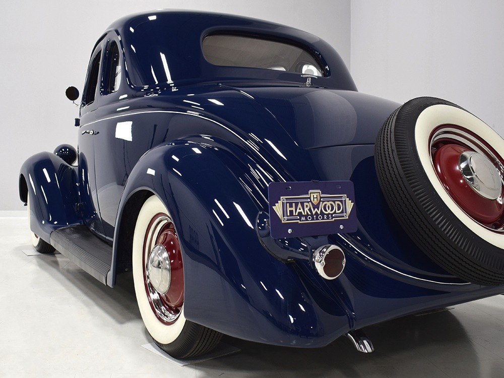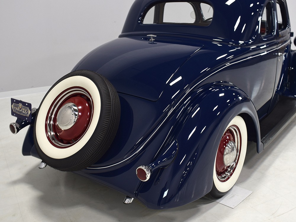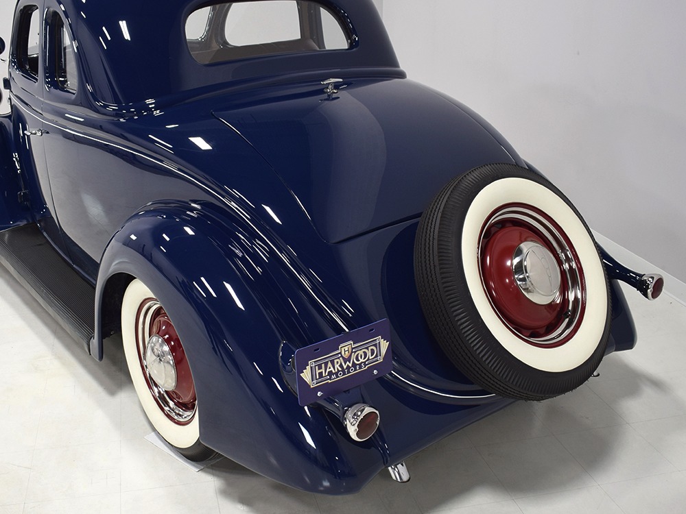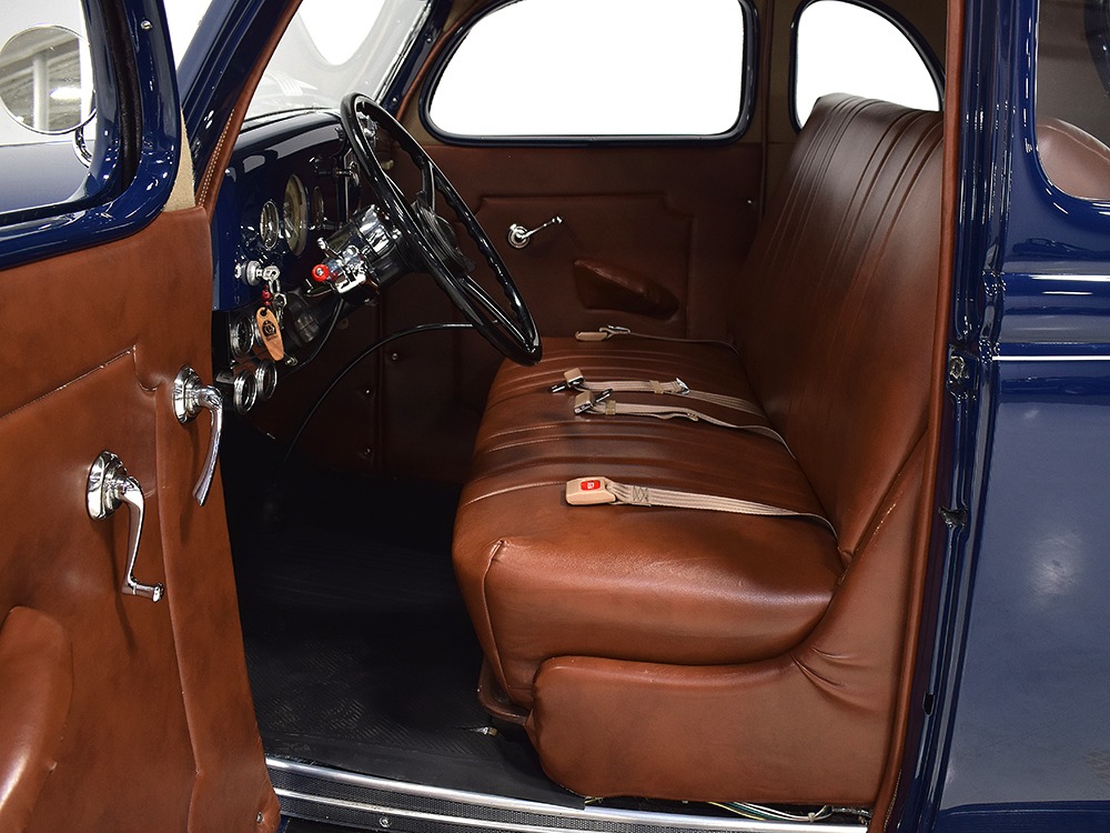 Restored and rebuilt over the course of about eight years, this gorgeous coupe could be called a mild custom. It's not chopped, it's not over-powered, but it does have a few subtle touches that give it a great look. None of the original flathead Ford feel has been erased, it just got streamlined a little bit. The most notable modification is the removal of the rear bumper, and it looks so right that we're surprised that everyone doesn't do it. The grille was painted black to offer a bit of contrast, but the rest appears to be just the way Henry intended. Luscious Washington Blue paint is both traditional and dramatic, just right for attracting attention without looking too obvious about it. Paint and bodywork are extremely good, which you can see just by glancing at the reflections in the body panels. The hood fits beautifully and latches without a lot of effort and both doors snap closed with just gentle pressure. Rumble seat lids (yes, this car has a rumble seat, not a trunk) are particularly problematic, but this one swings up and down easily. All the factory trim is still in place, too, from the streamlined V8 emblem up front to the stylized louvers on the hood to the lovely taillights that are like sculpture all by themselves. We particularly like the fact that they kept the rear-mounted spare, which gives the car that vintage look. A single white pinstripe on the belt molding finishes it off properly. This is a great-looking car!