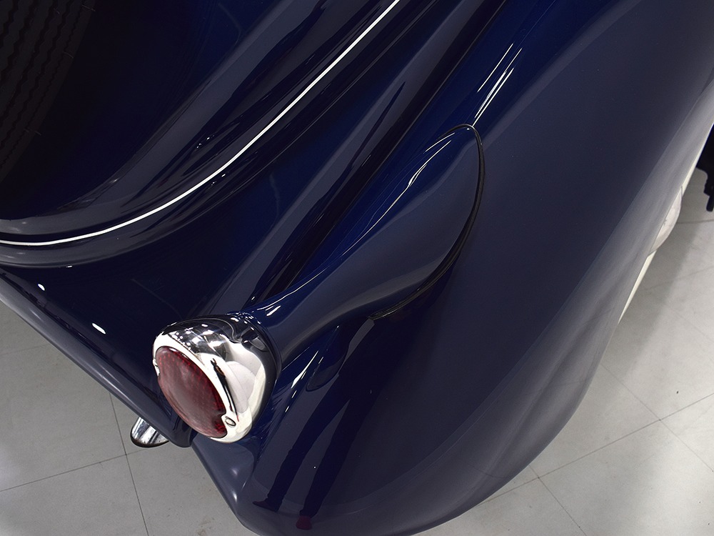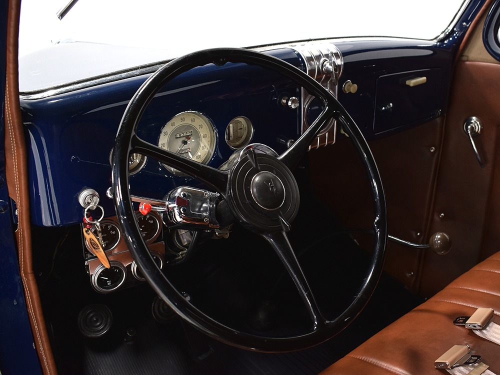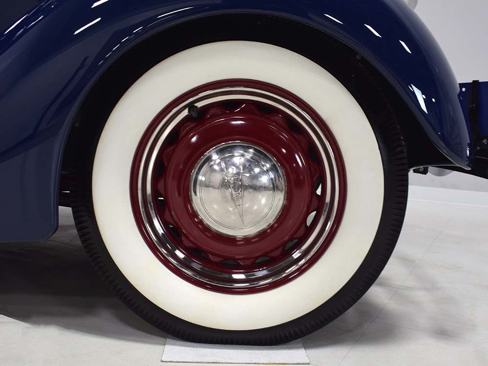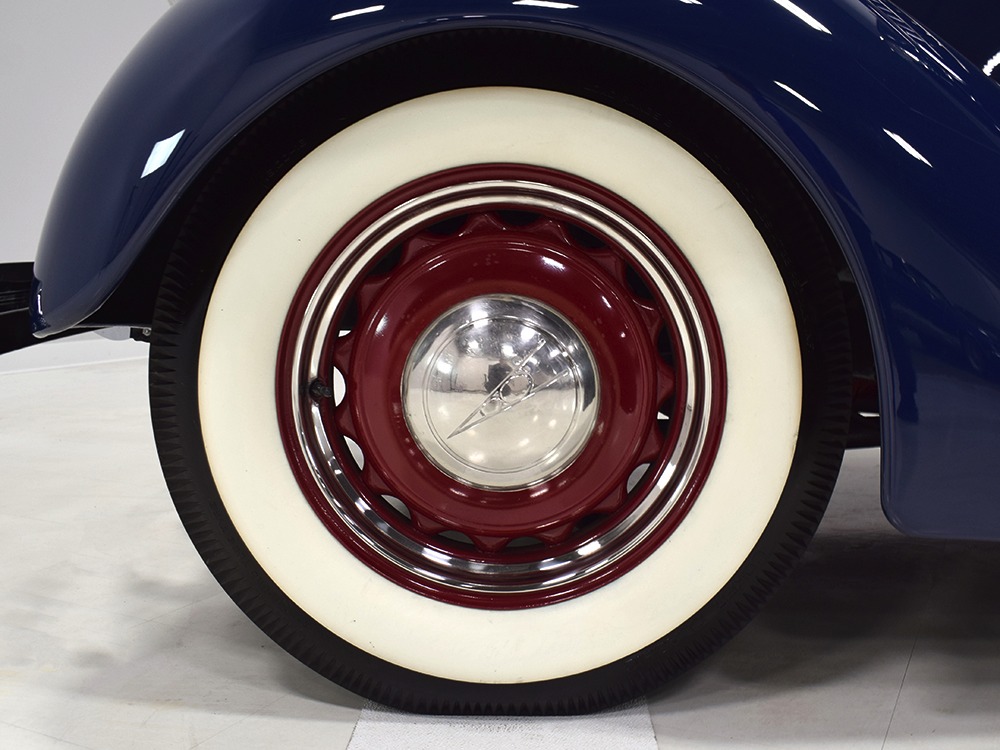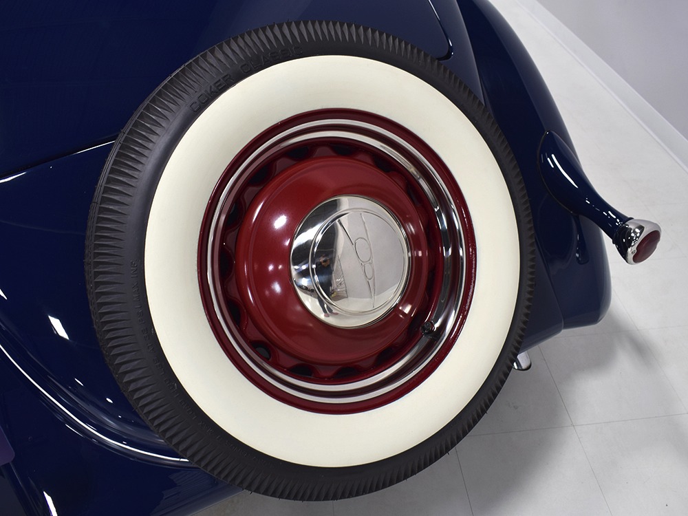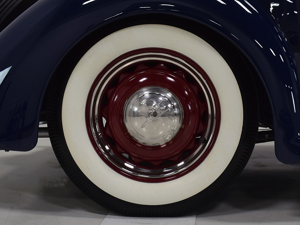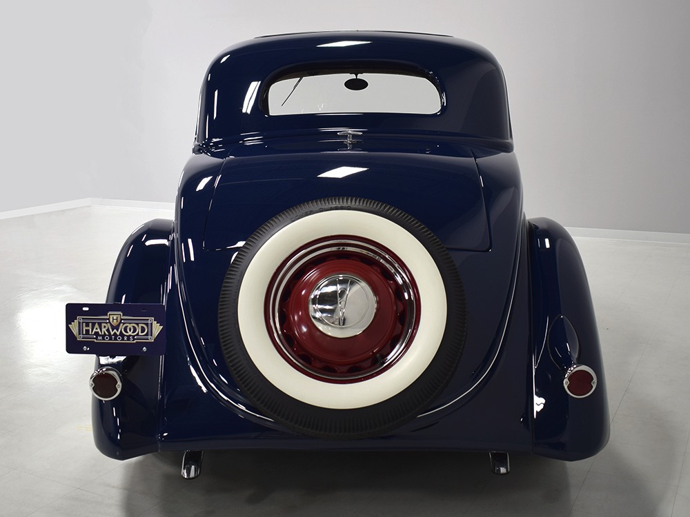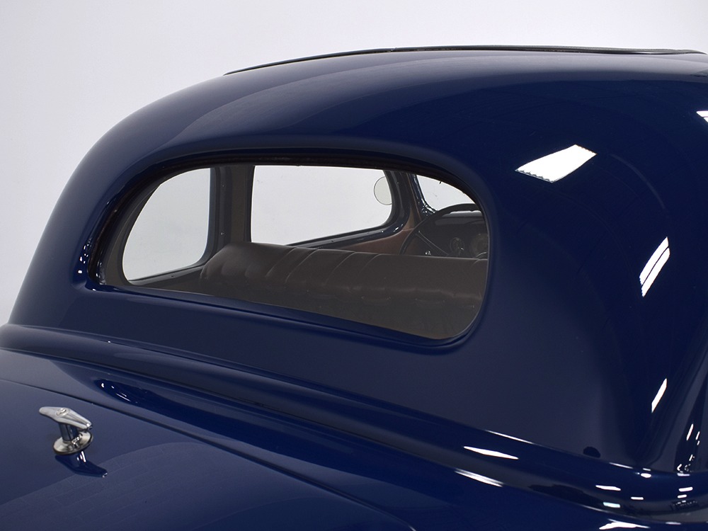 Restored and rebuilt over the course of about eight years, this gorgeous coupe could be called a mild custom. It's not chopped, it's not over-powered, but it does have a few subtle touches that give it a great look. None of the original flathead Ford feel has been erased, it just got streamlined a little bit. The most notable modification is the removal of the rear bumper, and it looks so right that we're surprised that everyone doesn't do it. The grille was painted black to offer a bit of contrast, but the rest appears to be just the way Henry intended. Luscious Washington Blue paint is both traditional and dramatic, just right for attracting attention without looking too obvious about it. Paint and bodywork are extremely good, which you can see just by glancing at the reflections in the body panels. The hood fits beautifully and latches without a lot of effort and both doors snap closed with just gentle pressure. Rumble seat lids (yes, this car has a rumble seat, not a trunk) are particularly problematic, but this one swings up and down easily. All the factory trim is still in place, too, from the streamlined V8 emblem up front to the stylized louvers on the hood to the lovely taillights that are like sculpture all by themselves. We particularly like the fact that they kept the rear-mounted spare, which gives the car that vintage look. A single white pinstripe on the belt molding finishes it off properly. This is a great-looking car!