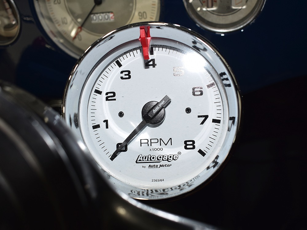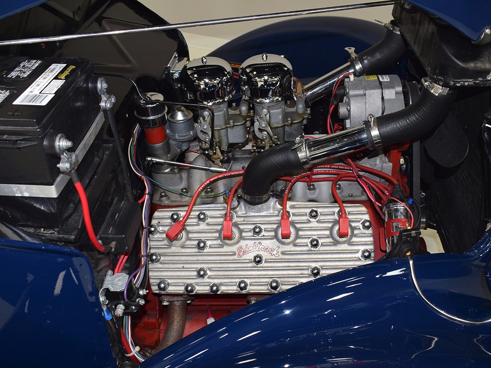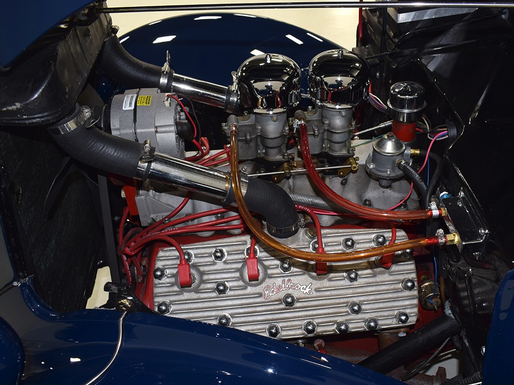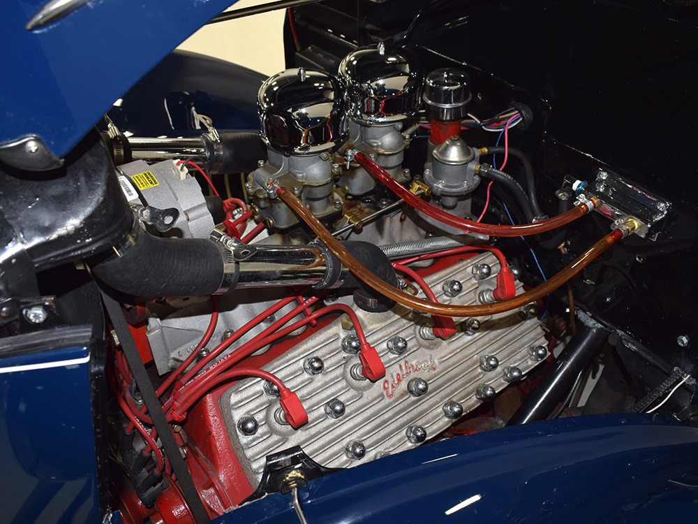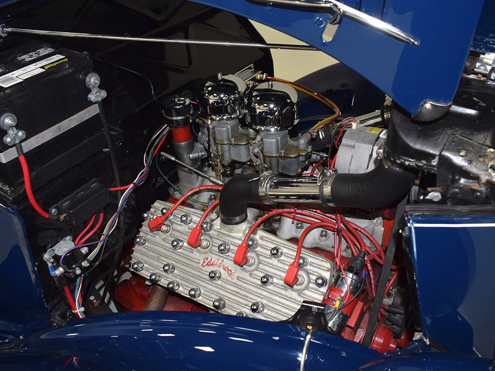 The heart and soul of this coupe is the built flathead V8 living under the hood. Based around a 59AB block and using a 4-inch Mercury crank, it's bigger than its peers and puts out perhaps twice as much horsepower. There's a ¾ race camshaft inside which delivers a nice burbly idle and a wide power curve, with a particular swell of torque as the tach passes by 3000 RPM. Edelbrock aluminum heads and a matching Offenhauser dual carb intake make this flathead breathe better than most, so it never feels like it's straining, even at high RPM. Twin Ford 97 carburetors are a traditional choice and work on a fixed linkage to provide snappy throttle response at just about any speed. You'll note that there's still a mechanical fuel pump, which works just fine even with twice as many mouths to feed, and traditional bell-style air cleaners up top make it look like the 1950s all over again. A modern MSD ignition system lights it up with ease and there's a 12-volt alternator up top making the electricity, so no more dim headlights at night. Red paint on the block is a nice contrast to the blue bodywork and while it has been driven a bit, this is still a great-looking engine compartment.