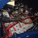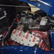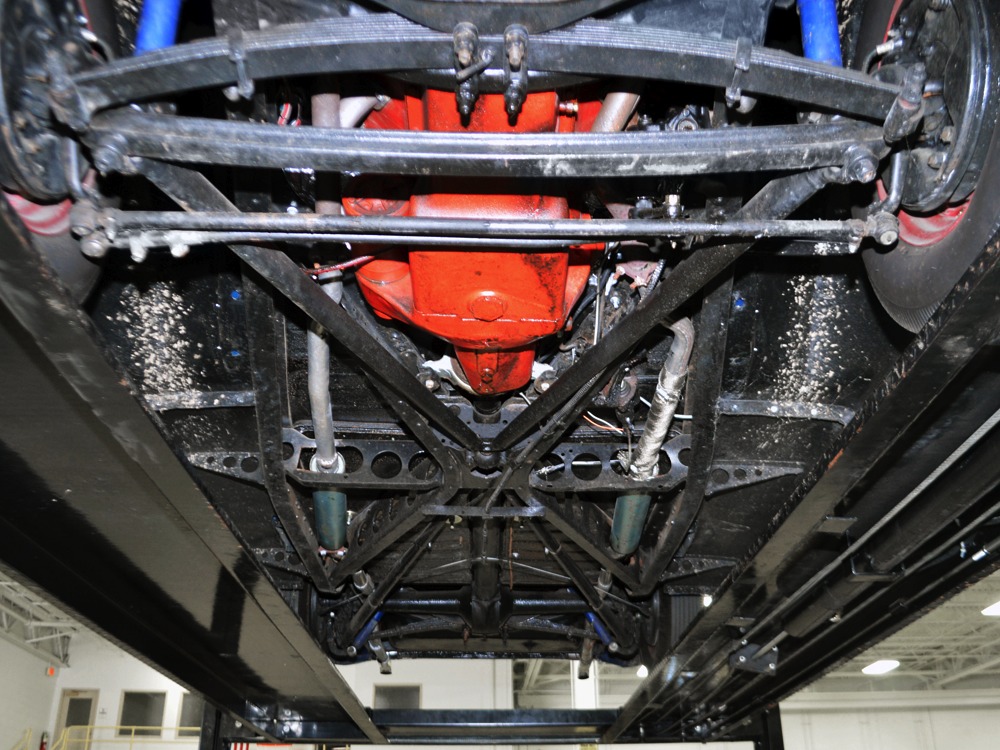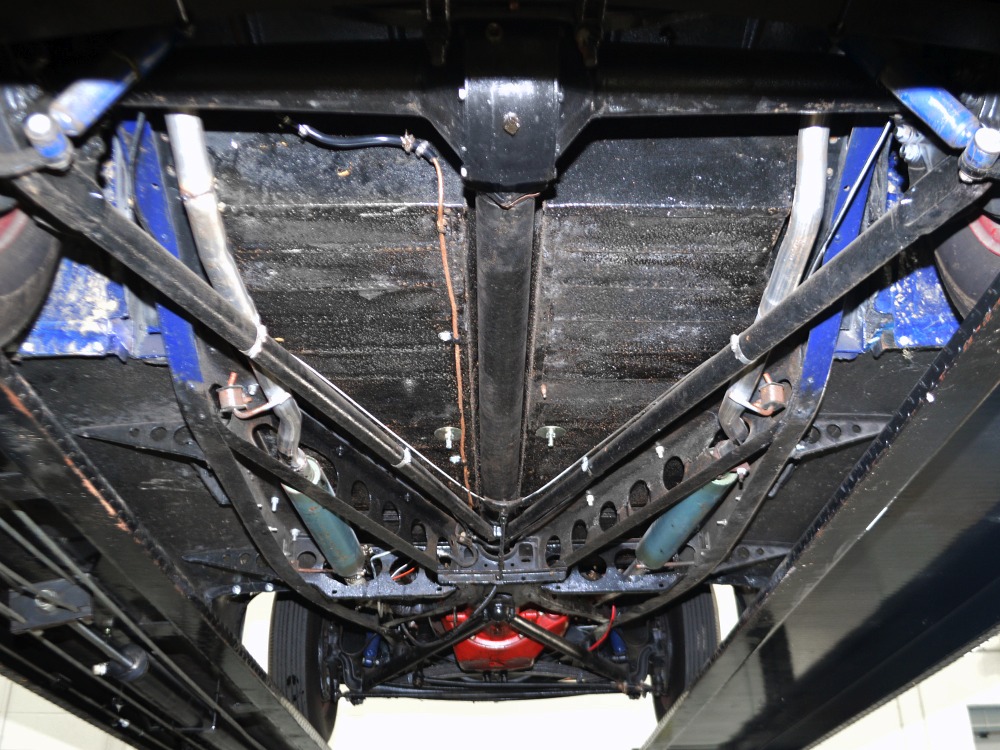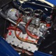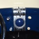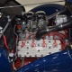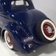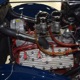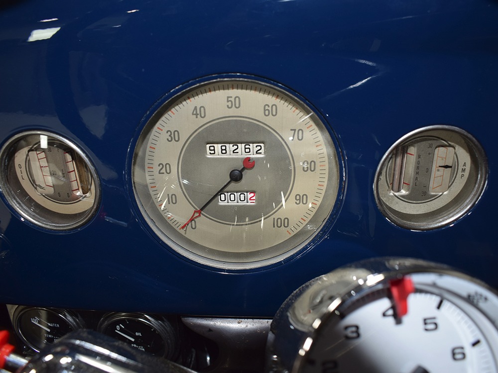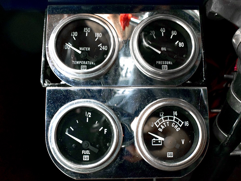 The heart and soul of this coupe is the built flathead V8 living under the hood. Based around a 59AB block and using a 4-inch Mercury crank, it's bigger than its peers and puts out perhaps twice as much horsepower. There's a ¾ race camshaft inside which delivers a nice burbly idle and a wide power curve, with a particular swell of torque as the tach passes by 3000 RPM. Edelbrock aluminum heads and a matching Offenhauser dual carb intake make this flathead breathe better than most, so it never feels like it's straining, even at high RPM. Twin Ford 97 carburetors are a traditional choice and work on a fixed linkage to provide snappy throttle response at just about any speed. You'll note that there's still a mechanical fuel pump, which works just fine even with twice as many mouths to feed, and traditional bell-style air cleaners up top make it look like the 1950s all over again. A modern MSD ignition system lights it up with ease and there's a 12-volt alternator up top making the electricity, so no more dim headlights at night. Red paint on the block is a nice contrast to the blue bodywork and while it has been driven a bit, this is still a great-looking engine compartment.