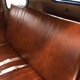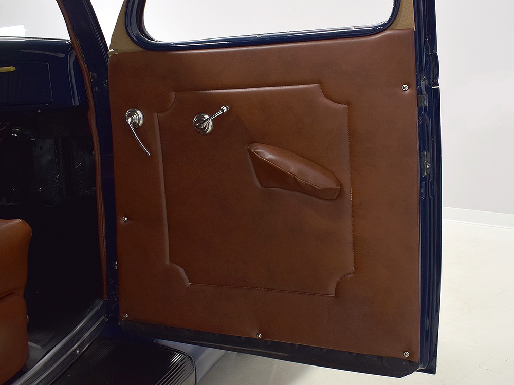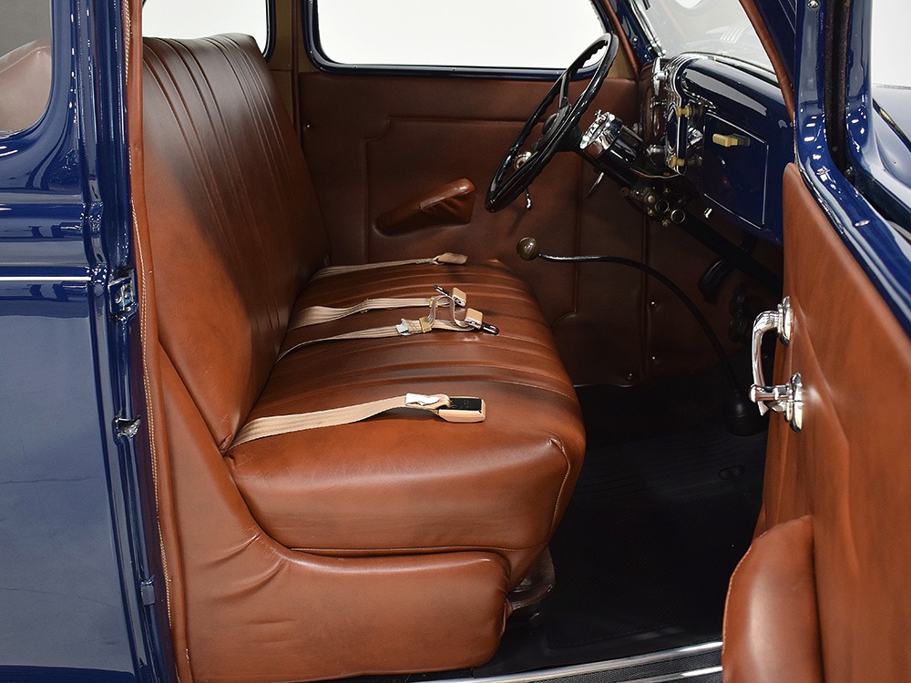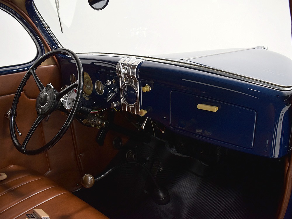 The interior was likewise properly restored with just a few custom tweaks. Brown leatherette upholstery on the original bench looks great and replicates the original patterns. The same is true for the door panels, which also feature painted garnish moldings and new bright handles and knobs. A rubber mat protects the floor, which was how Ford did it (remember that this was a working man's car) in the mid-30s. All the factory gauges are still in the dash and most are still working, although with a 12-volt conversion, a quartet of auxiliary dials were added underneath to supervise the engine. The big steering wheel makes it easy to wrangle the car around, even with unassisted steering, and the long shift lever really is a joy to run through the gears. Modern turn signals were strapped onto the column, as was a tachometer, but they wisely eschewed installing an overpowered stereo system and chose to let the smooth-talking V8 provide the entertainment. The rear window cranks down both for pleasing ventilation and to provide contact with the passengers in the rumble seat, which is equally well finished.