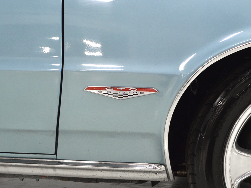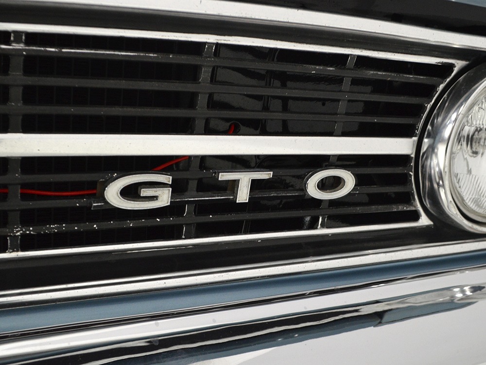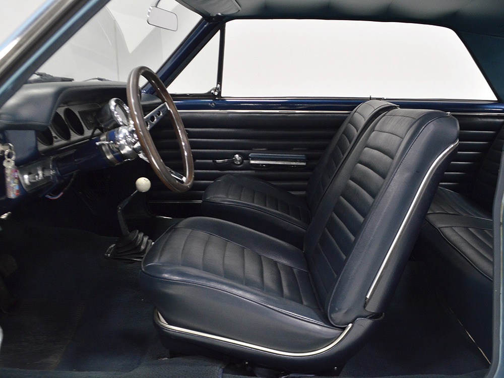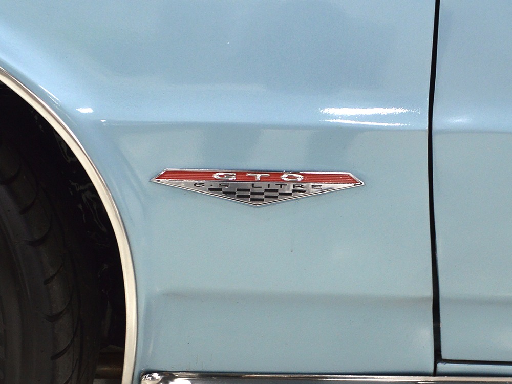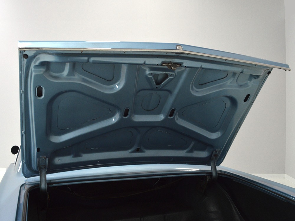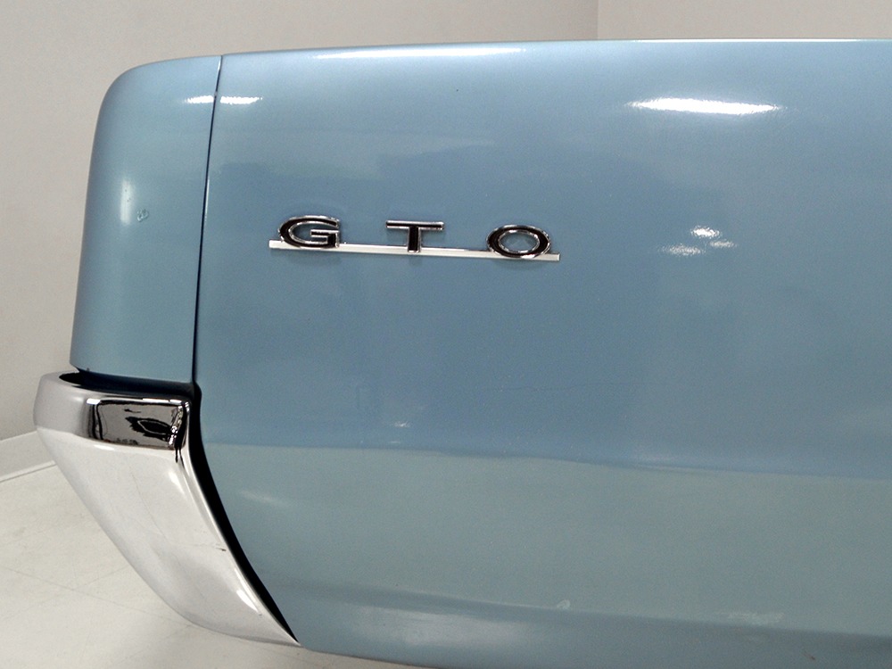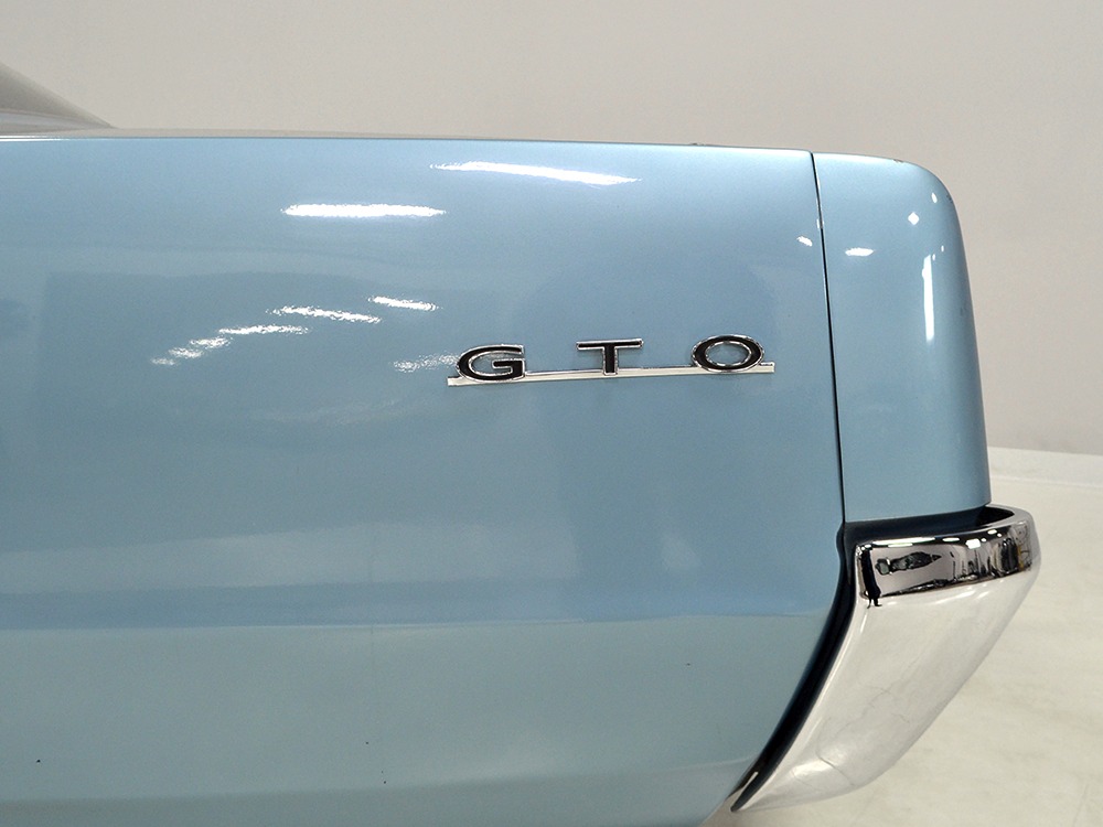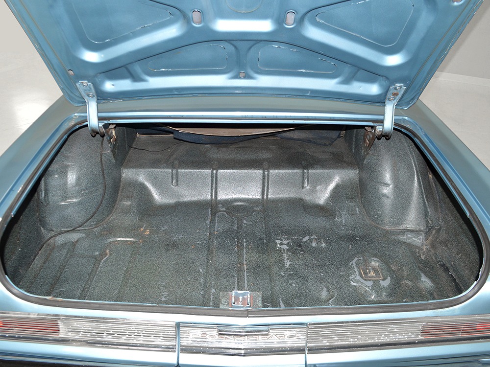 The interior has been recently restored to factory specs using reproduction seat covers in the original code 215 dark blue vinyl. It’s minimalist, but that’s the essence of the GTO’s performance attitude—looking good while going fast. Patterns and materials are correct throughout and the wood-rimmed wheel warms things up a bit. The Muncie M21 close-ratio 4-speed manual transmission is topped by a Hurst shifter and cue ball knob and there’s a vintage Sun tachometer mounted on the steering column. The gauges are in original condition, all framed by the engine-turned dash applique that has represented performance since the days of Duesenberg and Bugatti. At some point a Kenwood AM/FM/cassette stereo has been retrofitted in the dash and it powers a set of speakers on the rear package shelf. A newer dash pad tidies up the top of the instrument panel and the rest of the dash has been painted dark blue to contrast with the lighter bodywork. The back seat looks completely unused and the trunk is extremely solid and finished in factory spatter paint.