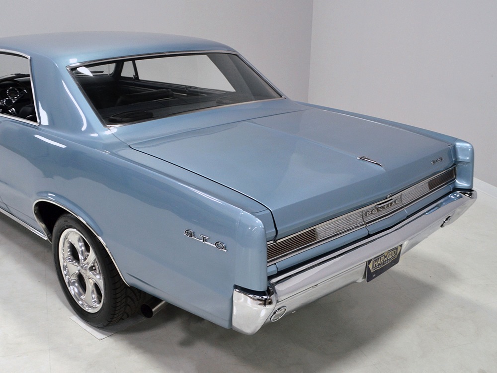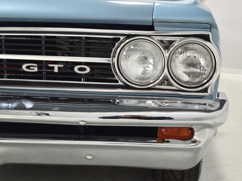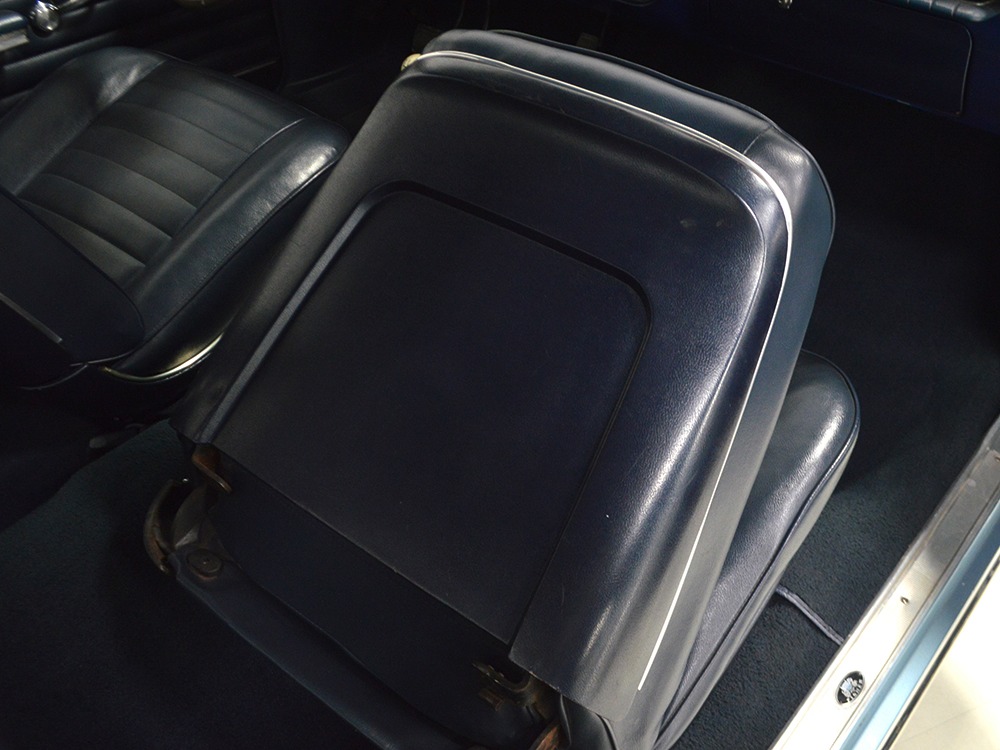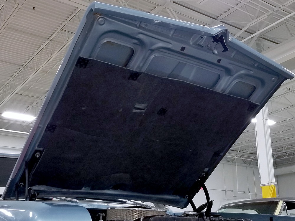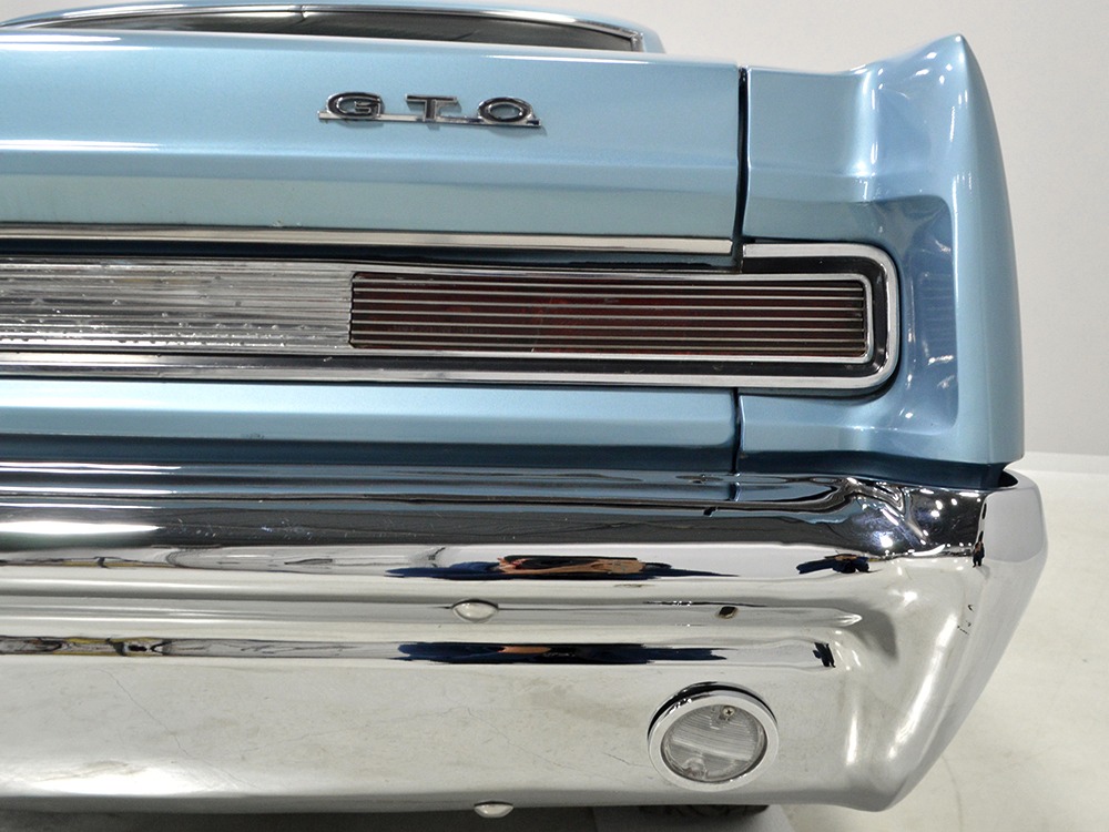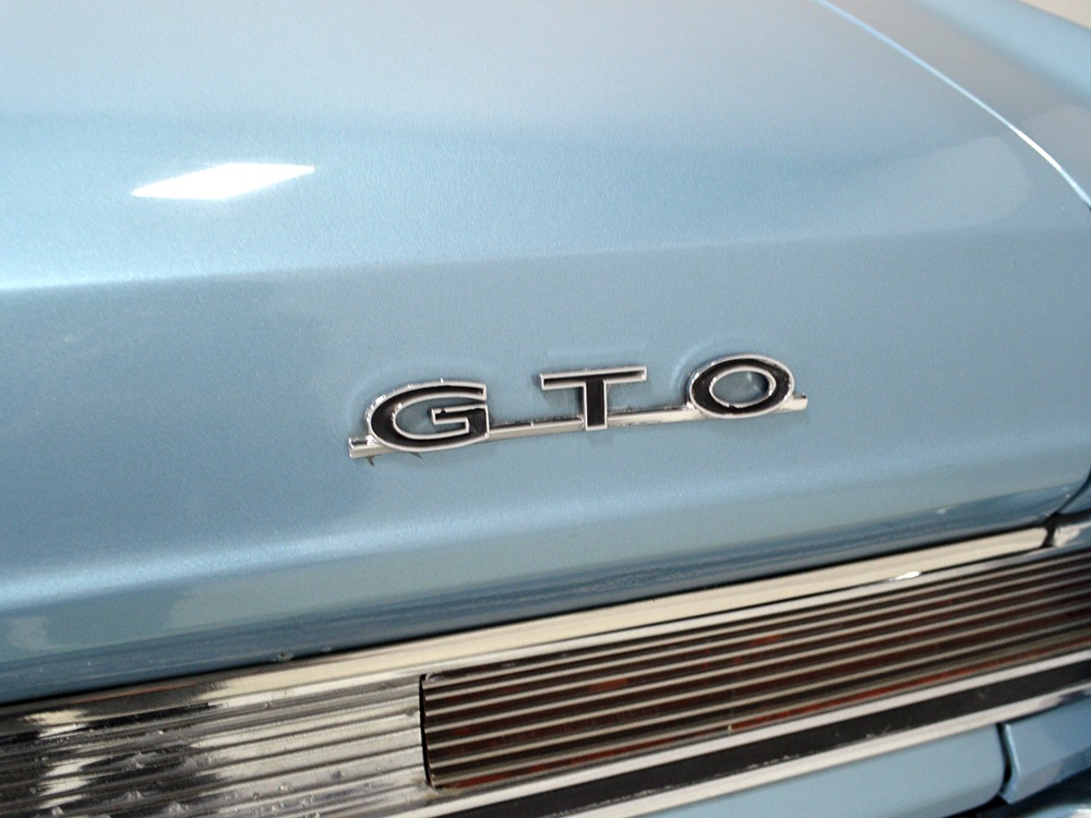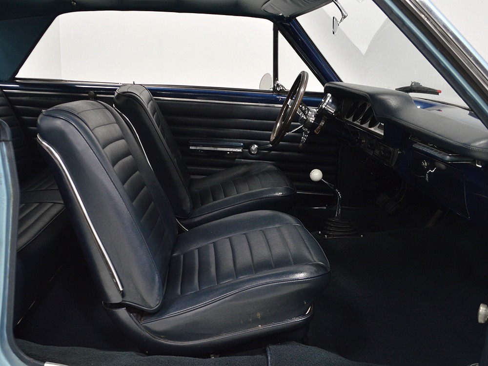 The interior has been recently restored to factory specs using reproduction seat covers in the original code 215 dark blue vinyl. It’s minimalist, but that’s the essence of the GTO’s performance attitude—looking good while going fast. Patterns and materials are correct throughout and the wood-rimmed wheel warms things up a bit. The Muncie M21 close-ratio 4-speed manual transmission is topped by a Hurst shifter and cue ball knob and there’s a vintage Sun tachometer mounted on the steering column. The gauges are in original condition, all framed by the engine-turned dash applique that has represented performance since the days of Duesenberg and Bugatti. At some point a Kenwood AM/FM/cassette stereo has been retrofitted in the dash and it powers a set of speakers on the rear package shelf. A newer dash pad tidies up the top of the instrument panel and the rest of the dash has been painted dark blue to contrast with the lighter bodywork. The back seat looks completely unused and the trunk is extremely solid and finished in factory spatter paint.