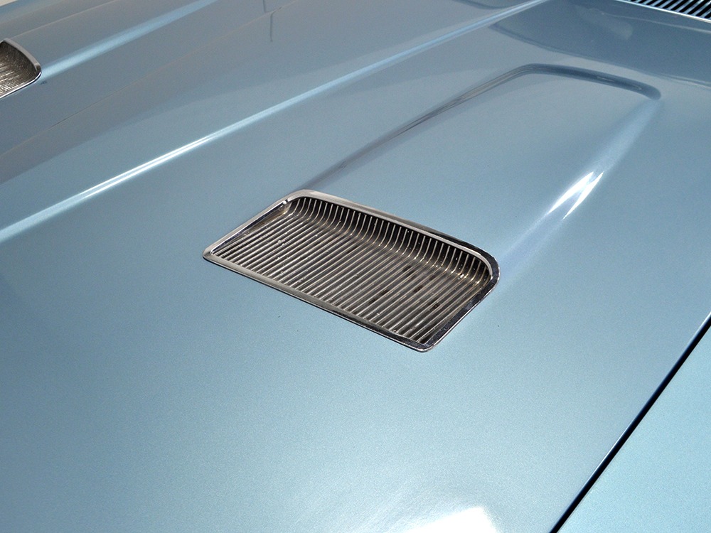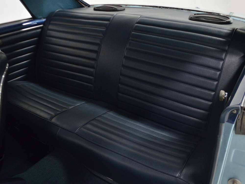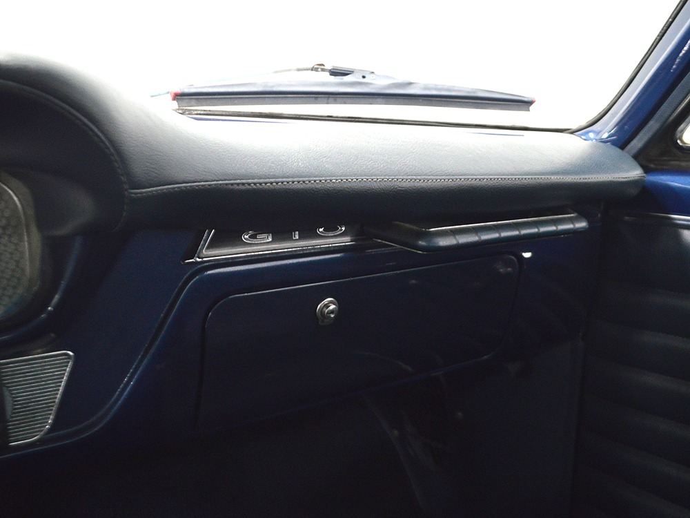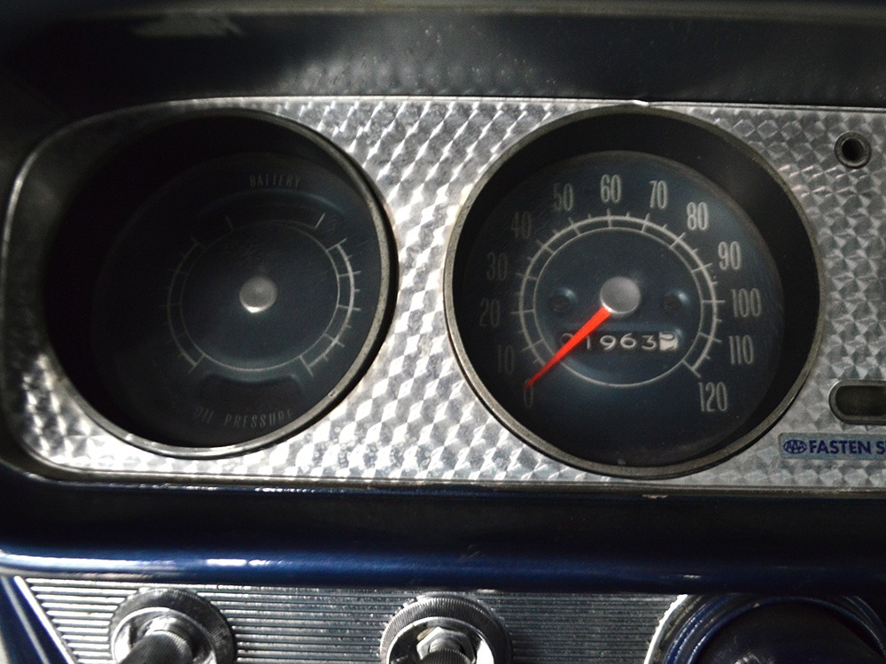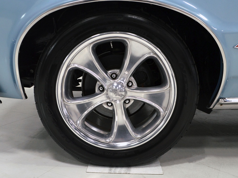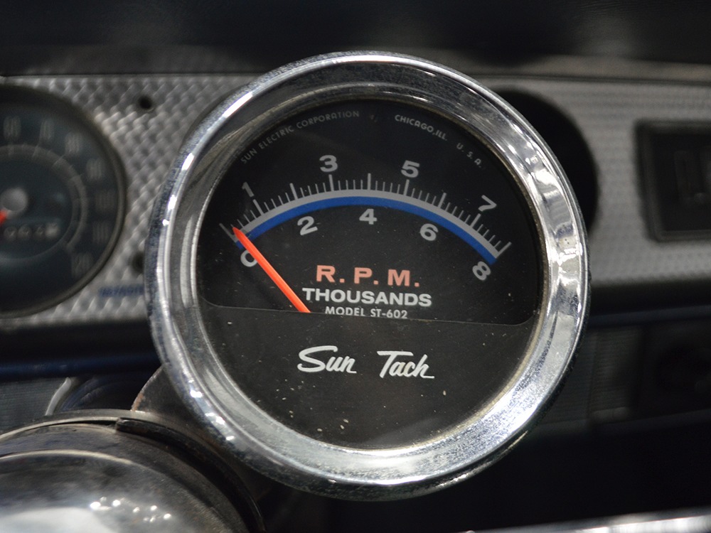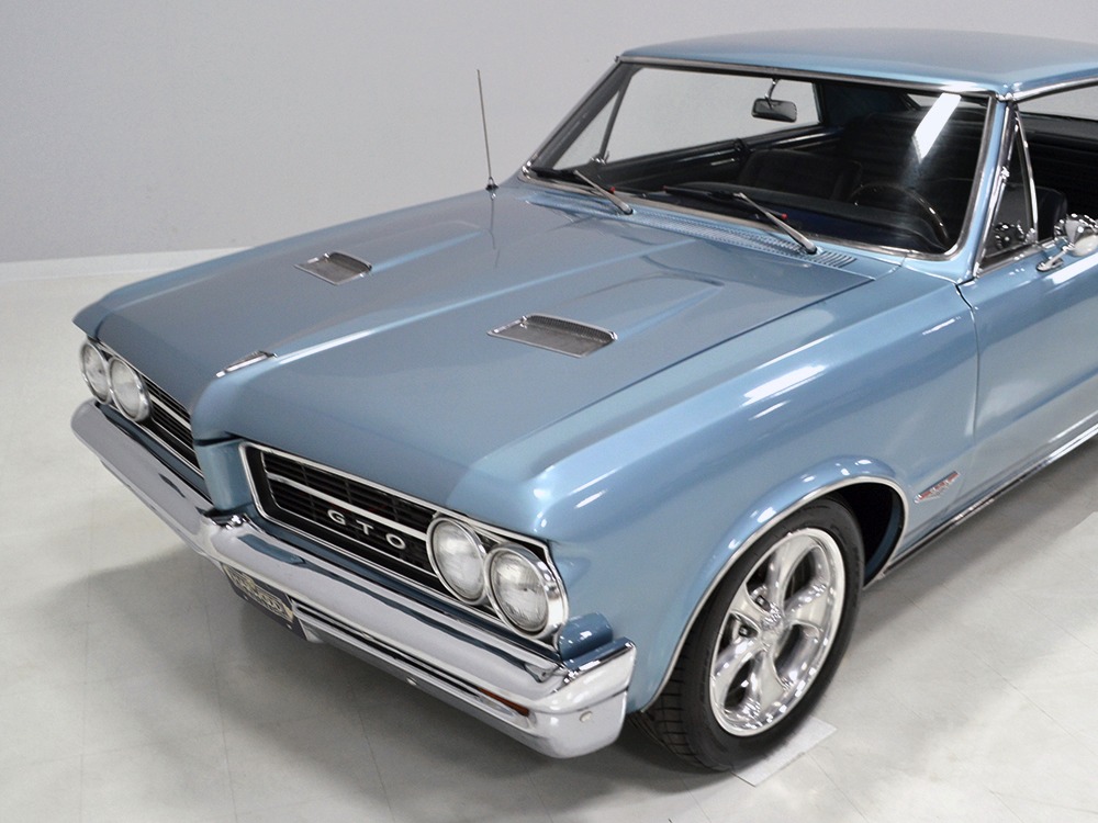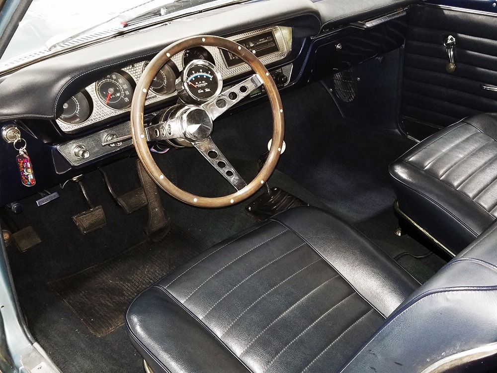 The interior has been recently restored to factory specs using reproduction seat covers in the original code 215 dark blue vinyl. It’s minimalist, but that’s the essence of the GTO’s performance attitude—looking good while going fast. Patterns and materials are correct throughout and the wood-rimmed wheel warms things up a bit. The Muncie M21 close-ratio 4-speed manual transmission is topped by a Hurst shifter and cue ball knob and there’s a vintage Sun tachometer mounted on the steering column. The gauges are in original condition, all framed by the engine-turned dash applique that has represented performance since the days of Duesenberg and Bugatti. At some point a Kenwood AM/FM/cassette stereo has been retrofitted in the dash and it powers a set of speakers on the rear package shelf. A newer dash pad tidies up the top of the instrument panel and the rest of the dash has been painted dark blue to contrast with the lighter bodywork. The back seat looks completely unused and the trunk is extremely solid and finished in factory spatter paint.