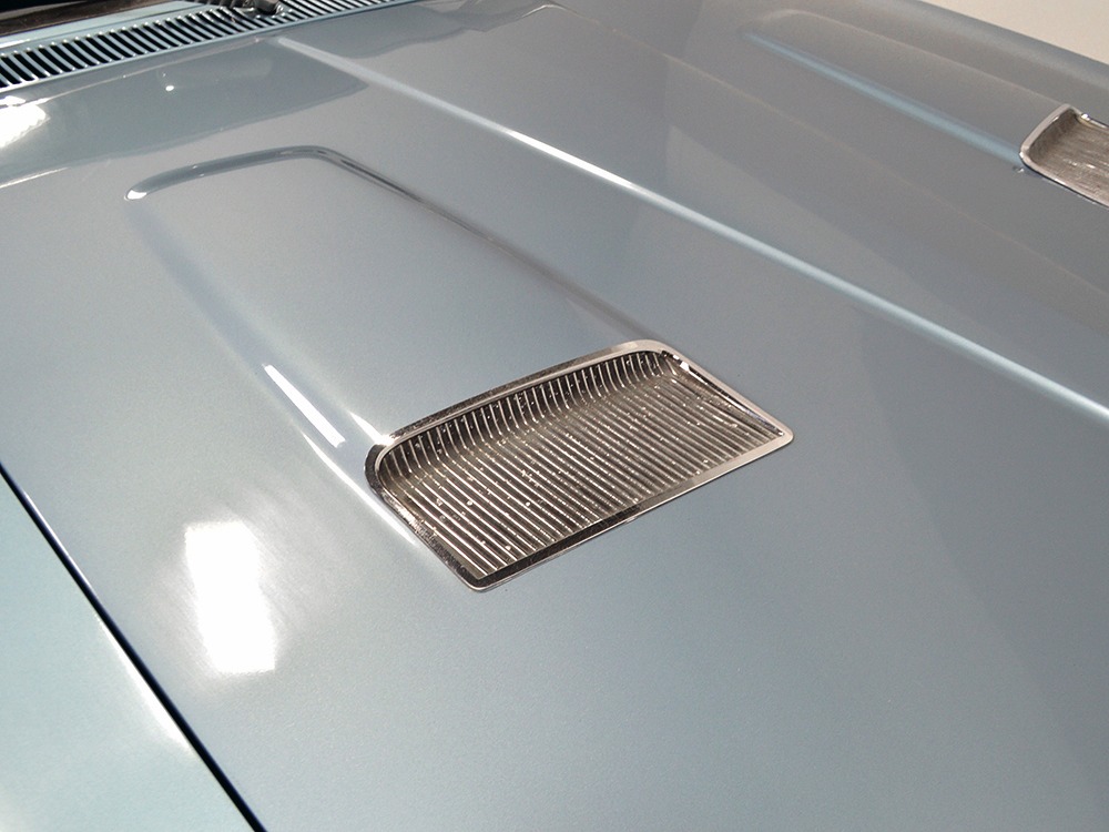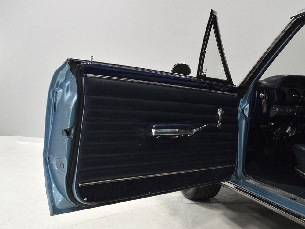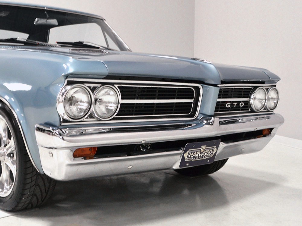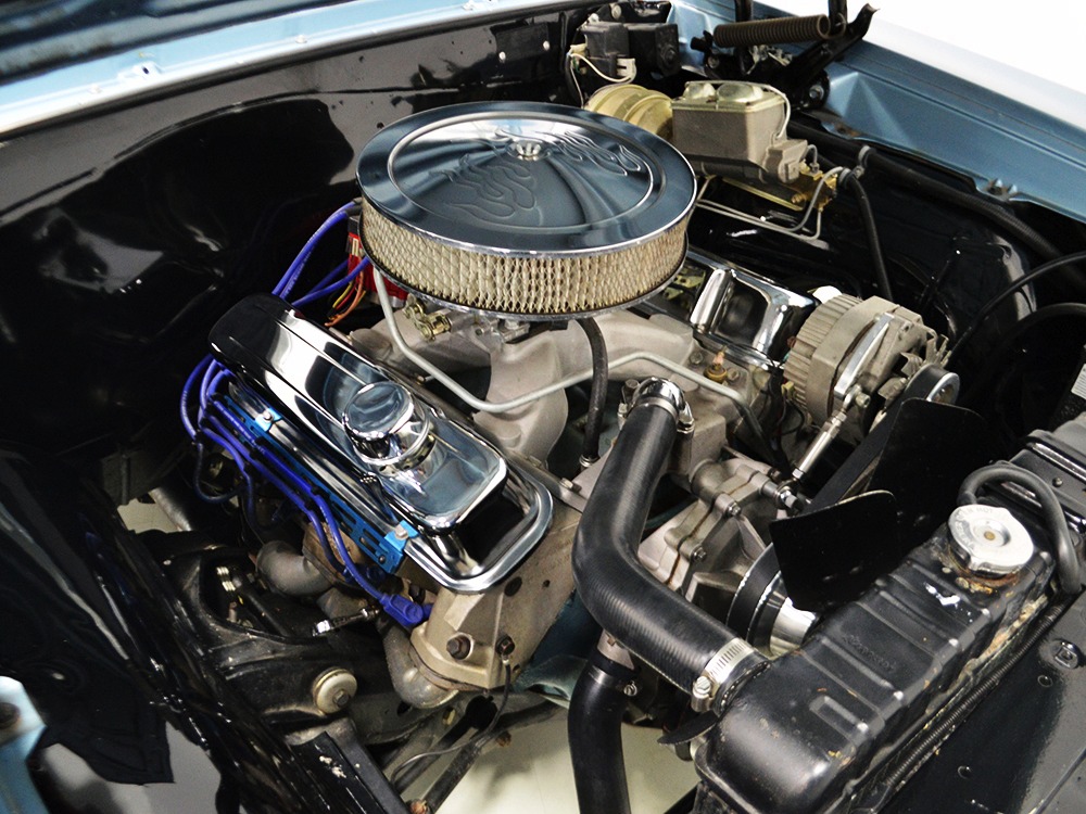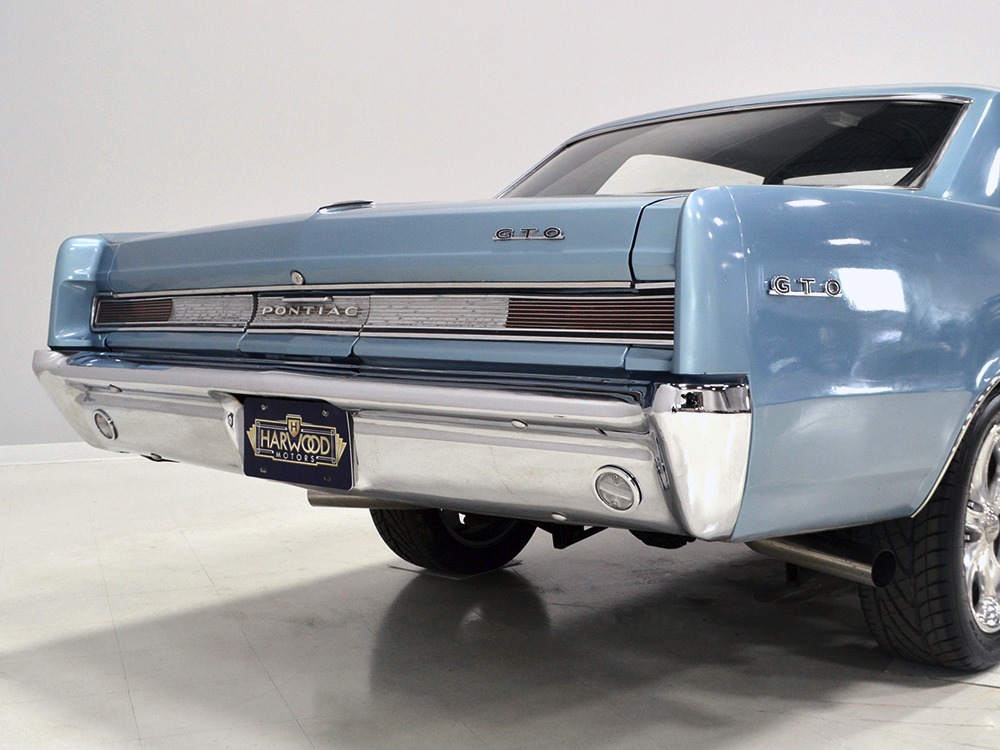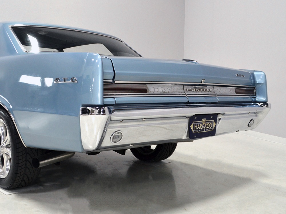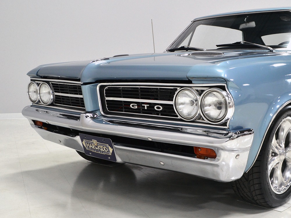 The interior has been recently restored to factory specs using reproduction seat covers in the original code 215 dark blue vinyl. It’s minimalist, but that’s the essence of the GTO’s performance attitude—looking good while going fast. Patterns and materials are correct throughout and the wood-rimmed wheel warms things up a bit. The Muncie M21 close-ratio 4-speed manual transmission is topped by a Hurst shifter and cue ball knob and there’s a vintage Sun tachometer mounted on the steering column. The gauges are in original condition, all framed by the engine-turned dash applique that has represented performance since the days of Duesenberg and Bugatti. At some point a Kenwood AM/FM/cassette stereo has been retrofitted in the dash and it powers a set of speakers on the rear package shelf. A newer dash pad tidies up the top of the instrument panel and the rest of the dash has been painted dark blue to contrast with the lighter bodywork. The back seat looks completely unused and the trunk is extremely solid and finished in factory spatter paint.