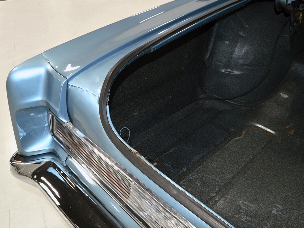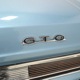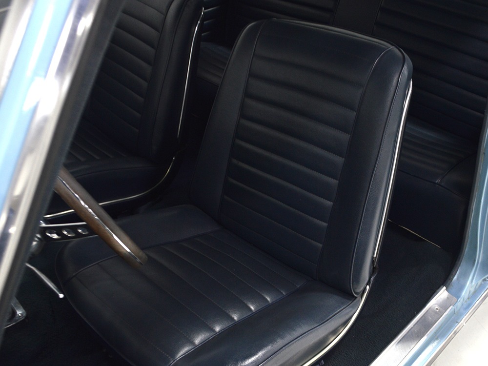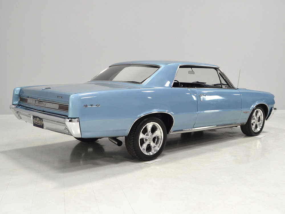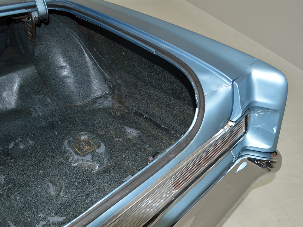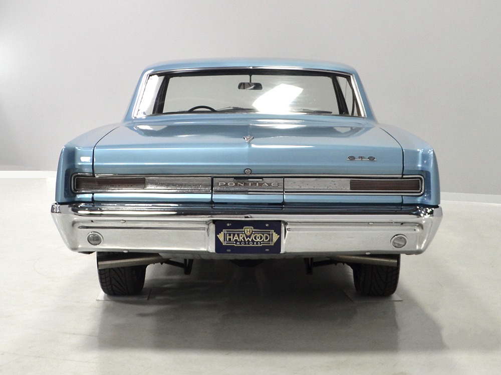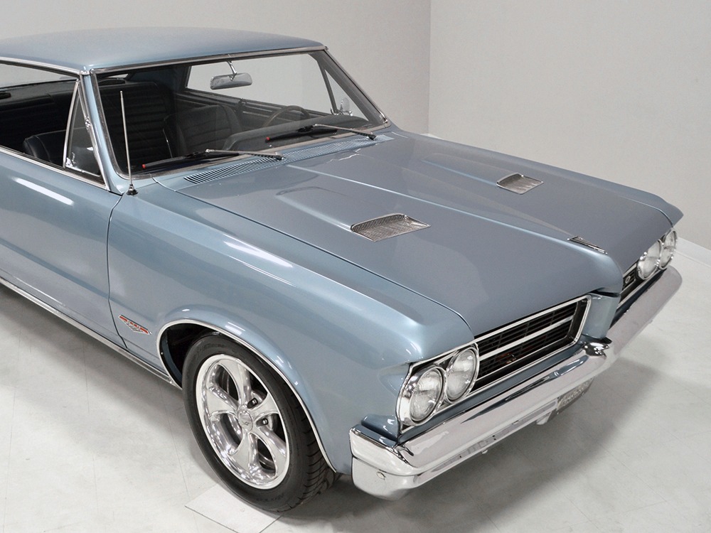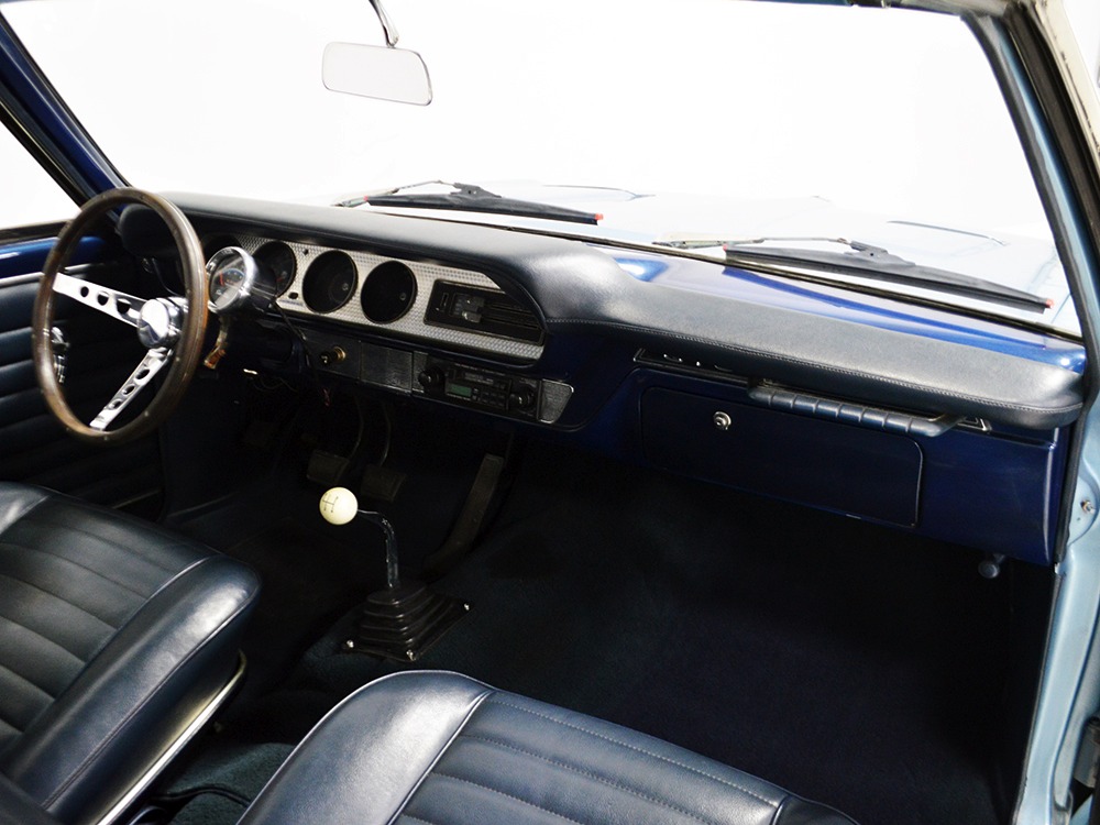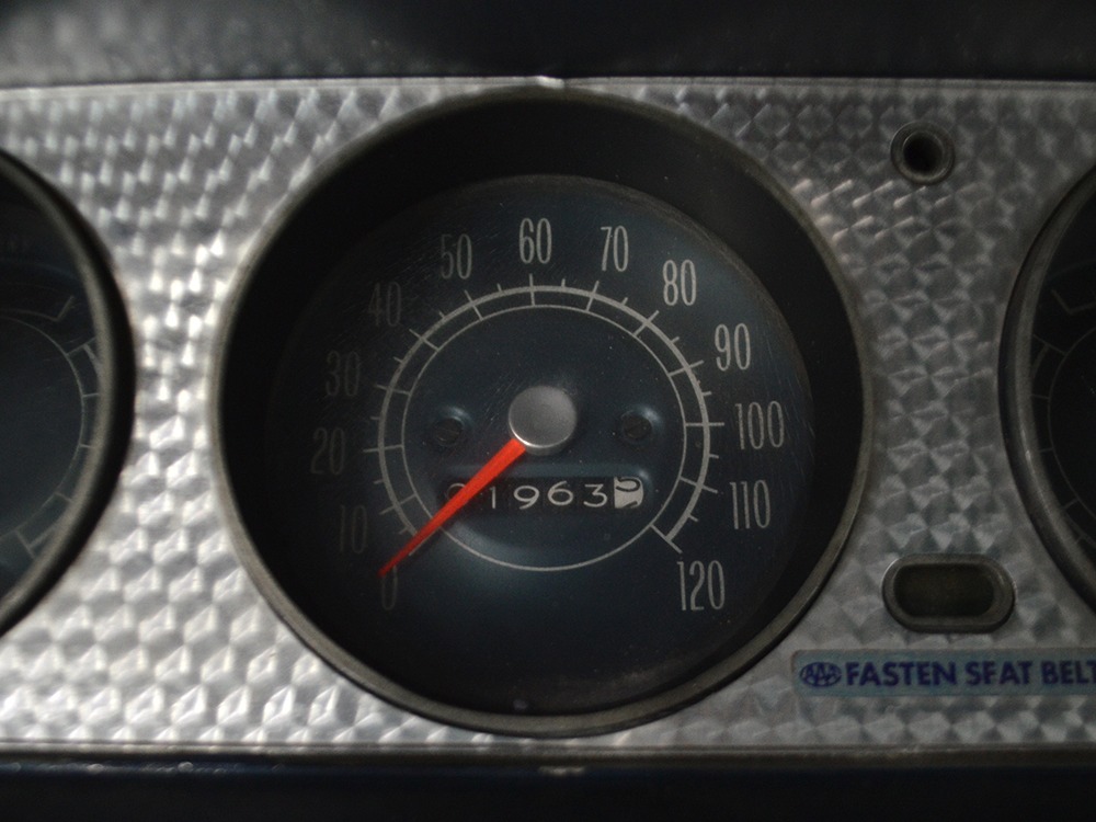 The interior has been recently restored to factory specs using reproduction seat covers in the original code 215 dark blue vinyl. It’s minimalist, but that’s the essence of the GTO’s performance attitude—looking good while going fast. Patterns and materials are correct throughout and the wood-rimmed wheel warms things up a bit. The Muncie M21 close-ratio 4-speed manual transmission is topped by a Hurst shifter and cue ball knob and there’s a vintage Sun tachometer mounted on the steering column. The gauges are in original condition, all framed by the engine-turned dash applique that has represented performance since the days of Duesenberg and Bugatti. At some point a Kenwood AM/FM/cassette stereo has been retrofitted in the dash and it powers a set of speakers on the rear package shelf. A newer dash pad tidies up the top of the instrument panel and the rest of the dash has been painted dark blue to contrast with the lighter bodywork. The back seat looks completely unused and the trunk is extremely solid and finished in factory spatter paint.