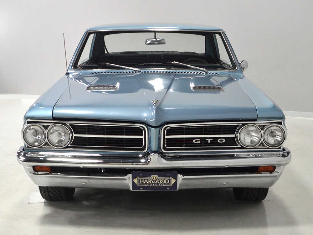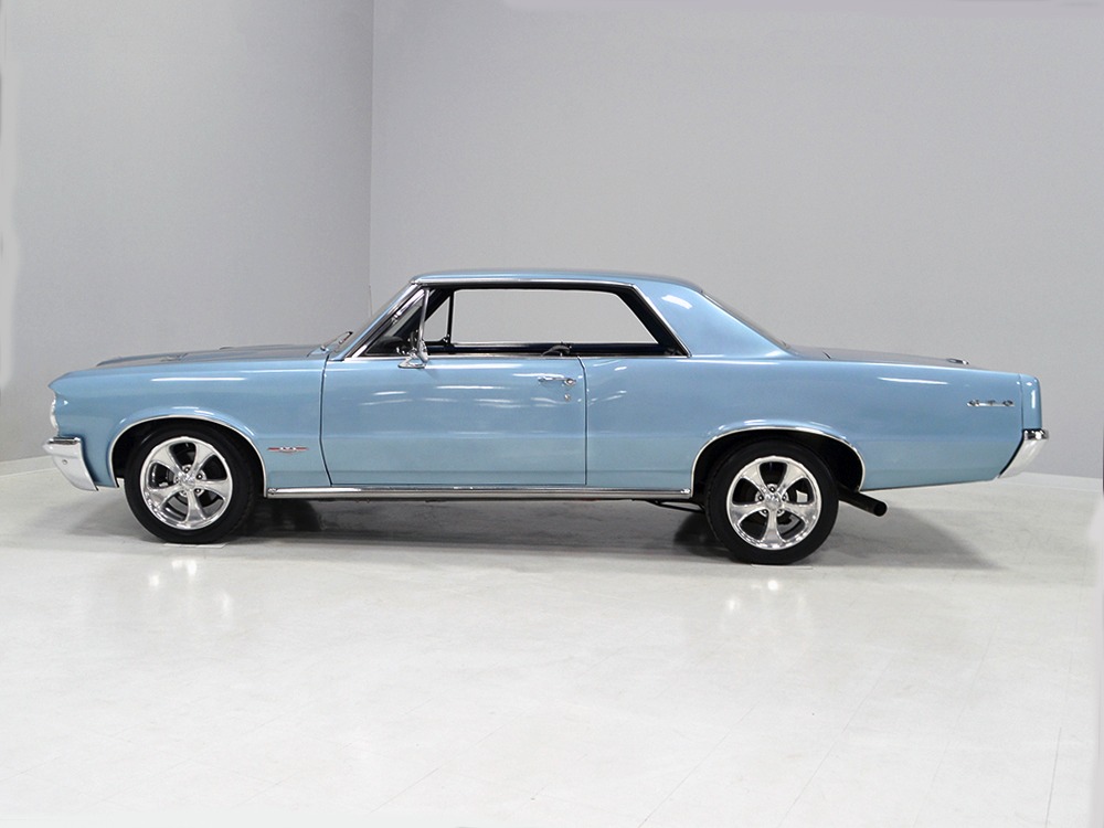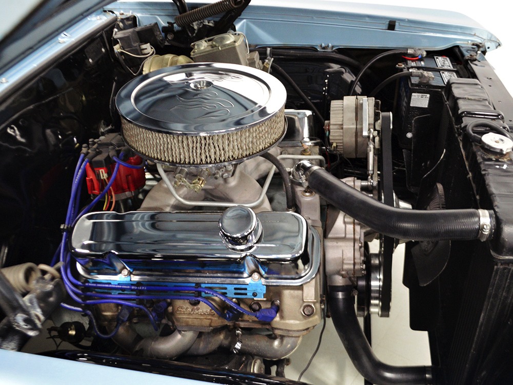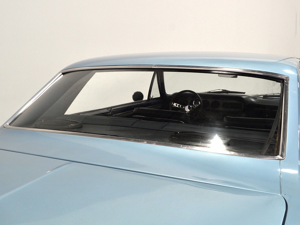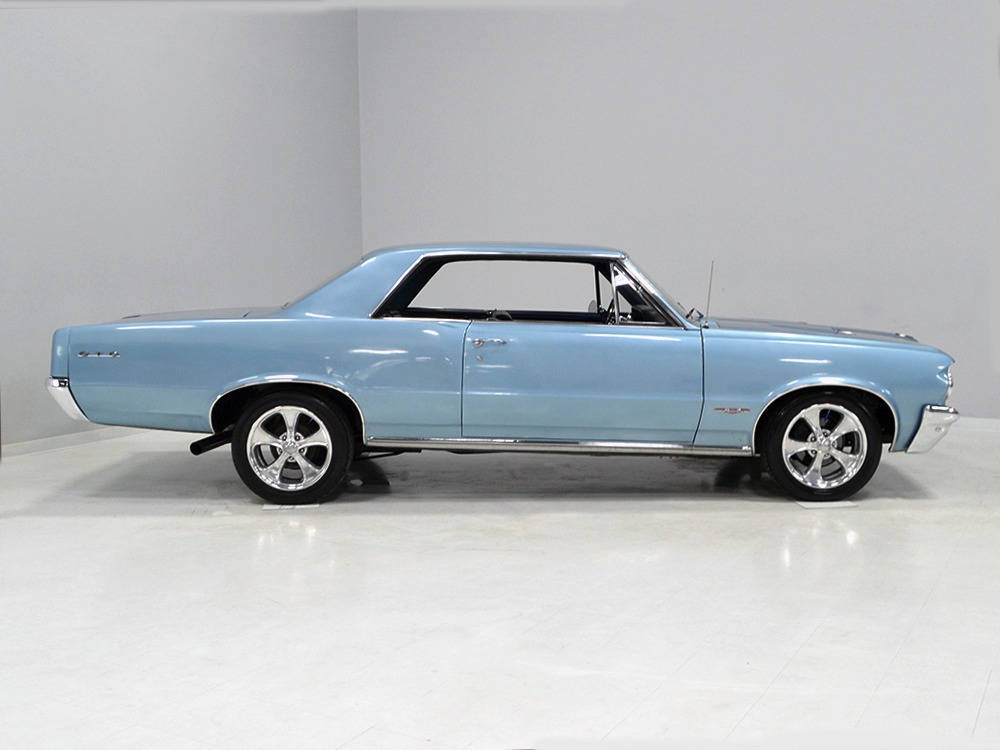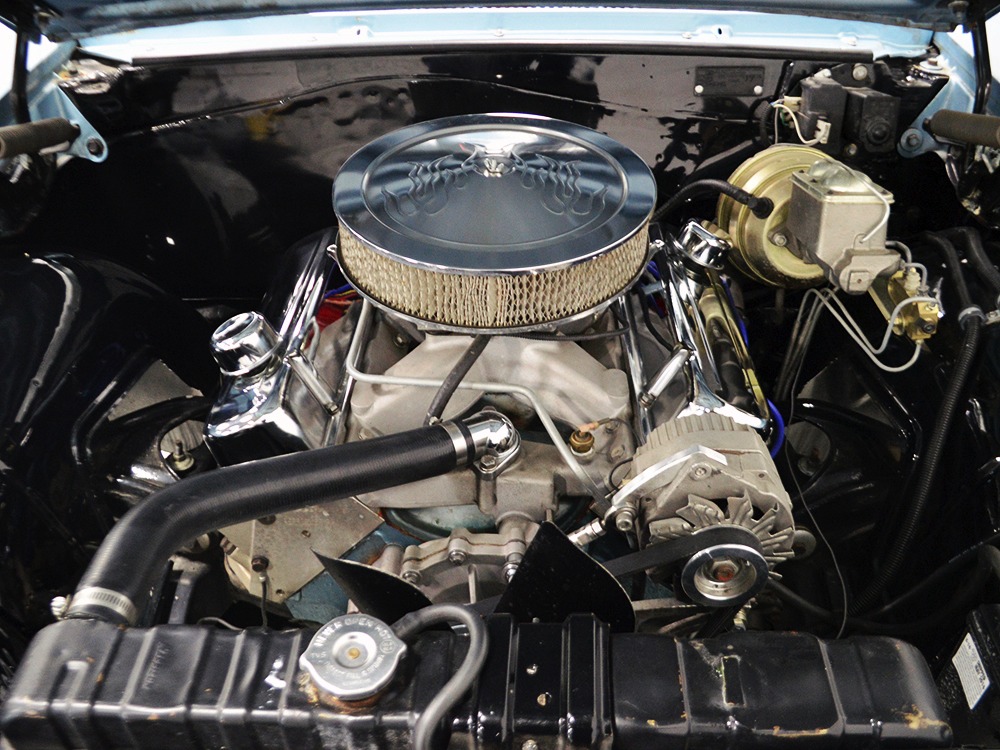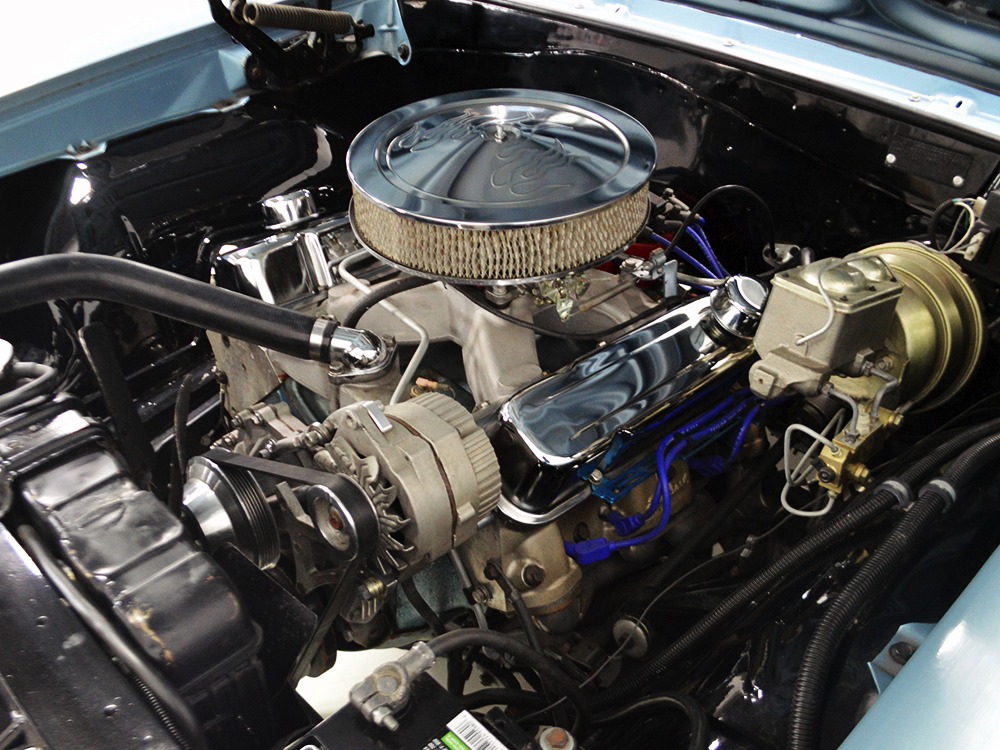The interior has been recently restored to factory specs using reproduction seat covers in the original code 215 dark blue vinyl. It’s minimalist, but that’s the essence of the GTO’s performance attitude—looking good while going fast. Patterns and materials are correct throughout and the wood-rimmed wheel warms things up a bit. The Muncie M21 close-ratio 4-speed manual transmission is topped by a Hurst shifter and cue ball knob and there’s a vintage Sun tachometer mounted on the steering column. The gauges are in original condition, all framed by the engine-turned dash applique that has represented performance since the days of Duesenberg and Bugatti. At some point a Kenwood AM/FM/cassette stereo has been retrofitted in the dash and it powers a set of speakers on the rear package shelf. A newer dash pad tidies up the top of the instrument panel and the rest of the dash has been painted dark blue to contrast with the lighter bodywork. The back seat looks completely unused and the trunk is extremely solid and finished in factory spatter paint.