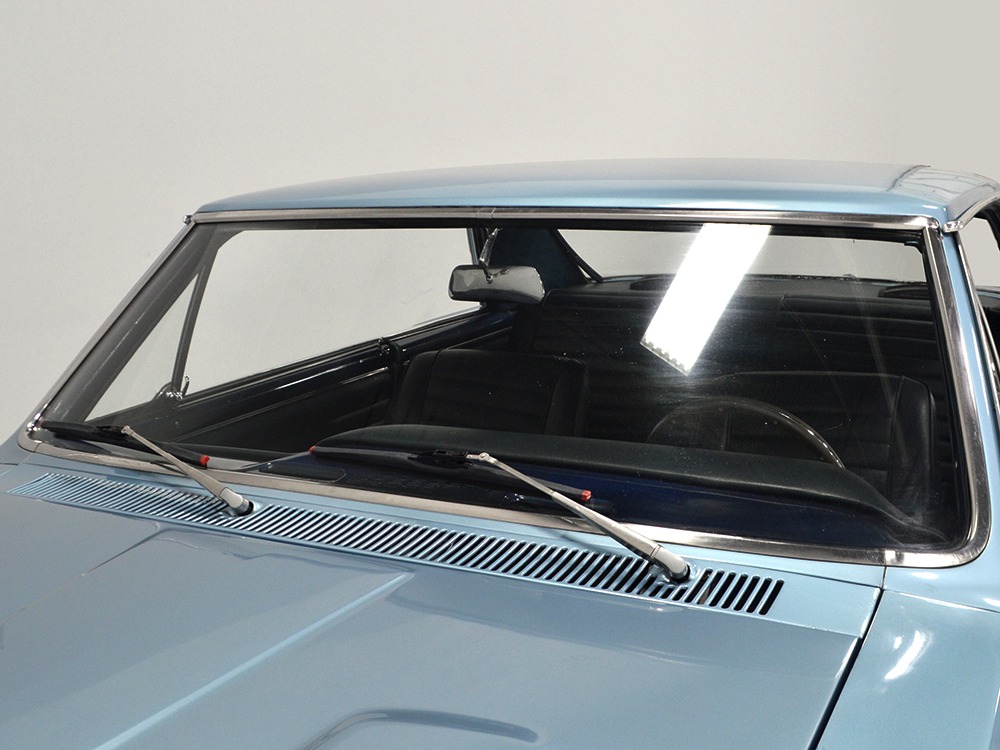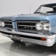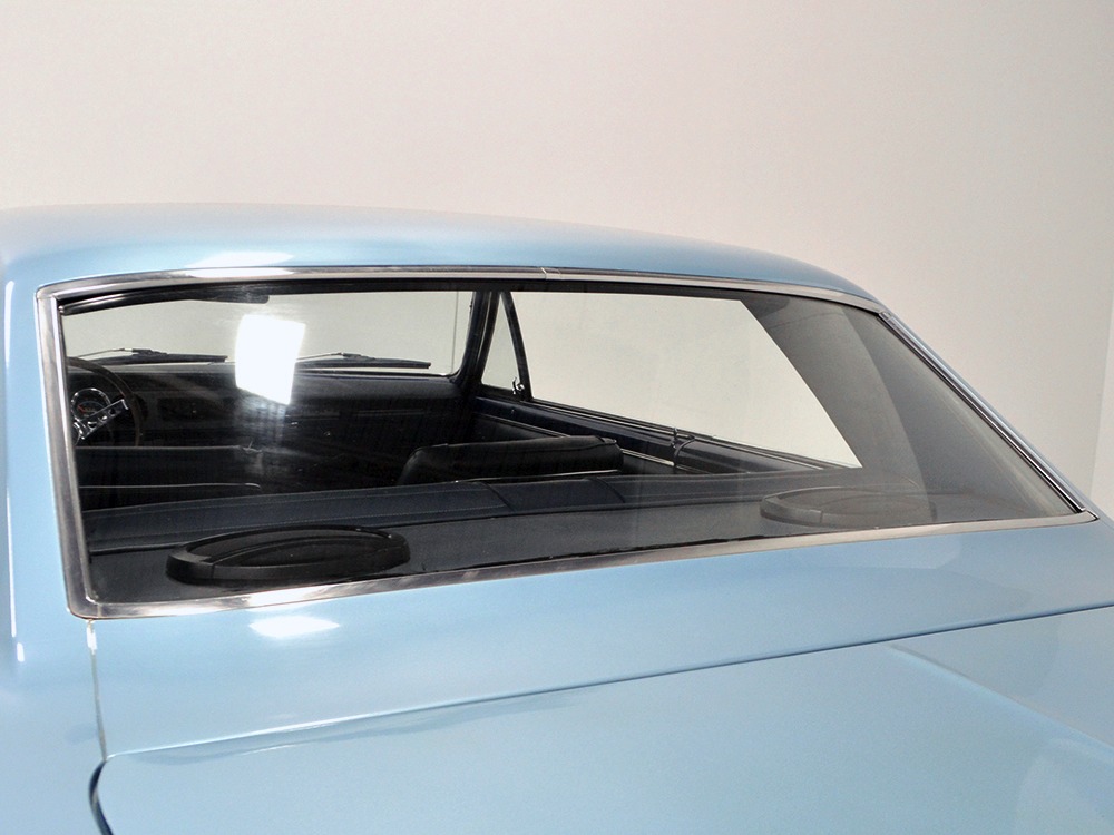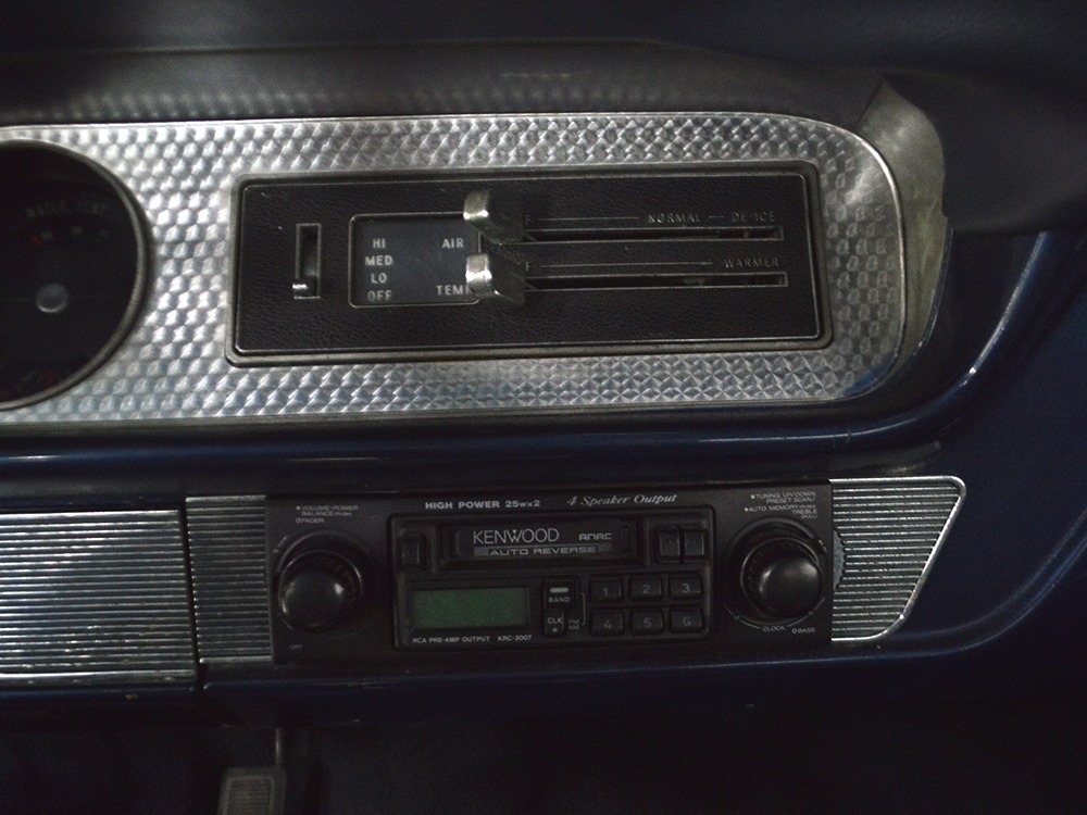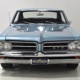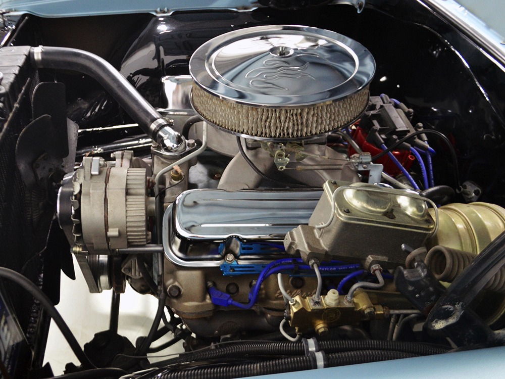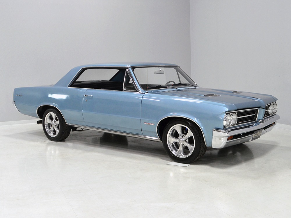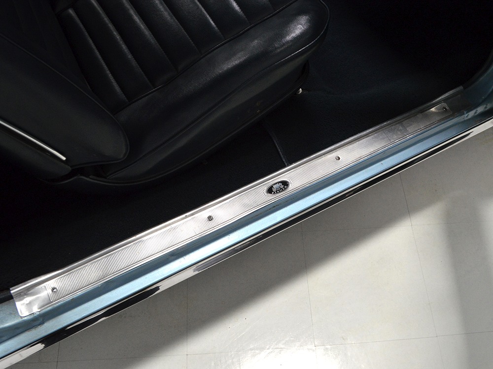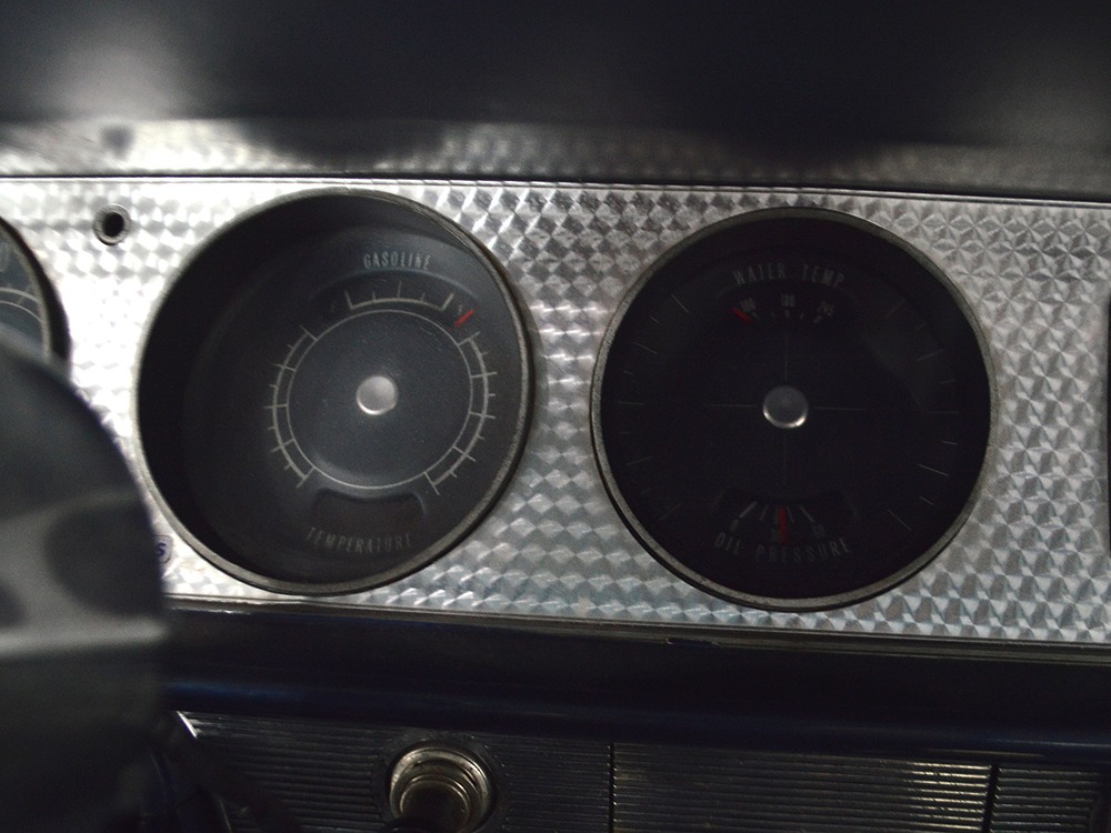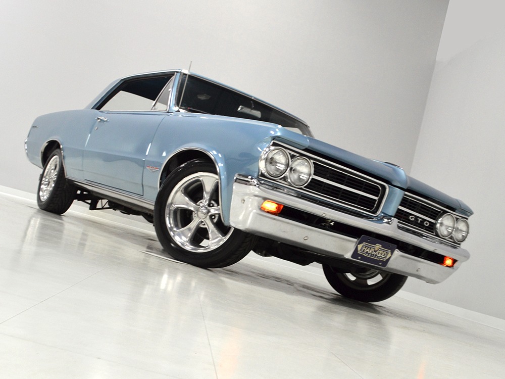 The interior has been recently restored to factory specs using reproduction seat covers in the original code 215 dark blue vinyl. It’s minimalist, but that’s the essence of the GTO’s performance attitude—looking good while going fast. Patterns and materials are correct throughout and the wood-rimmed wheel warms things up a bit. The Muncie M21 close-ratio 4-speed manual transmission is topped by a Hurst shifter and cue ball knob and there’s a vintage Sun tachometer mounted on the steering column. The gauges are in original condition, all framed by the engine-turned dash applique that has represented performance since the days of Duesenberg and Bugatti. At some point a Kenwood AM/FM/cassette stereo has been retrofitted in the dash and it powers a set of speakers on the rear package shelf. A newer dash pad tidies up the top of the instrument panel and the rest of the dash has been painted dark blue to contrast with the lighter bodywork. The back seat looks completely unused and the trunk is extremely solid and finished in factory spatter paint.