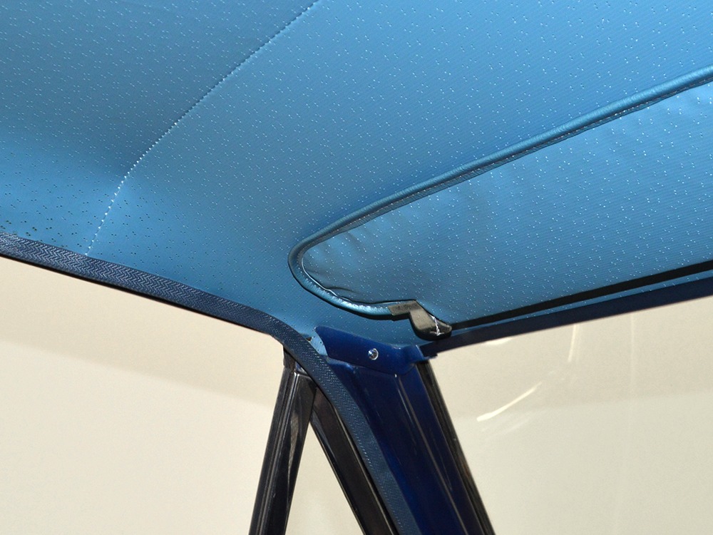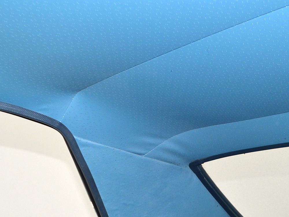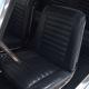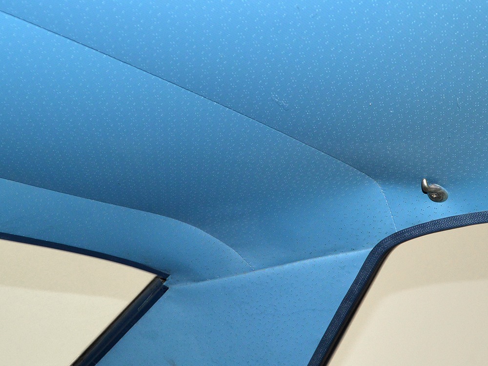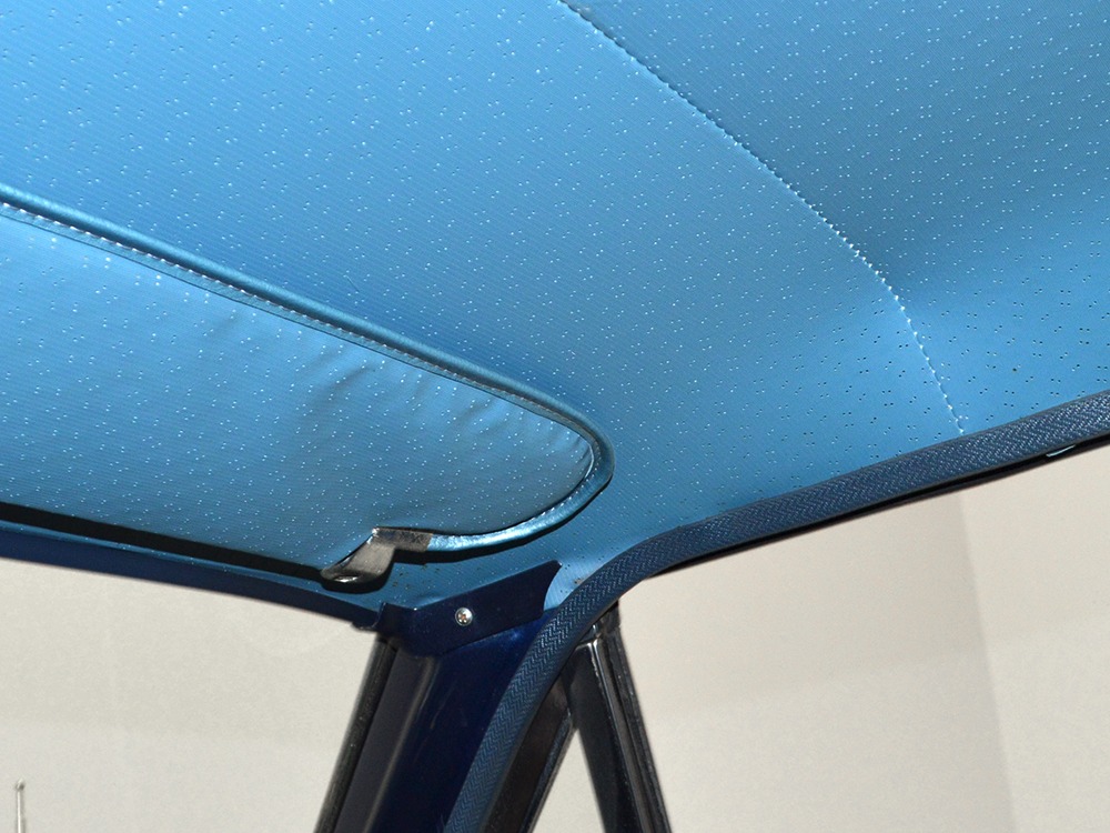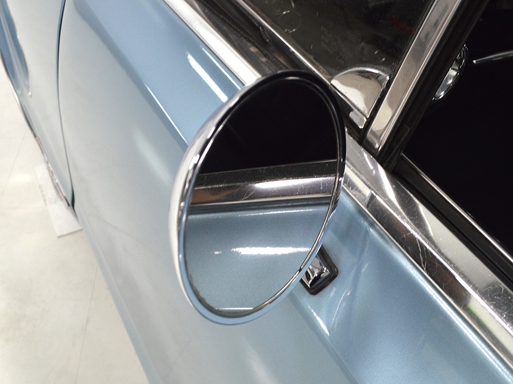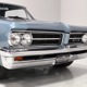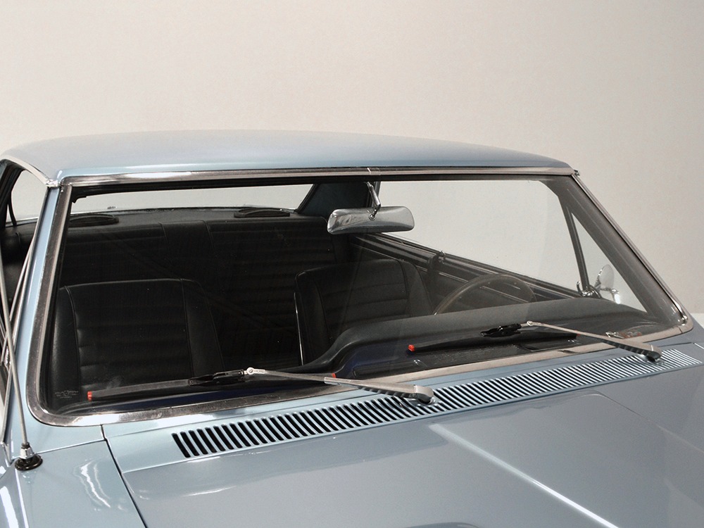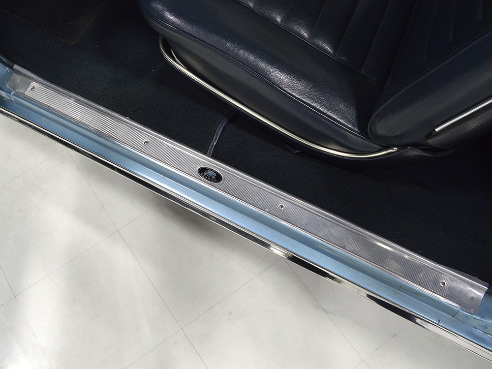 The interior has been recently restored to factory specs using reproduction seat covers in the original code 215 dark blue vinyl. It’s minimalist, but that’s the essence of the GTO’s performance attitude—looking good while going fast. Patterns and materials are correct throughout and the wood-rimmed wheel warms things up a bit. The Muncie M21 close-ratio 4-speed manual transmission is topped by a Hurst shifter and cue ball knob and there’s a vintage Sun tachometer mounted on the steering column. The gauges are in original condition, all framed by the engine-turned dash applique that has represented performance since the days of Duesenberg and Bugatti. At some point a Kenwood AM/FM/cassette stereo has been retrofitted in the dash and it powers a set of speakers on the rear package shelf. A newer dash pad tidies up the top of the instrument panel and the rest of the dash has been painted dark blue to contrast with the lighter bodywork. The back seat looks completely unused and the trunk is extremely solid and finished in factory spatter paint.