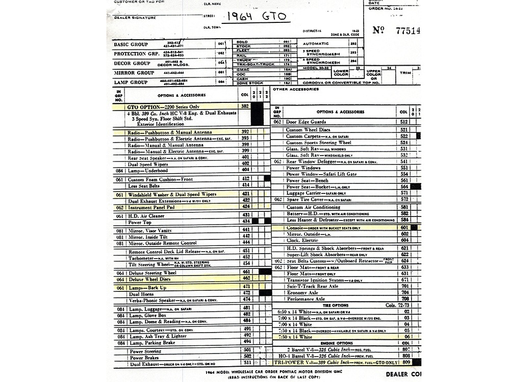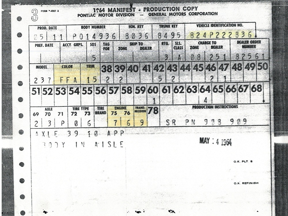 Documentation includes paperwork from PHS verifying that this is, indeed, a real GTO that has been refinished in its original colors.