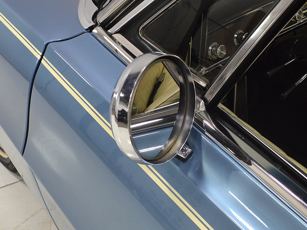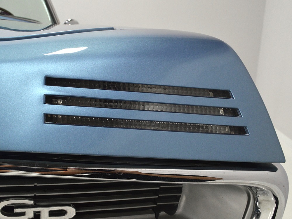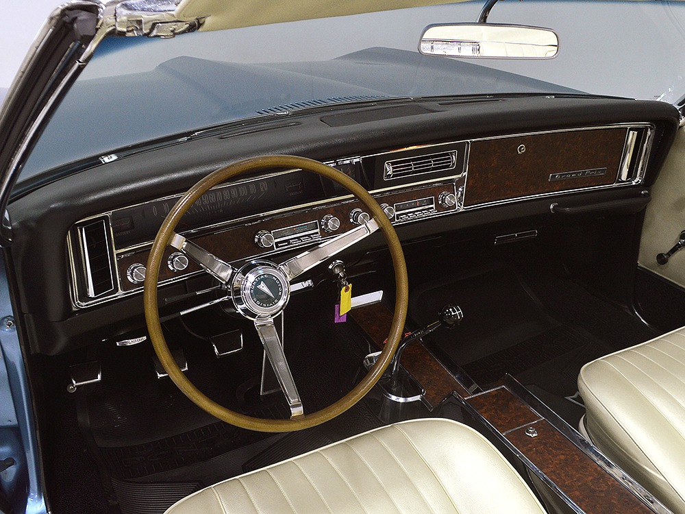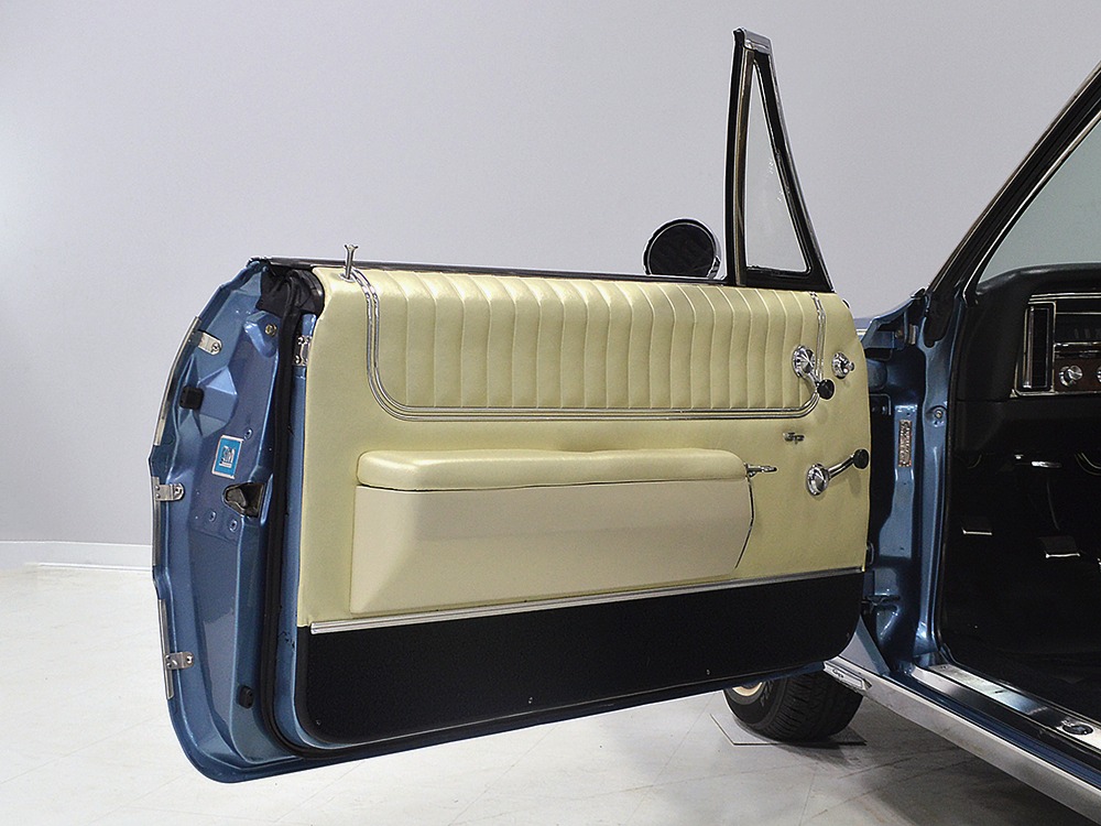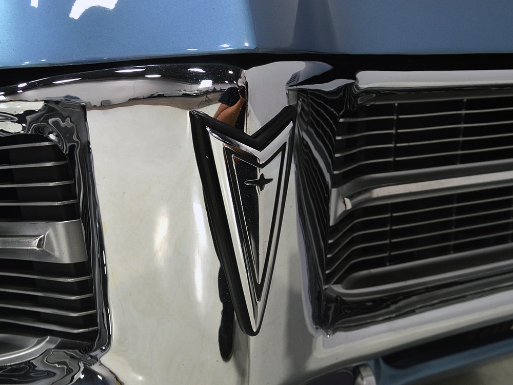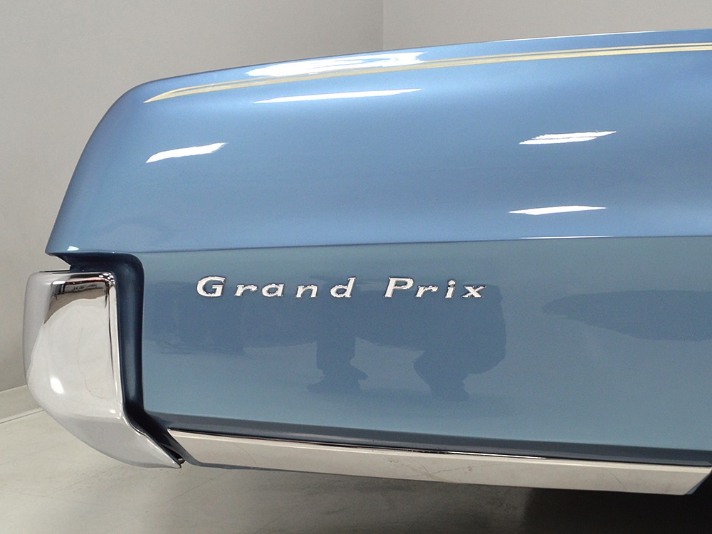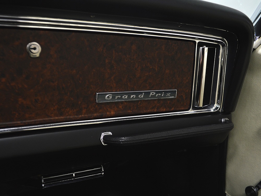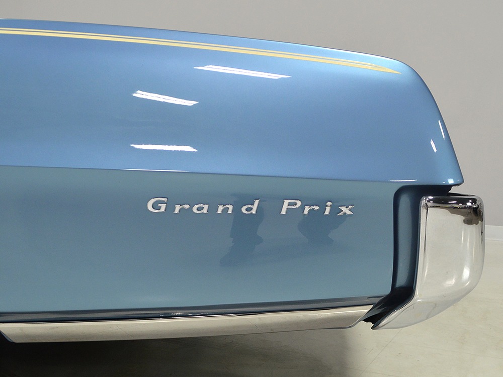 Code D Montreux Blue is this car’s original color, and when it was restored there was zero question about what was going back on the fully prepped bodywork. It’s just stunning. Not too bright but not a light blue, either, it’s the archetypal color for the grown-up buying a Pontiac in the 1960s. The 1967 Grand Prix was a one-year-only design, and not just due to the unique hidden headlights and slotted parking lights. The following year, the Grand Prix would move to another platform and get downsized to a personal coupe, making 1967 a banner year in more ways than one. This is a big, full-sized car, make no mistake, but the handsome styling makes it look trim and well-tailored, particularly the curvaceous quarters that recall the GTO. You will note that this car was taken down to bare metal and rebuilt from there (we have the photographs and receipts to prove it) and the workmanship is simply spectacular. It is highly unlikely that they were this nice when they were new, with exacting gaps, doors that thunk close with precision, and not a wave nor ripple to be seen anywhere on the vast flanks. Check out the side view where the crease running from nose to tail is most visible—it is crisp and straight enough to give you a paper cut. There’s a depth and shine to the paint that comes from modern two-stage urethane being color-sanded and buffed and the careful assembly means that it fits together extremely well. Even the matching Parchment pinstripe is painted, not a decal!