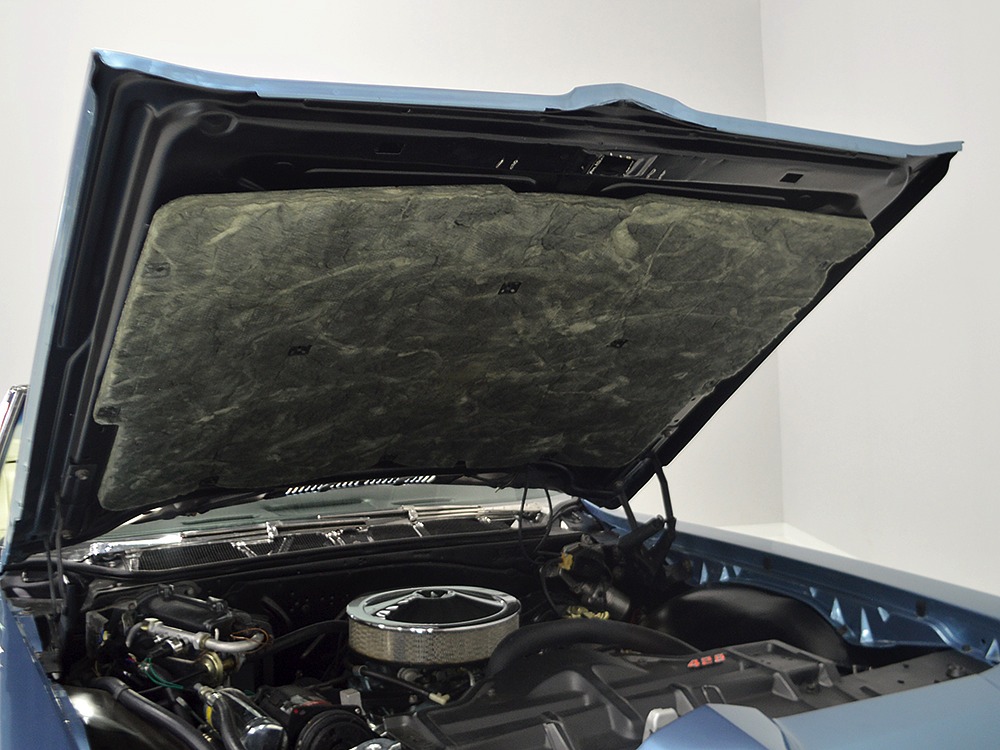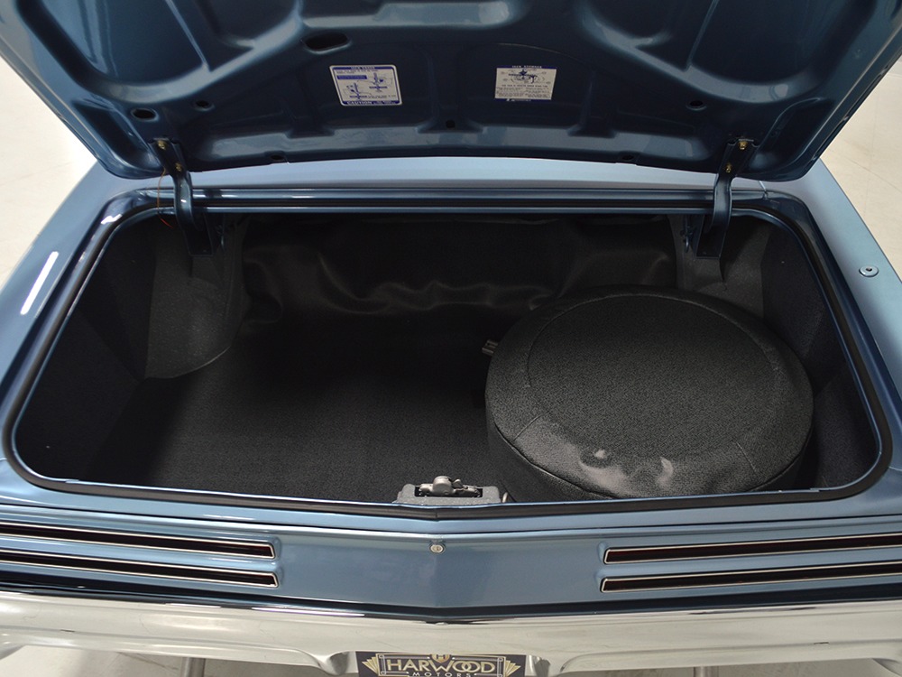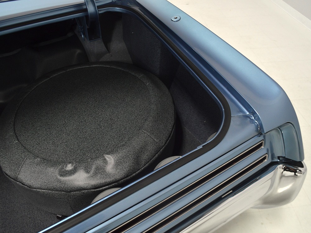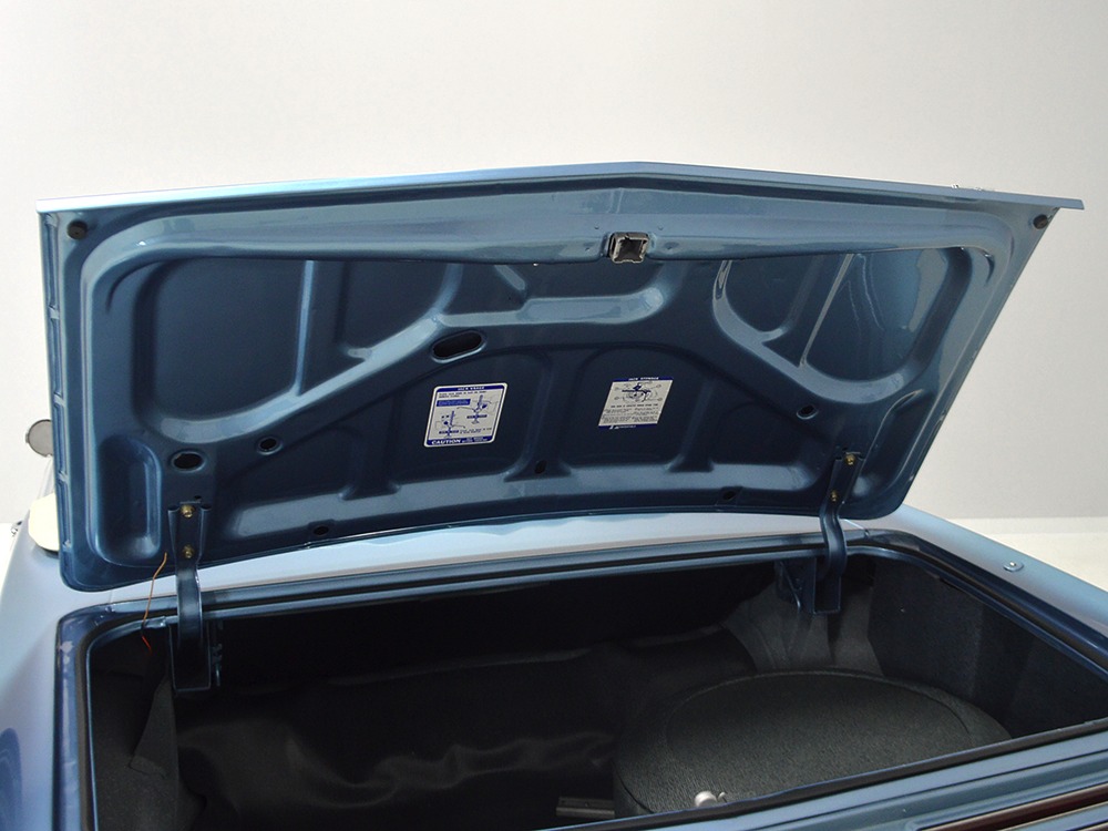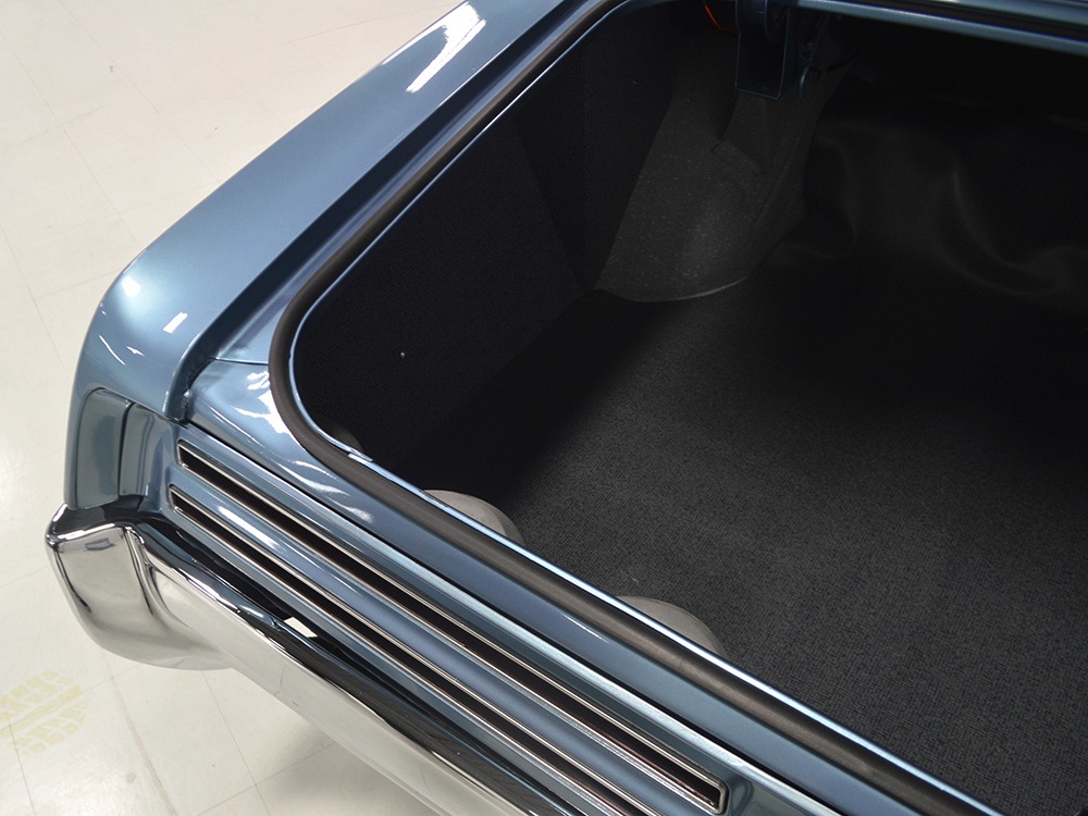 I don’t know about you, but I find Pontiac’s particular shade of Parchment upholstery to be incredibly appealing. Not white but not beige, it’s got an iridescent glow that makes it seem warm and inviting. Of course, that’s how this car was ordered when it was new and it’s a lovely complement to the Montreux Blue paint: flashy but sophisticated. Seeing buckets and a console with a Hurst 4-speed shifter in a big luxury car will cause a lot of double-takes, and even without the 428 HO engine, this would be a rare car: only 205 Grand Prixes were built with a manual gearbox of any kind. Looking around, however, and you’ll quickly see that this car tends towards the luxury side of the sport/luxury equation, with comfortable seats, a handsome dashboard, and upscale options like cold factory A/C, a tilt steering column, and an AM/FM radio with power antenna. Here, too, all the chrome was restored so the trim glitters against the burled walnut appliques and the big woodgrained wheel takes its inspiration from other high-performance Ponchos. The only possible demerits are a clock that wants to work but occasionally stops and a horn button that’s canted a few degrees off-center. Otherwise, the list of flaws is very, very short. Overhead, this Pontiac wears what is perhaps the best-fitting power convertible top we’ve ever seen; it’s so taut that there’s not a wrinkle or crease to be found anywhere. We expected it to be difficult to latch on the header, even with power assist, but no, it drops down and latches with your fingertips—whomever installed this convertible top was an expert at the top of his game. Wow! In back, the trunk is spotless and finished with a correct mat, matching full-sized spare with cover and a full jack assembly.