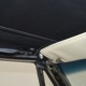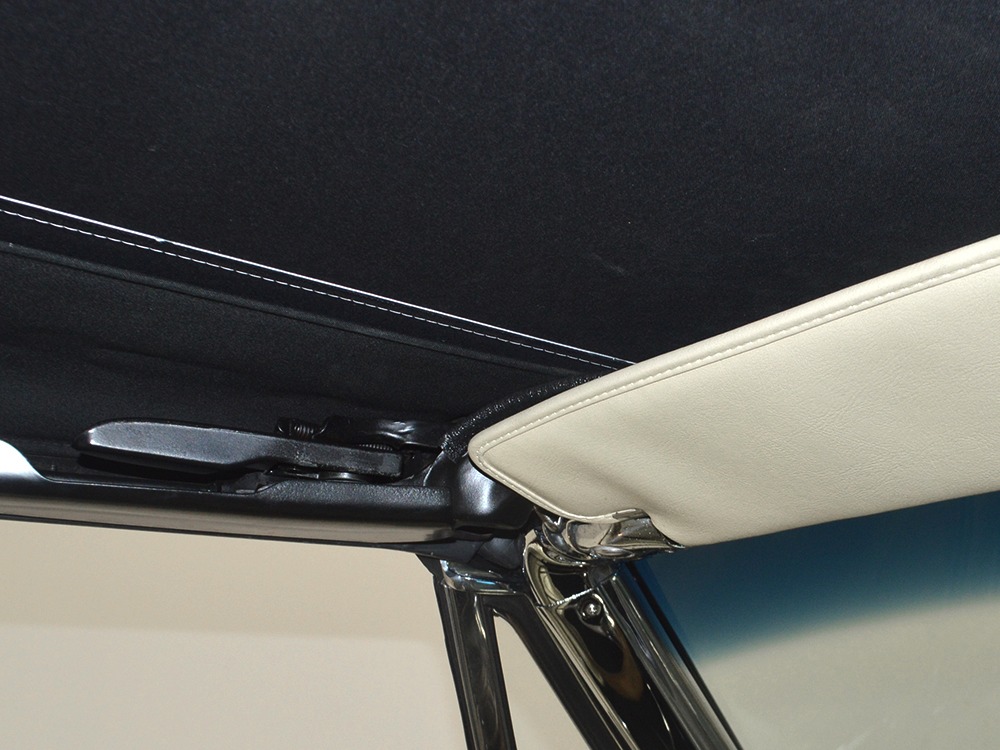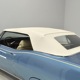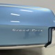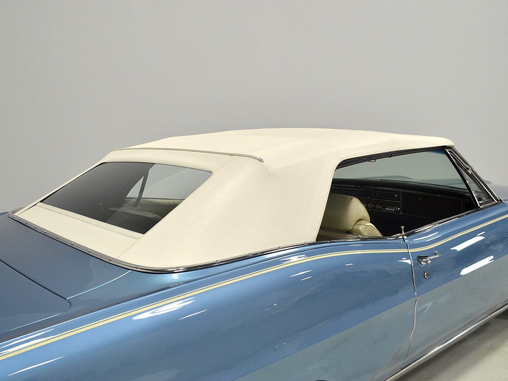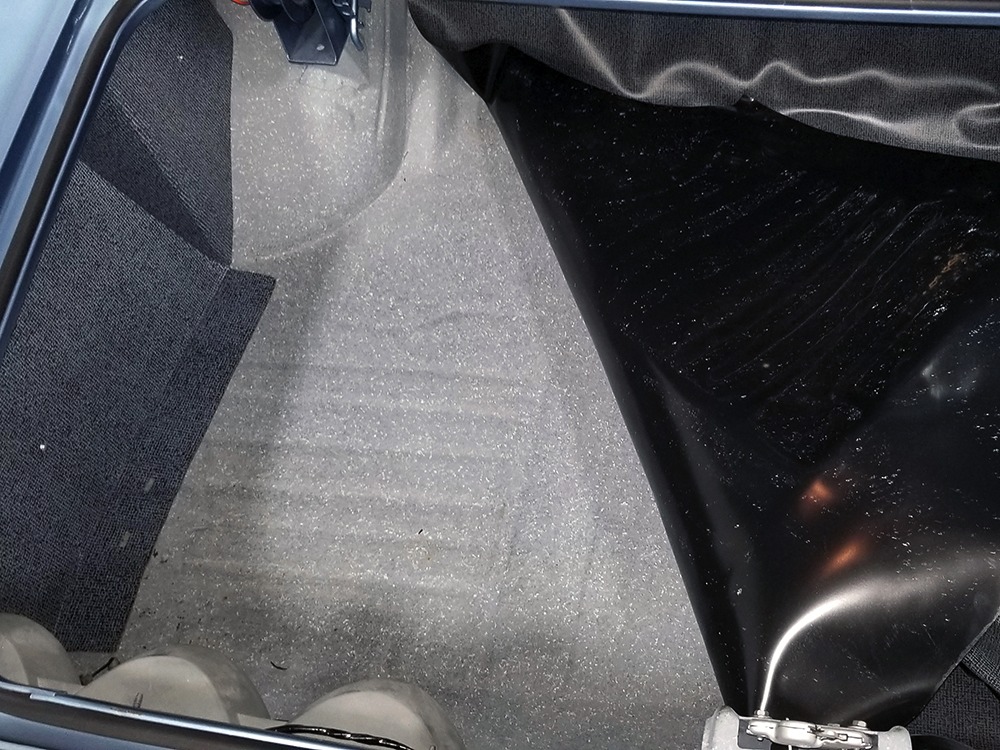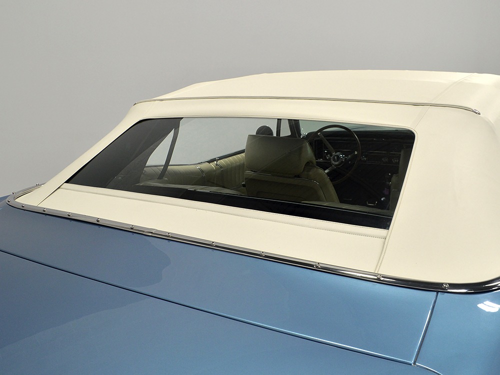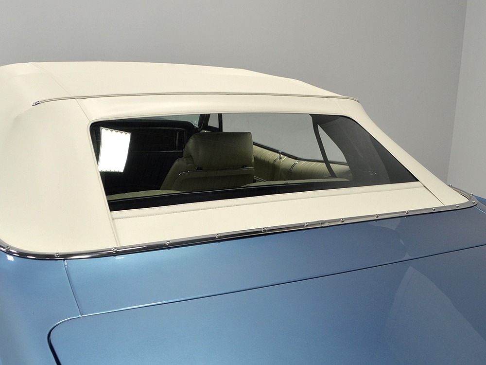 I don’t know about you, but I find Pontiac’s particular shade of Parchment upholstery to be incredibly appealing. Not white but not beige, it’s got an iridescent glow that makes it seem warm and inviting. Of course, that’s how this car was ordered when it was new and it’s a lovely complement to the Montreux Blue paint: flashy but sophisticated. Seeing buckets and a console with a Hurst 4-speed shifter in a big luxury car will cause a lot of double-takes, and even without the 428 HO engine, this would be a rare car: only 205 Grand Prixes were built with a manual gearbox of any kind. Looking around, however, and you’ll quickly see that this car tends towards the luxury side of the sport/luxury equation, with comfortable seats, a handsome dashboard, and upscale options like cold factory A/C, a tilt steering column, and an AM/FM radio with power antenna. Here, too, all the chrome was restored so the trim glitters against the burled walnut appliques and the big woodgrained wheel takes its inspiration from other high-performance Ponchos. The only possible demerits are a clock that wants to work but occasionally stops and a horn button that’s canted a few degrees off-center. Otherwise, the list of flaws is very, very short. Overhead, this Pontiac wears what is perhaps the best-fitting power convertible top we’ve ever seen; it’s so taut that there’s not a wrinkle or crease to be found anywhere. We expected it to be difficult to latch on the header, even with power assist, but no, it drops down and latches with your fingertips—whomever installed this convertible top was an expert at the top of his game. Wow! In back, the trunk is spotless and finished with a correct mat, matching full-sized spare with cover and a full jack assembly.