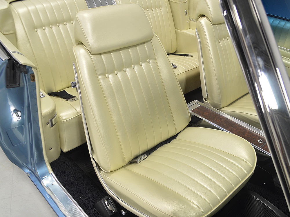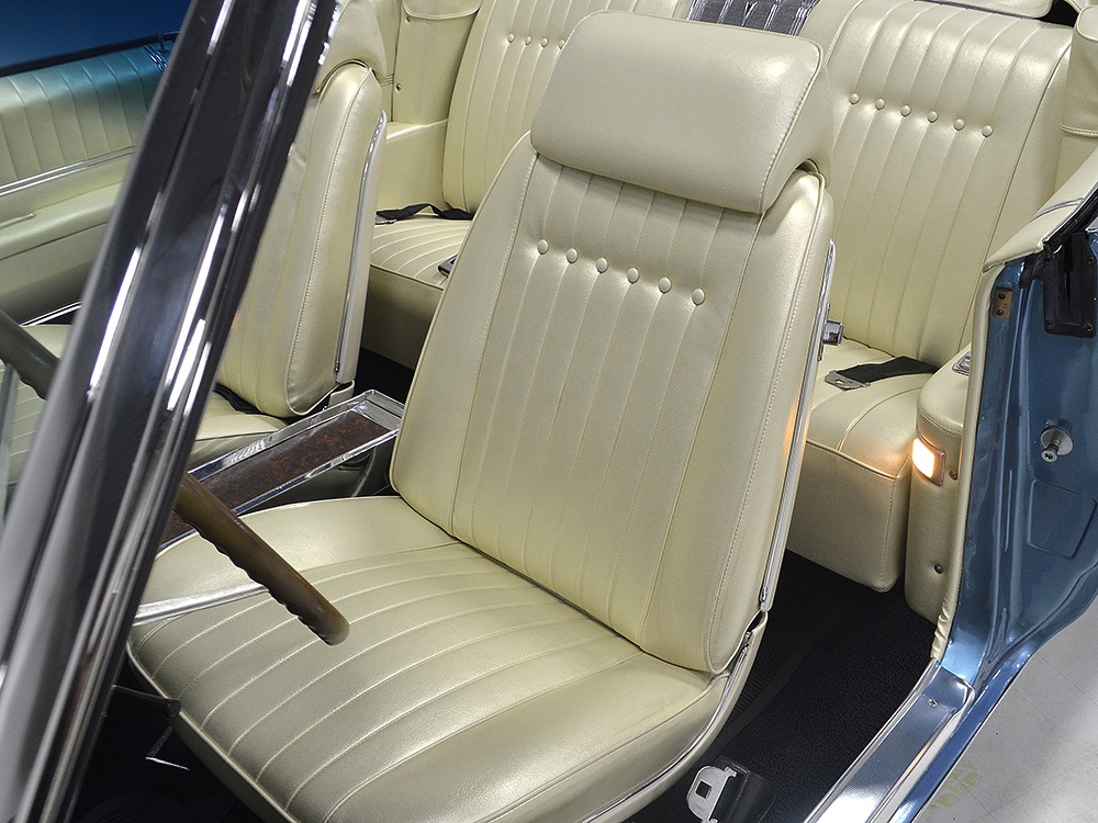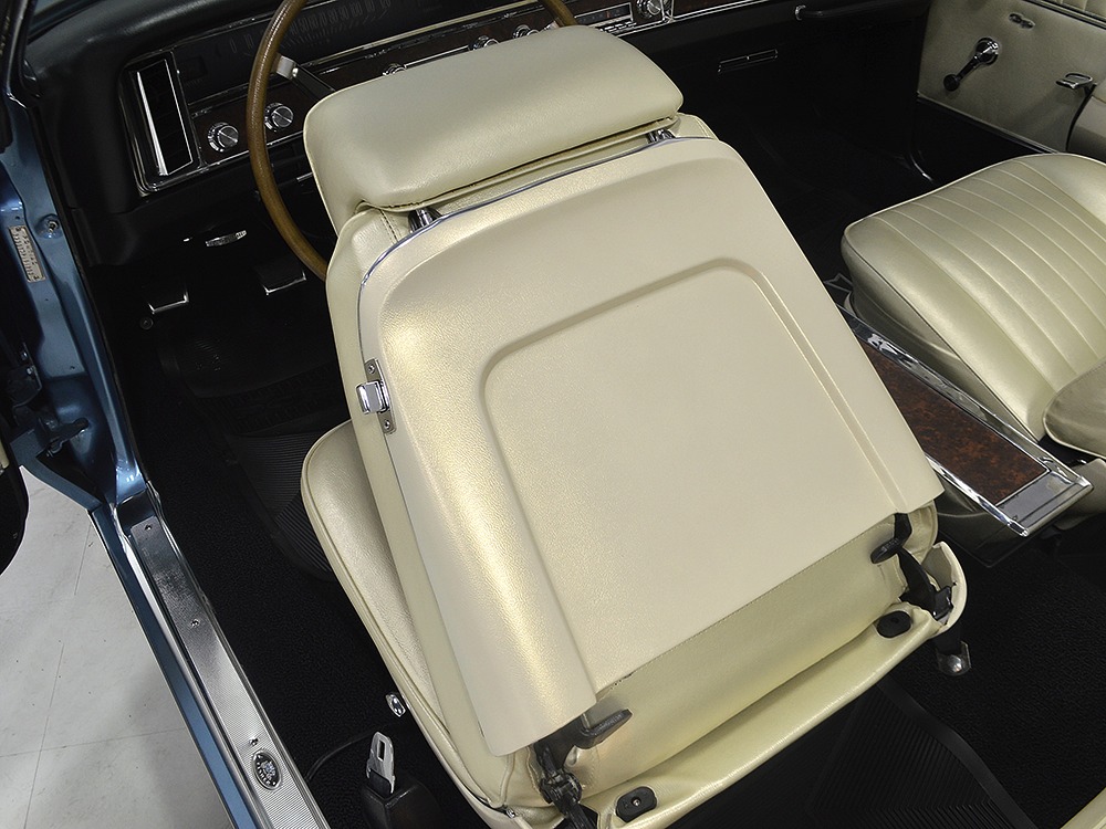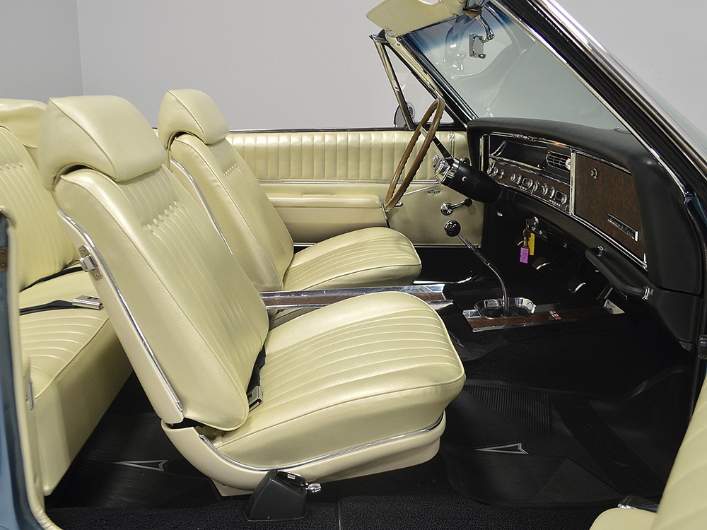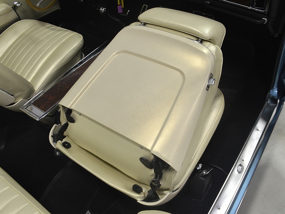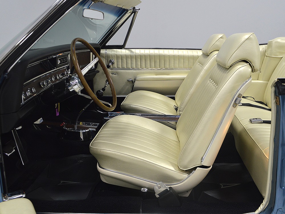 It is, of course, fully rebuilt to stock specs and has about 2000 miles on the restoration, so it is broken in but still quite fresh. It starts quickly and easily with just a single press of the throttle to set the choke, then settles into an easy, unobtrusive idle. Sure, there’s a big cam working in there, so it’s not invisible, but this luxury car is reminding you that it can run with a GTO. Correct Pontiac Turquoise metallic engine enamel gives it the right look, along with a set of chrome valve covers that were a Pontiac trademark on their performance engines (they obviously knew guys would be looking around under the hood). Correct markings, decals, and even things like the tower hose clamps make this car extremely correct. The A/C has been converted to R134a so it’s easy to service, but the changeover was invisible so you won’t lose any points on the show field. The heavy-duty cooling system has no problems keeping it healthy and throttle response is RIGHT NOW thanks to the giant 4-barrel carburetor up top. You will also find new wiring, correct vacuum systems for the headlights, and even all the extra little ground straps on the block, details that many restorers omit.