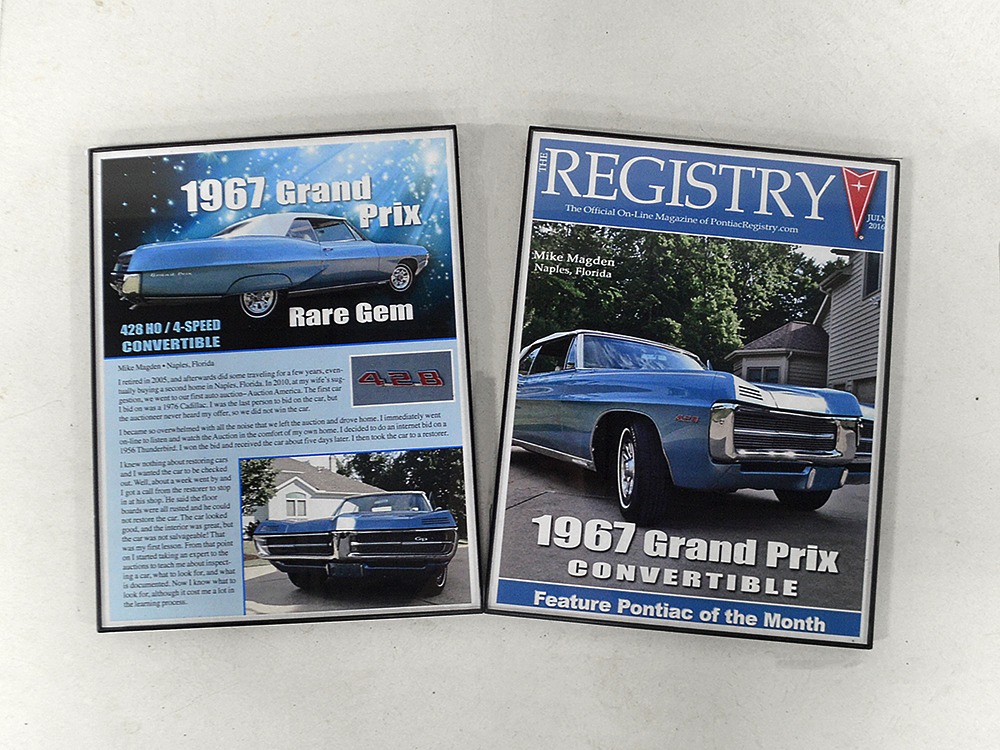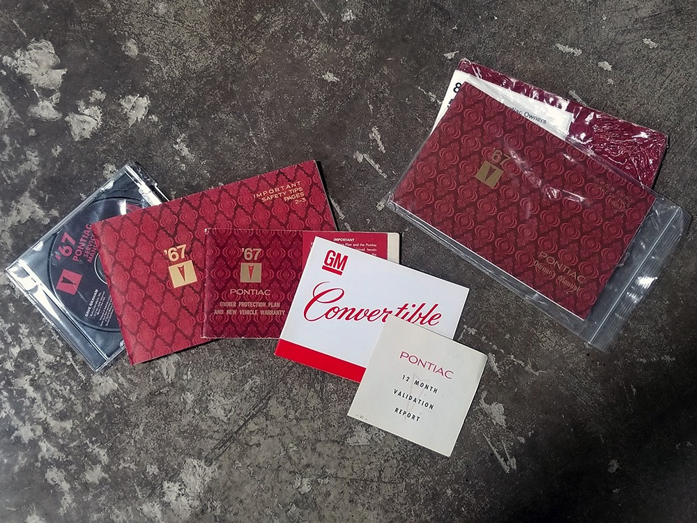 Documentation, as you’d expect, is extensive. In addition to the full PHS package that proves this car is legitimate, there are reproduction window stickers, original owner’s manuals, warranty booklets, and a factory service manual on CD-ROM. There’s a huge album full of restoration photos and receipts that should satisfy anyone that this car was restored to the very highest levels. It also includes several magazine articles on this car, a stand-up show board, and a 1967 Pontiac showroom brochure. There are no question marks on this Grand Prix.