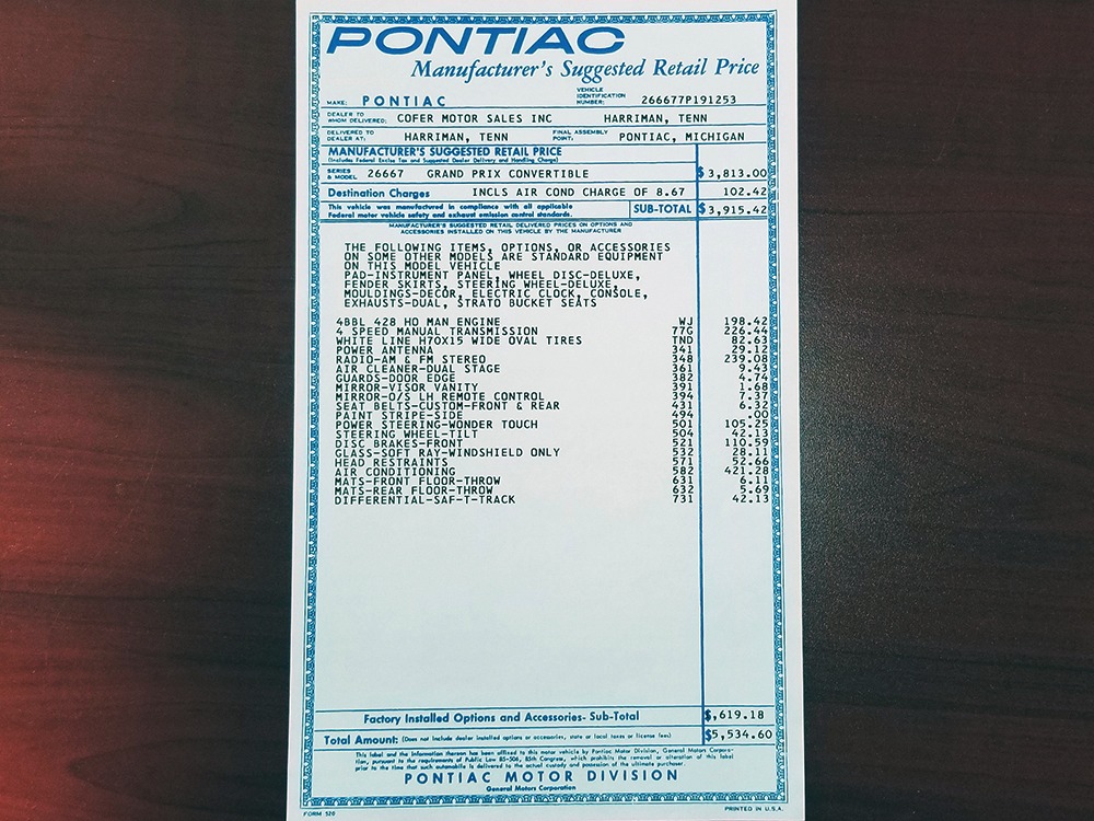 This Pontiac Grand Prix ragtop gets everything right, don’t worry. It’s a real-deal 428 HO/4-speed car, as documented by PHS paperwork. It carries the right engine, too, a WJ-coded 428 that was unique to the 4-speed HO Grand Prix (more on the engine in a moment). It is loaded with desirable options like factory A/C, a center console, and an AM/FM radio with power antenna. And it has been treated to a no-expense-spared frame-off restoration to the very highest standards, likely making it the best of its kind available anywhere. This is one of those collector cars that checks every box and there are exactly zero asterisks attached to it. Performance, beauty, and pedigree, this Grand Prix delivers on every single level.
