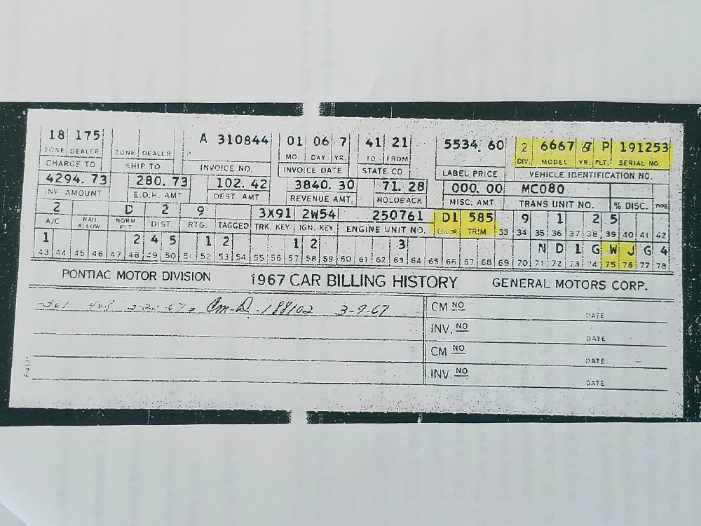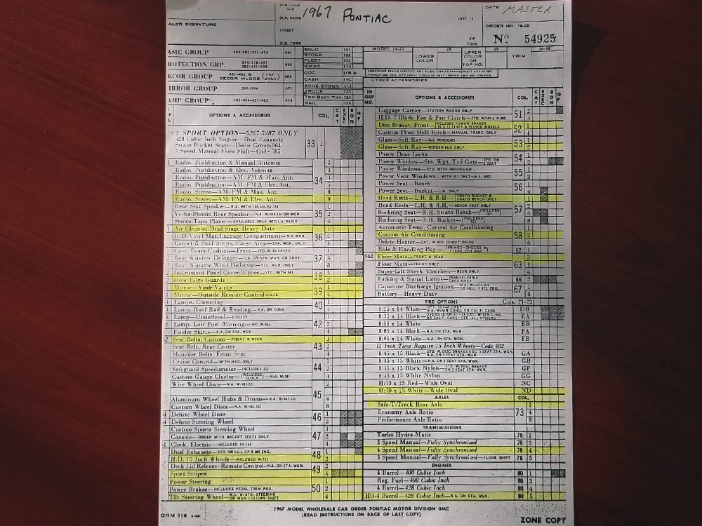 Now about the engine. In 1967, Pontiac increased the size of all their V8s, with the 389 getting punched out to 400 cubes and the former 421 becoming the 428 thanks to a modest overbore. There were two versions of the 428, a 360-horsepower version and the 428 HO, which made a rather impressive 376 horsepower and 462 pounds of torque. Obviously intended for use in full-sized hardware, the HO made even the biggest Pontiacs feel 1000 pounds lighter than they are, yet it’s buttery-smooth and effortless in true luxury car fashion. Only 385 428 HO engines were built in 1967, so any car carrying one is a rather rare beast. At any rate, this car is a real HO/4-speed car so don’t worry about that part. And don't worry, it is a correct WJ-coded 428 HO engine that was unique to the B-bodies.