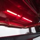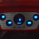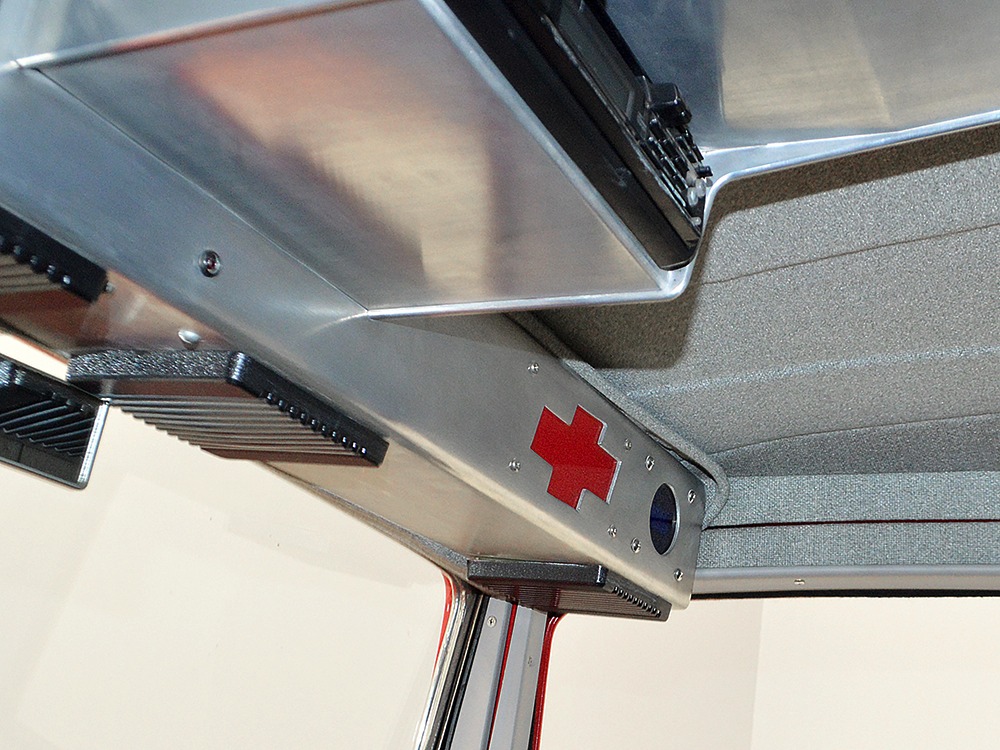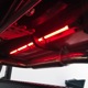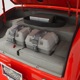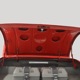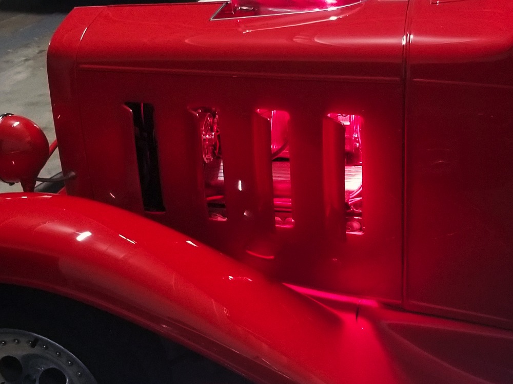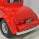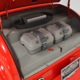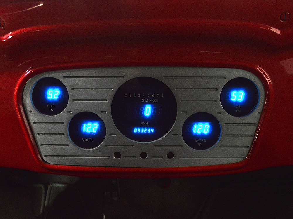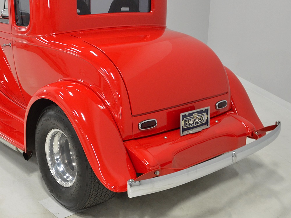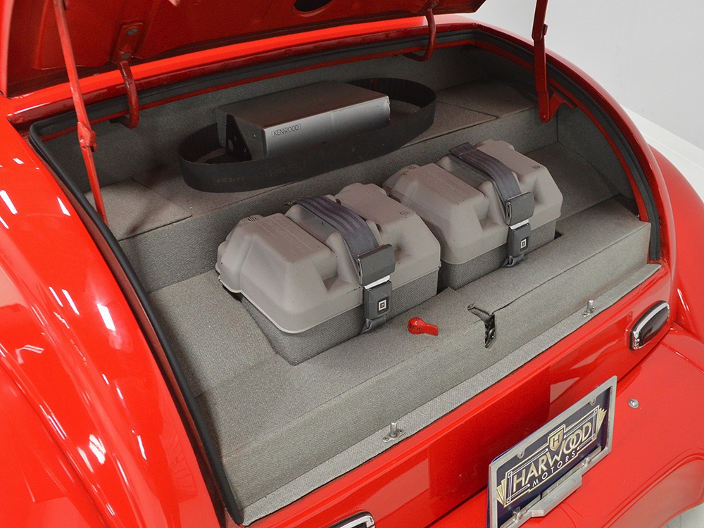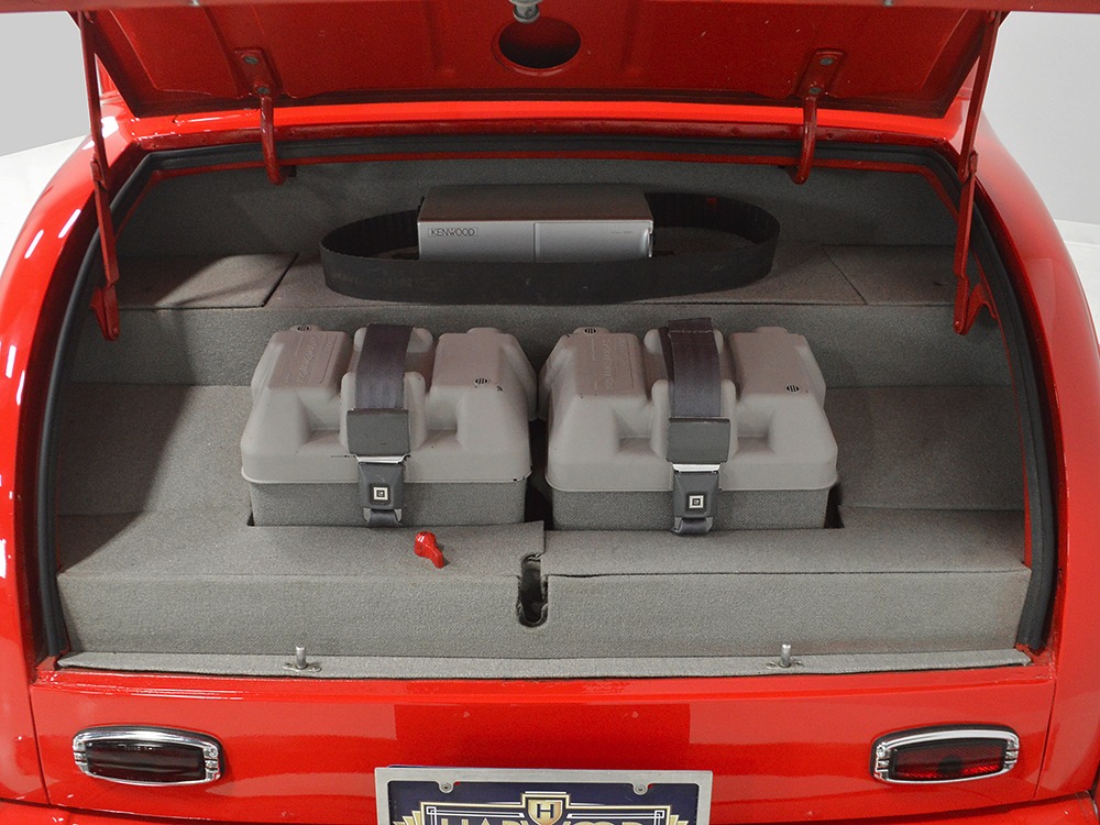 The interior is neatly dressed in gray fabric that wears well and looks great. A 1994 Dodge Viper donated a set of matching gray leather buckets that fit rather neatly in the vintage Chevy coupe bodywork, and thanks to the work of noted trimmer Mike Haverstock, it remains in fantastic condition throughout. They took it easy on the tech just so everything remains reliable, although a custom billet gauge panel full of Dakota Digital gauges is a neat touch. There’s also a tilt steering column with a leather-wrapped LaCarrera steering wheel that makes it quite easy to get comfortable at the helm. Overhead there’s a custom aluminum console with all the secondary controls, plus a tachometer, which is a neat way to do it. There’s also a Kenwood AM/FM/cassette head unit with a 10-disc CD changer system in the trunk that sounds quite good, although the blown V8 up front sounds better. You’ll note a few switches on the panel marked “NEON” which control the red neon lights under the car, in the engine bay, and in the passenger compartment, all of which combine to give this car an incredible look at night (and is likely why there are two big batteries in the trunk—keep it lit up at shows!). Seat belts, custom floor mats, and original door hardware are just some of the nice details that suggest a good investment went into building this car. The trunk is equally well-finished, although between the batteries, tubbed wheel housings, and CD changer, there’s not much space left over.