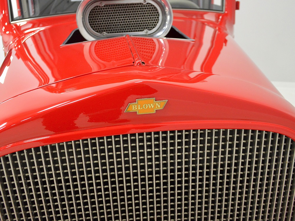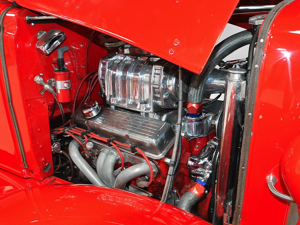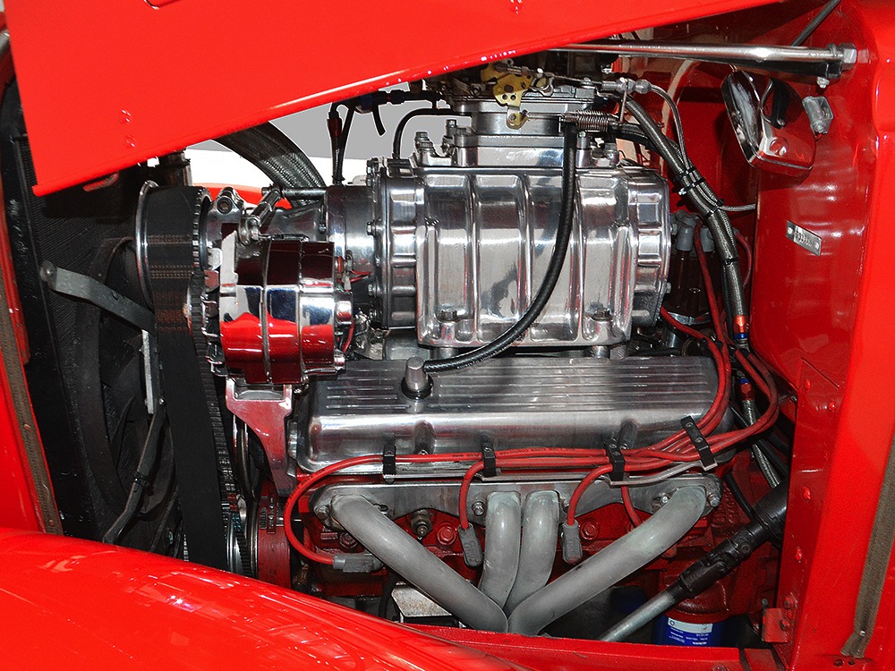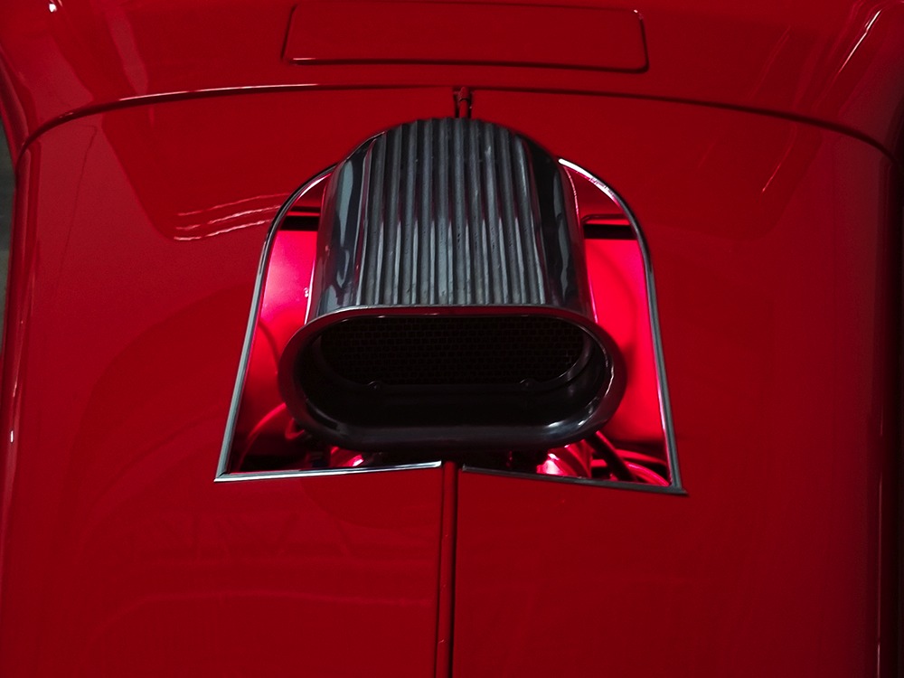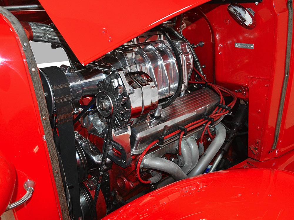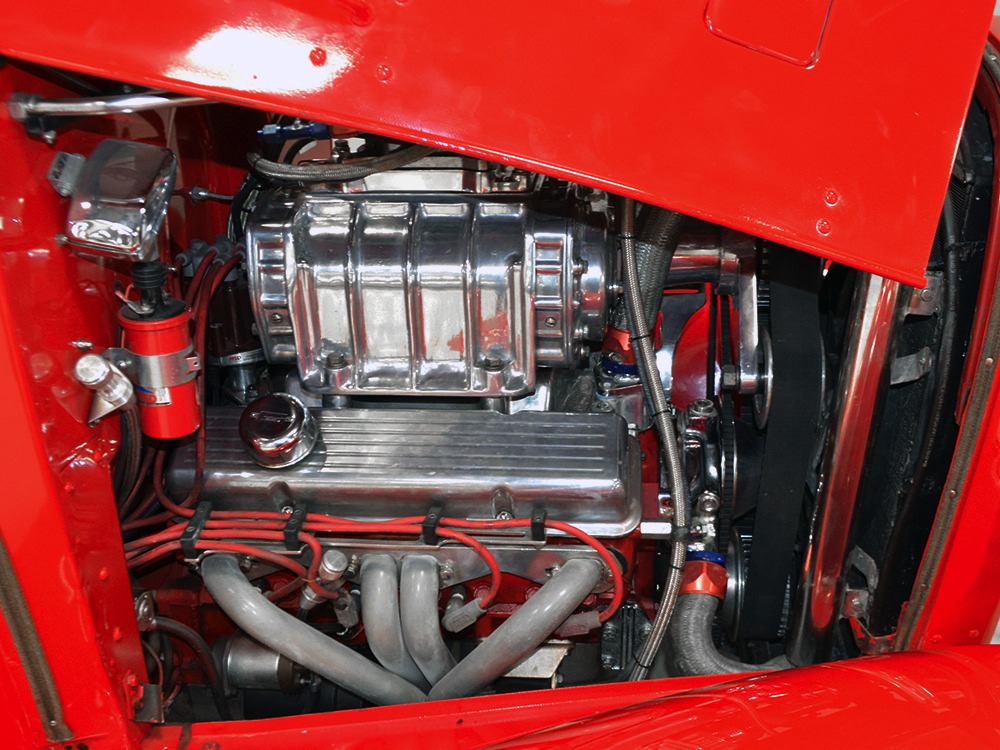 It is an older build but thanks to a fresh coat of Porsche Guards Red paint, it looks very contemporary and extremely crisp. It was not an inexpensive paint job and working with clean OEM steel (only the running boards and rear fenders are ‘glass), it looks far more expensive than it is. Modifications to the clean Chevy bodywork are minimal, mostly related to the headlights and that low-profile blower scoop sticking out of the hood. It wasn’t chopped or shaved, giving it a classic look that will never go out of style. And to their credit, they resisted adding graphics or other paint tricks, so it will look contemporary for decades to come. Fit and finish are excellent, with doors that open and close easily, neat gaps even around the hood, and a great stance that’s aggressive but street-friendly. Even the fabric insert in the top remains in place. The original grille shell was painted to match the bodywork and there’s a dropped headlight bar with a set of King-Bee-style lamps, all of which really clean up the nose. The doors on the hood still open to manage airflow over the warmed-over small block and original chrome bumpers not only provide protection, but give it a finished look. The car is sleek, clean, and restrained (if such a thing is possible in a red car). Clearly they knew what they were doing when they put this one together.