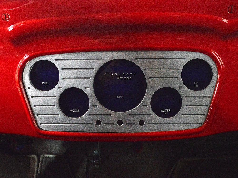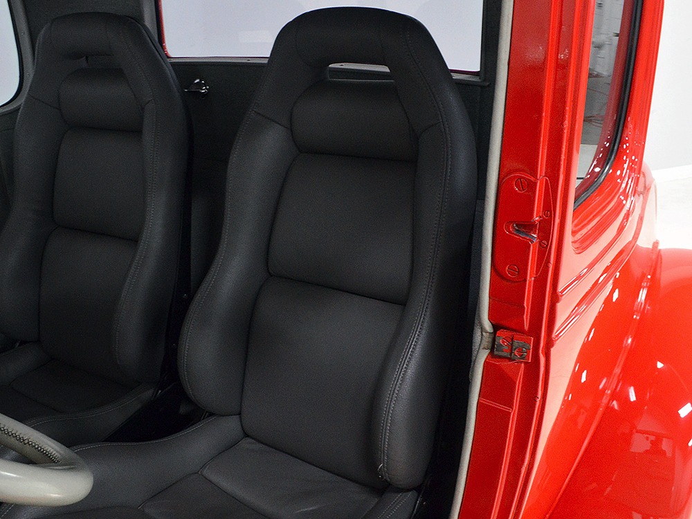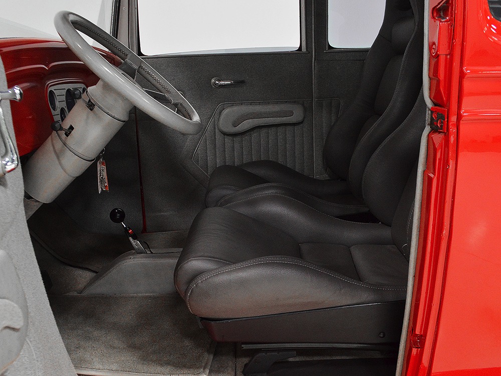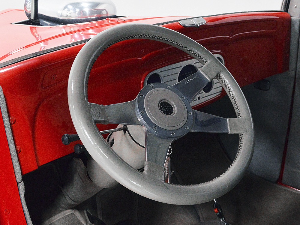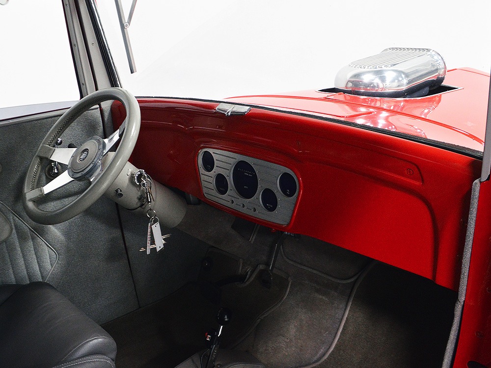It is an older build but thanks to a fresh coat of Porsche Guards Red paint, it looks very contemporary and extremely crisp. It was not an inexpensive paint job and working with clean OEM steel (only the running boards and rear fenders are ‘glass), it looks far more expensive than it is. Modifications to the clean Chevy bodywork are minimal, mostly related to the headlights and that low-profile blower scoop sticking out of the hood. It wasn’t chopped or shaved, giving it a classic look that will never go out of style. And to their credit, they resisted adding graphics or other paint tricks, so it will look contemporary for decades to come. Fit and finish are excellent, with doors that open and close easily, neat gaps even around the hood, and a great stance that’s aggressive but street-friendly. Even the fabric insert in the top remains in place. The original grille shell was painted to match the bodywork and there’s a dropped headlight bar with a set of King-Bee-style lamps, all of which really clean up the nose. The doors on the hood still open to manage airflow over the warmed-over small block and original chrome bumpers not only provide protection, but give it a finished look. The car is sleek, clean, and restrained (if such a thing is possible in a red car). Clearly they knew what they were doing when they put this one together.