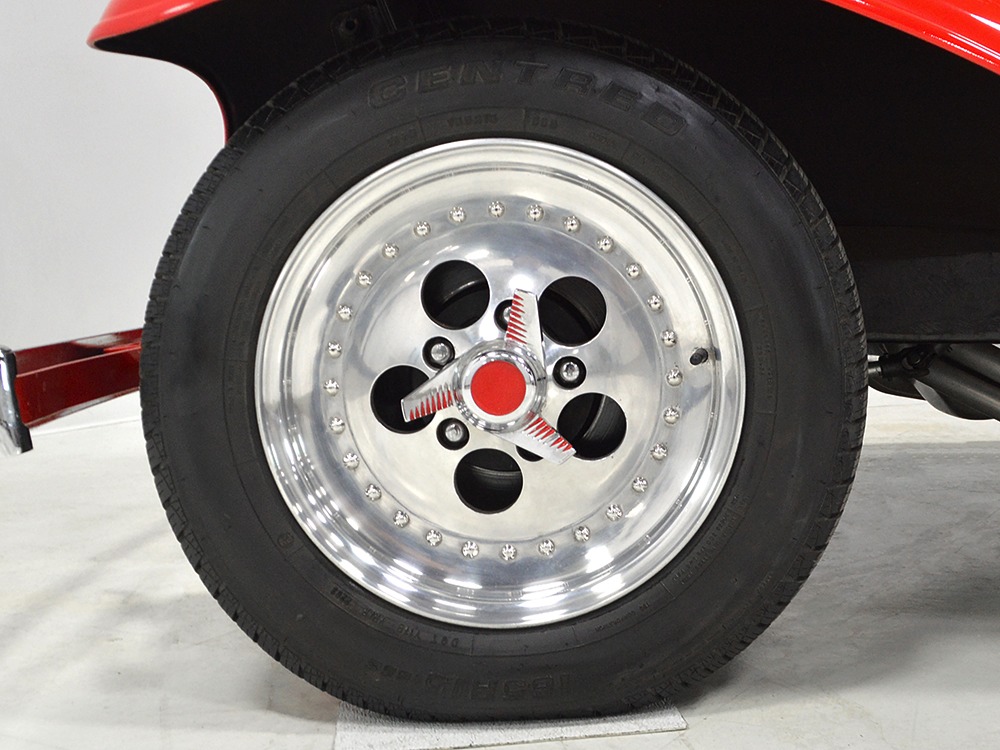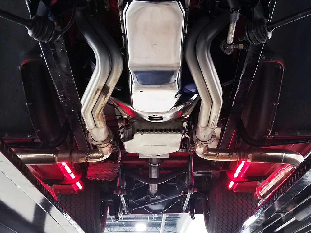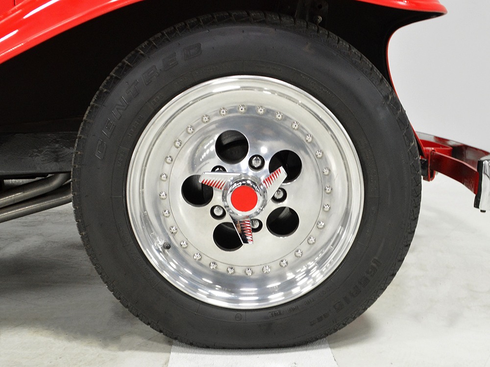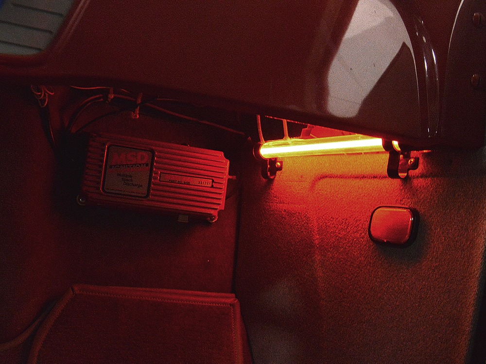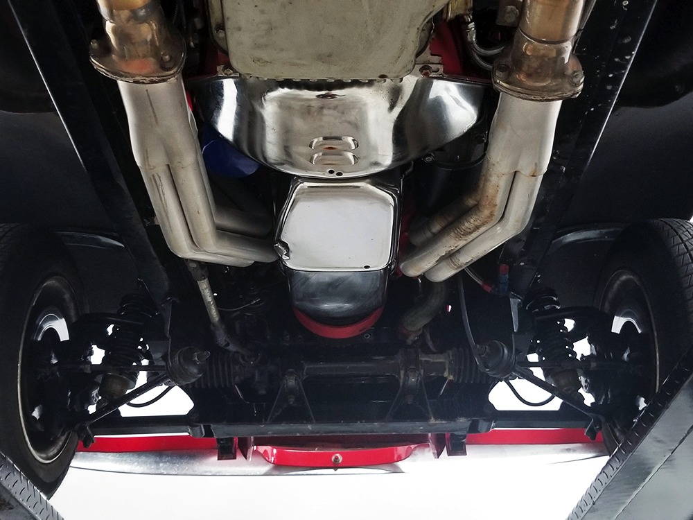 Underneath, there’s a 2x4 tube chassis by Martz Chassis which provides a rock-solid platform for the performance this car carries. The transmission is a bulletproof TH400 3-speed automatic with a high-stall torque converter, so you’ll need to accustom yourself to giving it a pretty good prod off the line. On the fly, however, this car is invincible as the boost comes up almost faster than you can put your foot on the floor. A custom 3-inch driveshaft turns a narrowed 12-bolt rear end filled with Summers Brothers axles and bearings and 3.73 gears that are a good compromise for the street. The front suspension is a familiar Mustang II setup with coil-overs, Camaro spindles, GM disc brakes, and rack-and-pinion steering, while the rear is ladder bars and another set of coil-over shocks. A beautiful set of ceramic-coated Sanderson long-tube headers feed a set of side pipes that sound fantastic, but there are baffles inside, so it’s very streetable and not annoying. Other niceties include a transmission cooler tucked into the frame and, of course, the red neon that makes the car glow underneath. The stance is just about perfect and it sits on staggered Centerline wheels with 165R15 front and 31x16.50-15 Mickey Thompson rubber.
