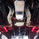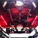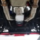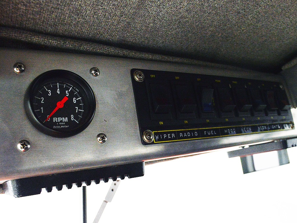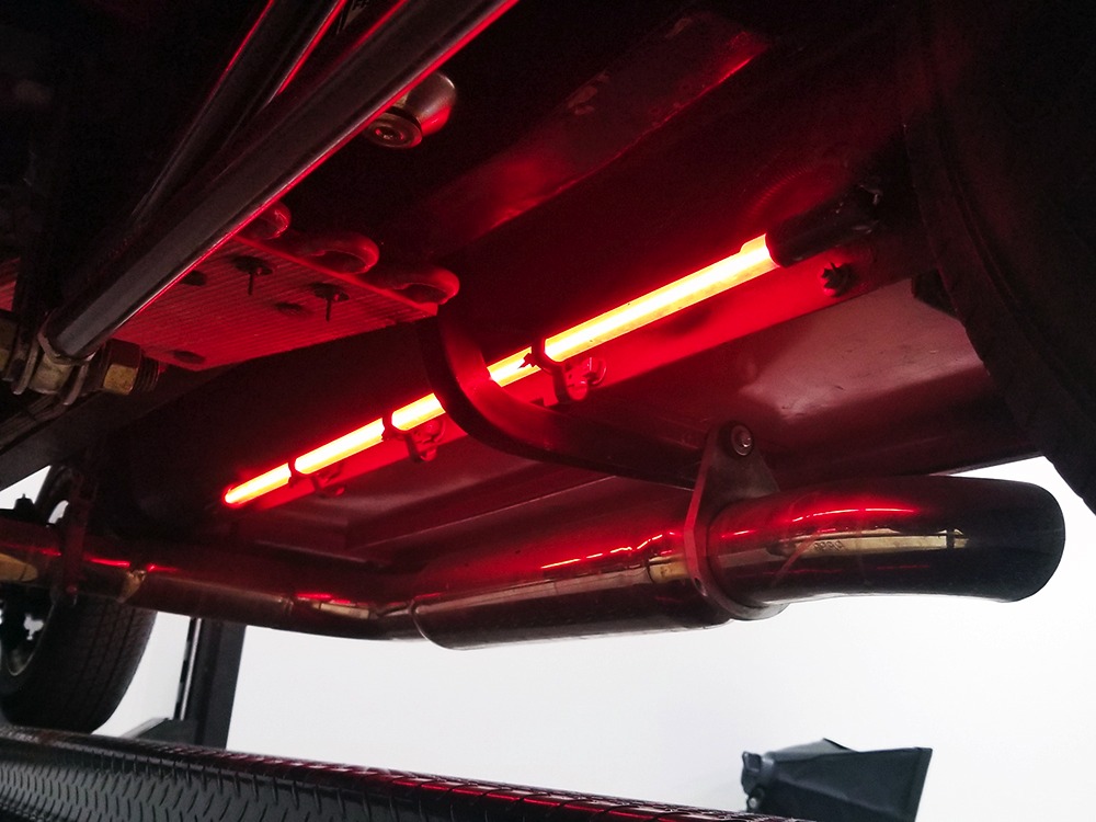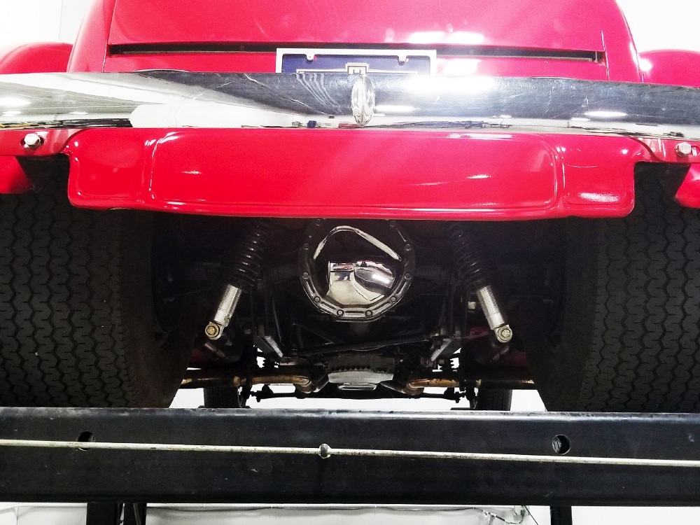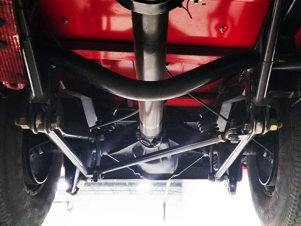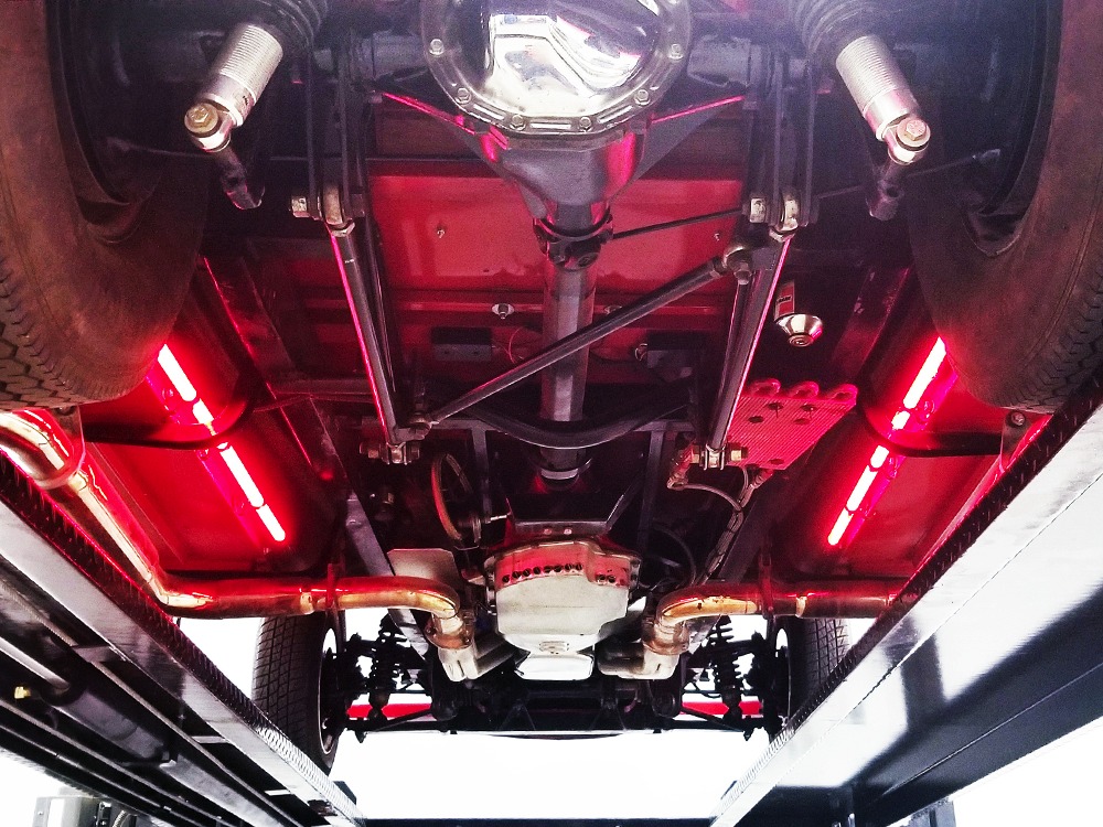 Underneath, there’s a 2x4 tube chassis by Martz Chassis which provides a rock-solid platform for the performance this car carries. The transmission is a bulletproof TH400 3-speed automatic with a high-stall torque converter, so you’ll need to accustom yourself to giving it a pretty good prod off the line. On the fly, however, this car is invincible as the boost comes up almost faster than you can put your foot on the floor. A custom 3-inch driveshaft turns a narrowed 12-bolt rear end filled with Summers Brothers axles and bearings and 3.73 gears that are a good compromise for the street. The front suspension is a familiar Mustang II setup with coil-overs, Camaro spindles, GM disc brakes, and rack-and-pinion steering, while the rear is ladder bars and another set of coil-over shocks. A beautiful set of ceramic-coated Sanderson long-tube headers feed a set of side pipes that sound fantastic, but there are baffles inside, so it’s very streetable and not annoying. Other niceties include a transmission cooler tucked into the frame and, of course, the red neon that makes the car glow underneath. The stance is just about perfect and it sits on staggered Centerline wheels with 165R15 front and 31x16.50-15 Mickey Thompson rubber.