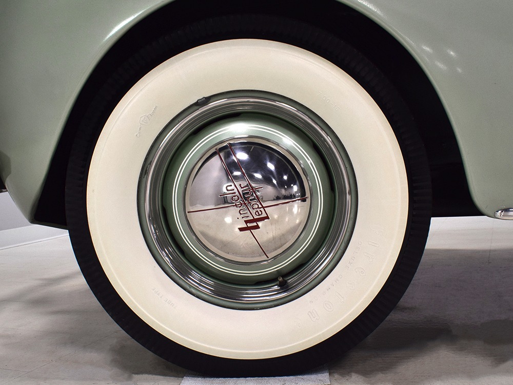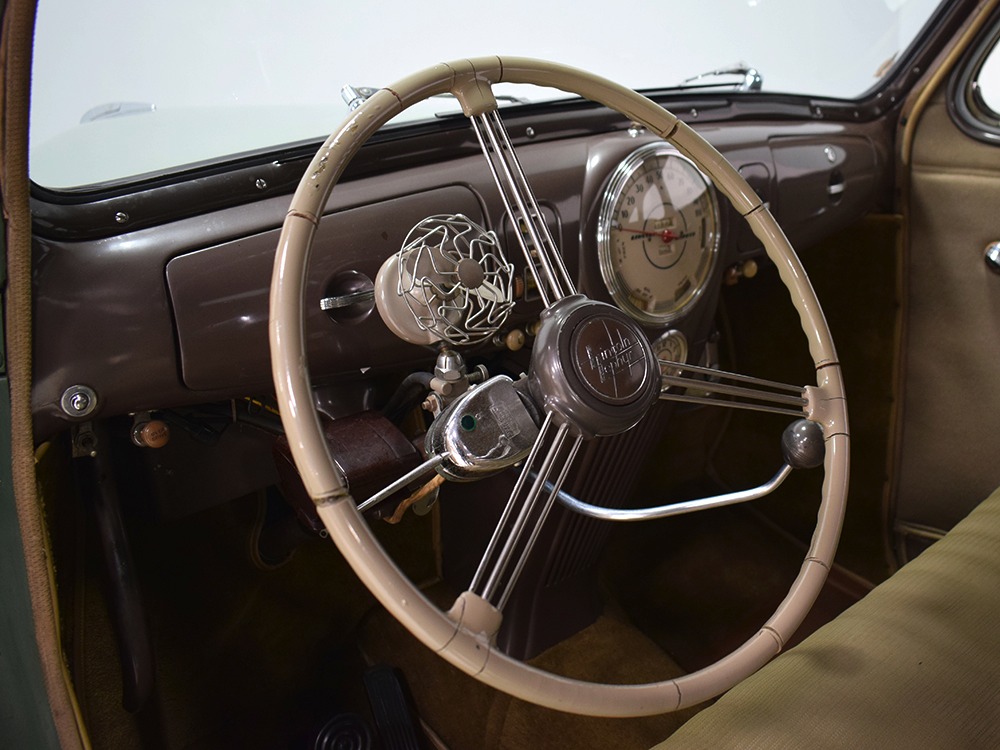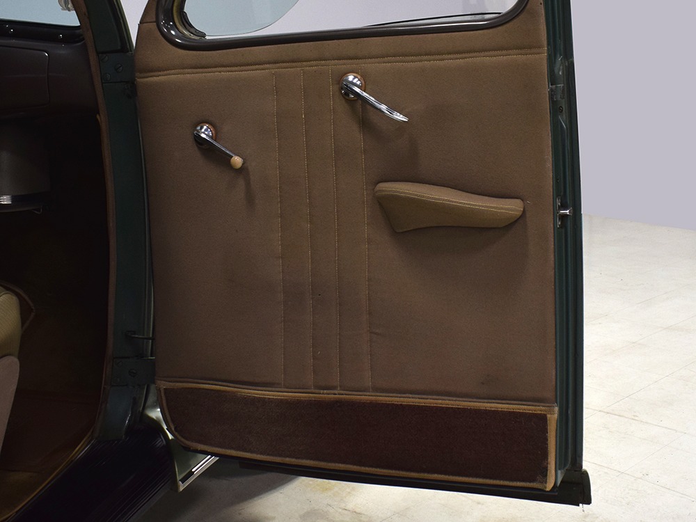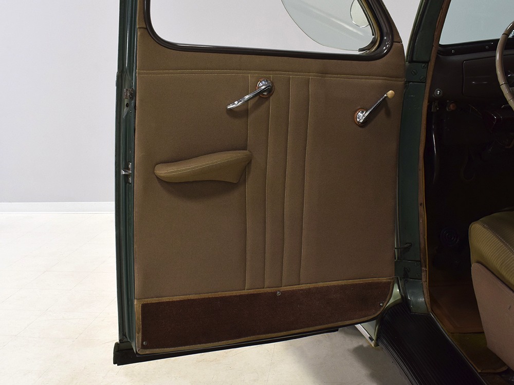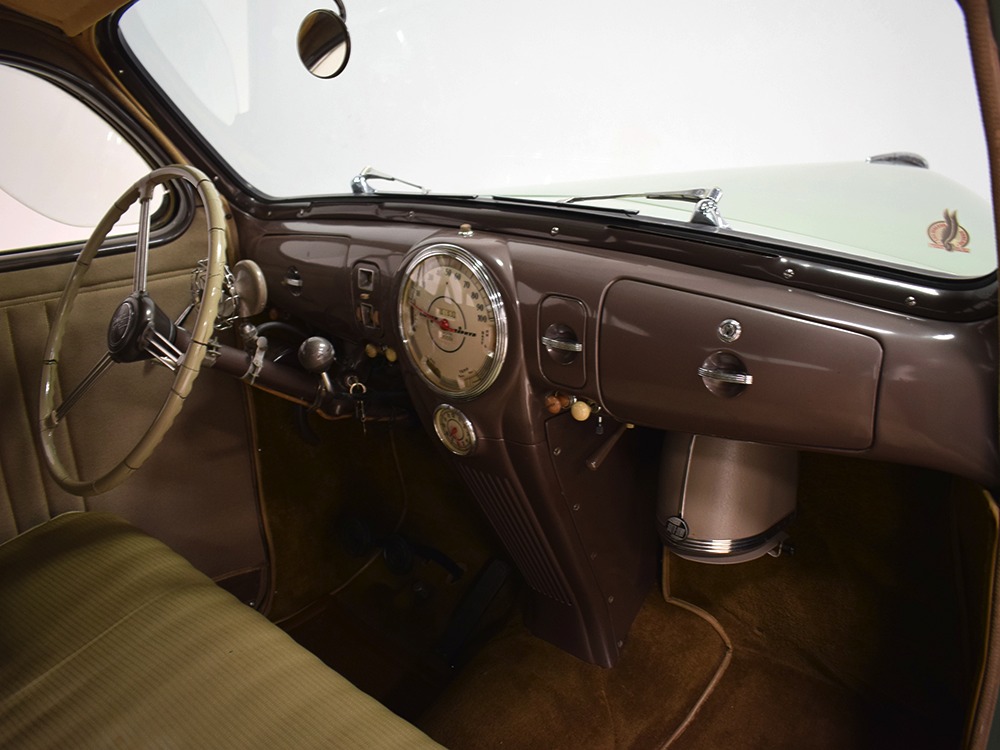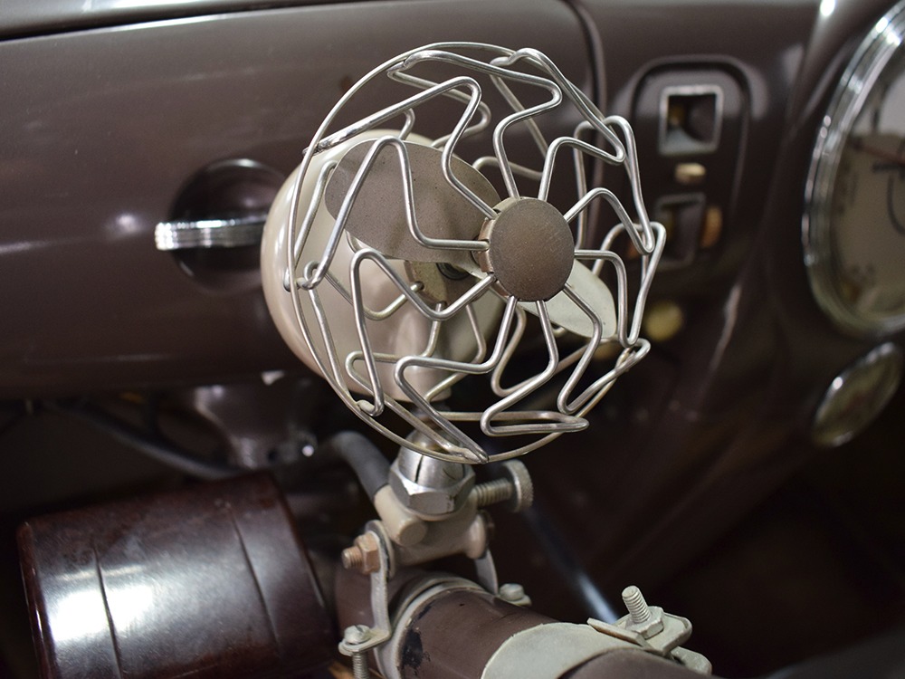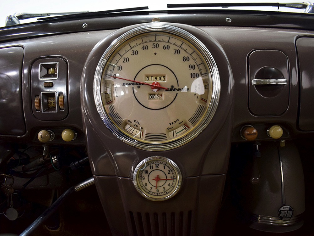 ’39 Lincoln Zephyr transmissions were prized by hot-rodders for their closer ratios and the shift quality on this Zephyr is excellent with no clashing or balkiness. Clutch take-up is smooth and thanks to a Columbia 2-speed rear end, this Zephyr is a fantastic high-speed tour car that’s quite happy at 65 MPH. As a car where the body has never been off the frame, it’s a bit grungy underneath but there are no signs that this car ever spent time in the harsh winter weather. The bare metal floors are in good order, the outer rocker panels show no signs of rot, and there’s plenty of evidence of proper maintenance over the years, including a newer transverse muffler in back. The recent electric fuel pump has a built-in regulator that primes the system then turns itself off until needed. Nice! The Columbia 2-speed is operational, although we prefer to simply leave it in high range, and the brakes were recently and extensively serviced with new hoses, wheel cylinders, and shoes. Lincoln was still using a beam axle up front, so it’s not sophisticated, but steering effort is light and the car goes down the road straight, even on the bias-ply tires. Those are 7.00-16 Firestone wide whites of indeterminate age and they’re mounted on the original wheels with Zephyr hubcaps and trim rings.
