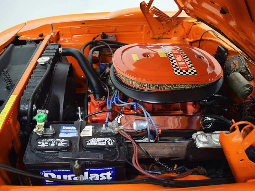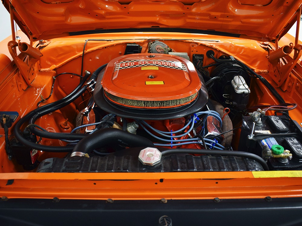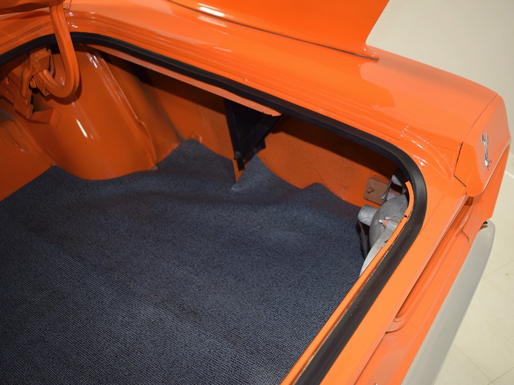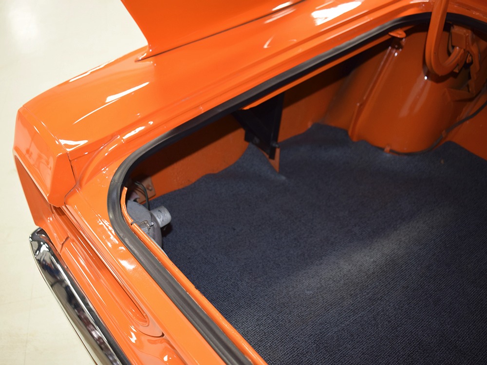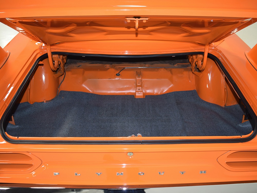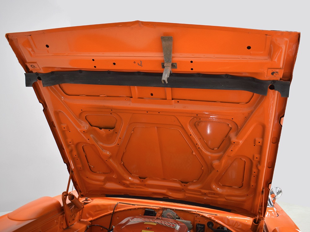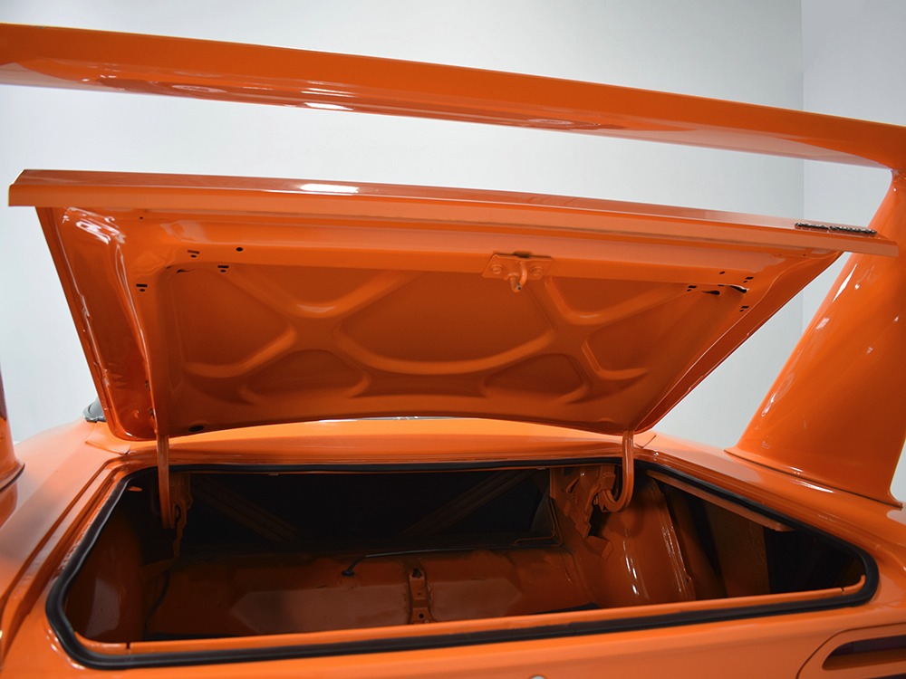 Finding a code P6XW white interior inside a Superbird is unusual but not unheard-of, and it is indeed how this car was originally ordered. The fender tag confirms this, but since it’s a Lynch Road car, the codes are kind of wonky, although it does also confirm bucket seats, a C16 console, the V19 black vinyl top that was unique to the Superbirds, and the EK2 Vitamin-C paint code, of which only 91 were built. We find the bright white upholstery to be very welcoming and it’s brand new, so it just sparkles inside the bright orange ‘Bird. Almost everything you can touch is new, including seat covers, door panels, carpets, and even the dash pad and headliner. The car is equipped with Rallye gauges—and they all work—as well as a set of more accurate Auto Meter dials down on the console for temperature and oil pressure. Only the tachometer is inoperable, but we have not investigated that situation. There’s also an unusual AM/8-track radio, surprising for a Superbird, most of which were lightly optioned. Embroidered floor mats will help keep it looking its best and the trunk is outfitted with a reproduction mat. You’ll note that the heavy-duty support stanchions for the wing are still in place—that wing is reportedly strong enough to support a grown man sitting on it, although I don’t think I’d care to test that claim.