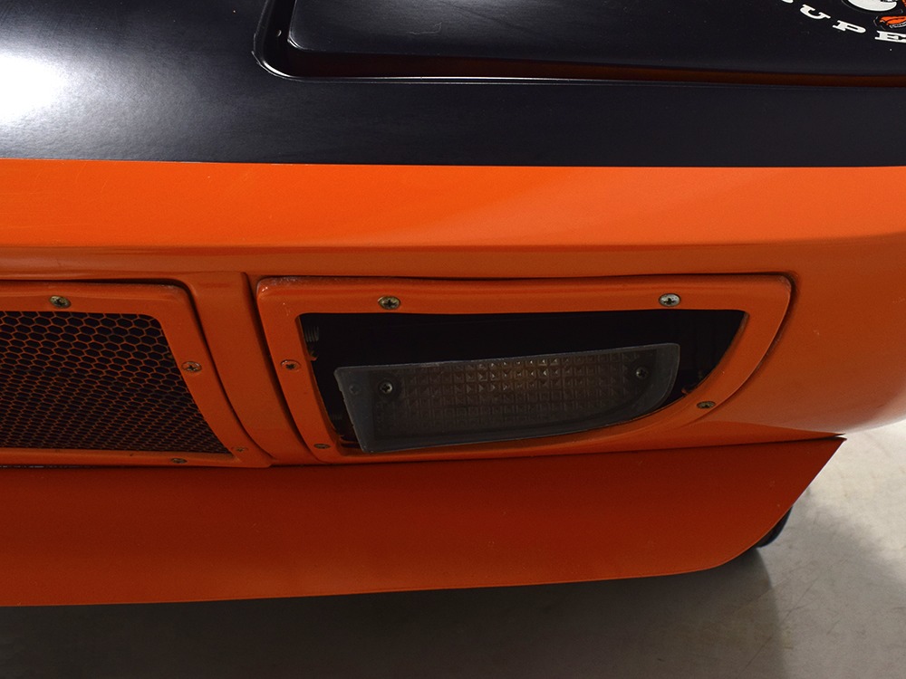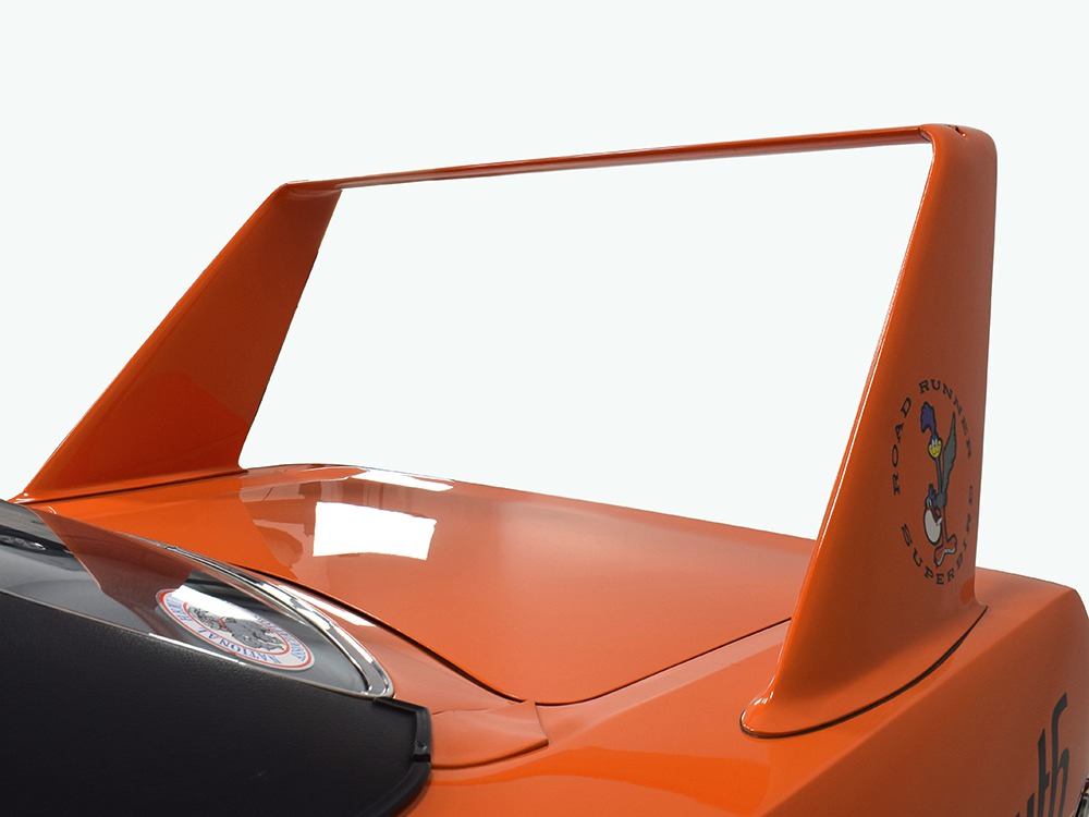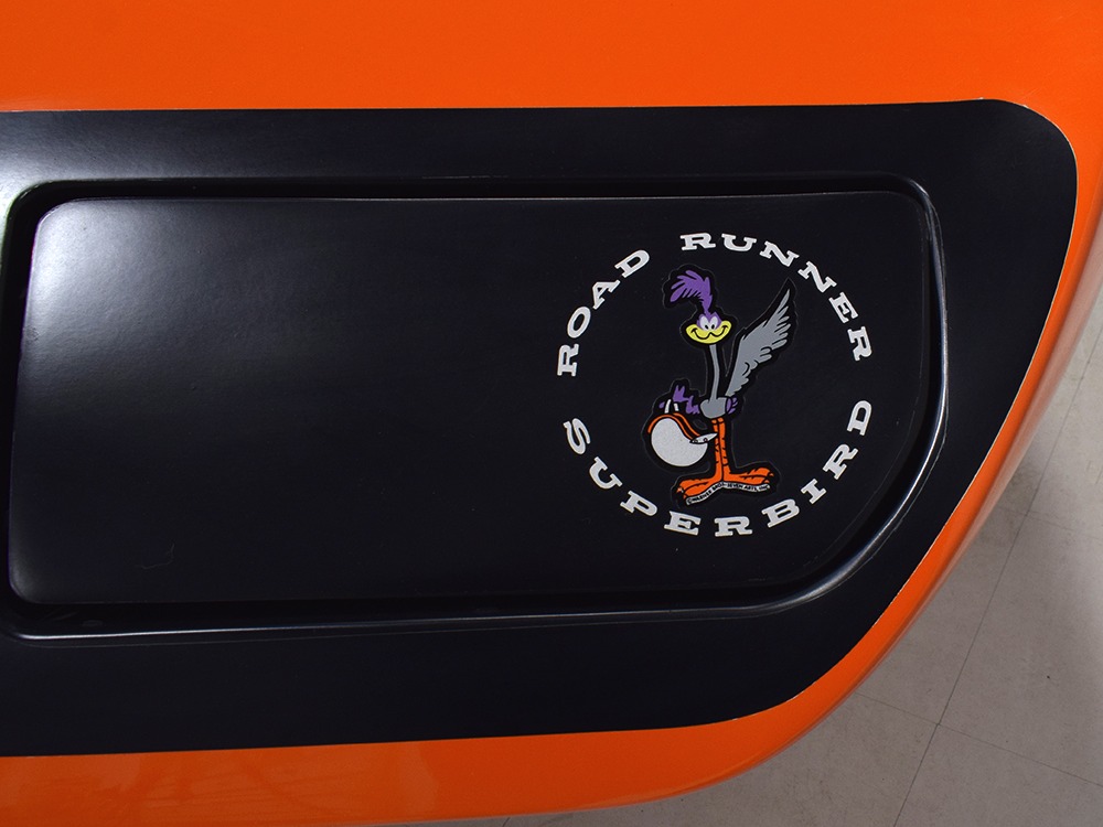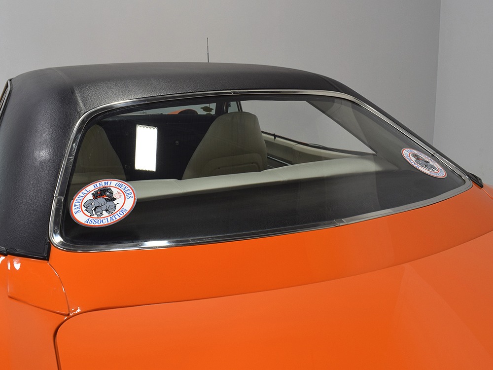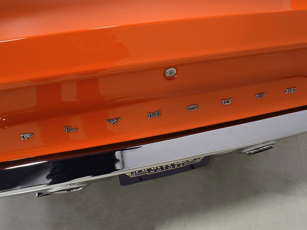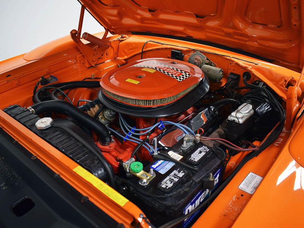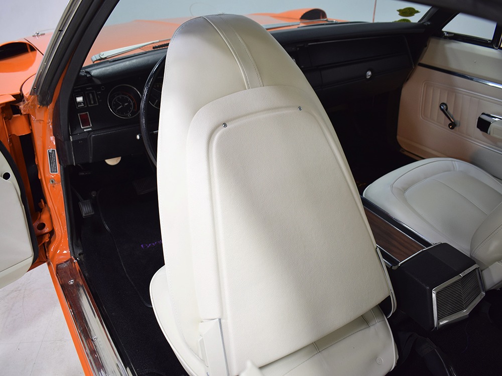 Finding a code P6XW white interior inside a Superbird is unusual but not unheard-of, and it is indeed how this car was originally ordered. The fender tag confirms this, but since it’s a Lynch Road car, the codes are kind of wonky, although it does also confirm bucket seats, a C16 console, the V19 black vinyl top that was unique to the Superbirds, and the EK2 Vitamin-C paint code, of which only 91 were built. We find the bright white upholstery to be very welcoming and it’s brand new, so it just sparkles inside the bright orange ‘Bird. Almost everything you can touch is new, including seat covers, door panels, carpets, and even the dash pad and headliner. The car is equipped with Rallye gauges—and they all work—as well as a set of more accurate Auto Meter dials down on the console for temperature and oil pressure. Only the tachometer is inoperable, but we have not investigated that situation. There’s also an unusual AM/8-track radio, surprising for a Superbird, most of which were lightly optioned. Embroidered floor mats will help keep it looking its best and the trunk is outfitted with a reproduction mat. You’ll note that the heavy-duty support stanchions for the wing are still in place—that wing is reportedly strong enough to support a grown man sitting on it, although I don’t think I’d care to test that claim.