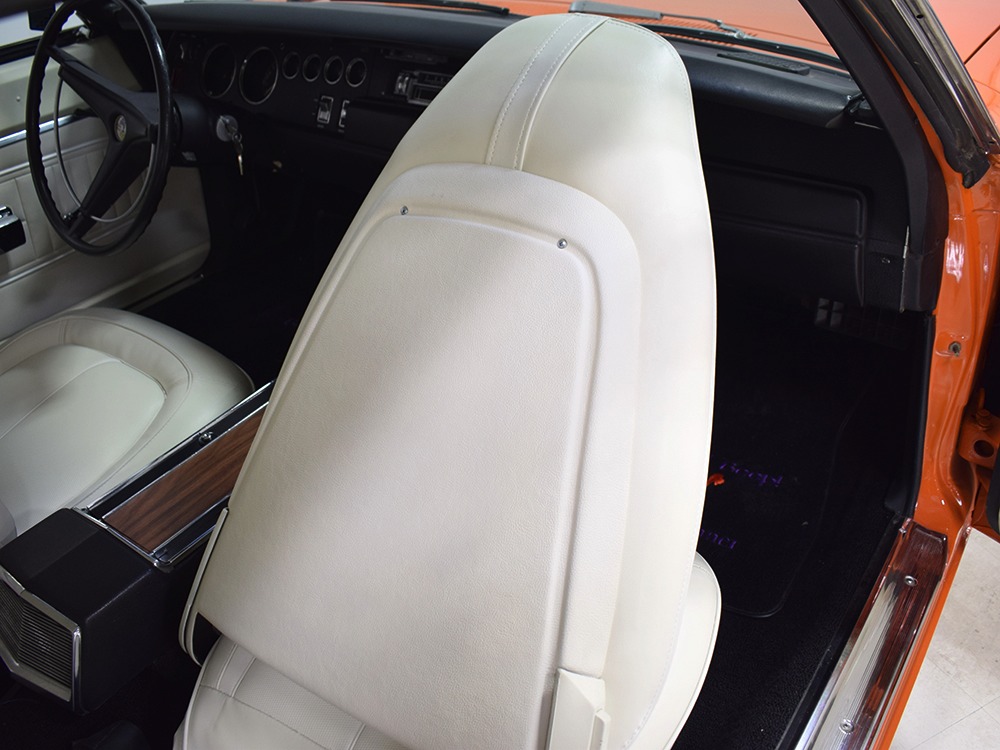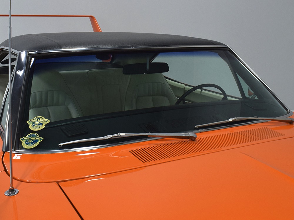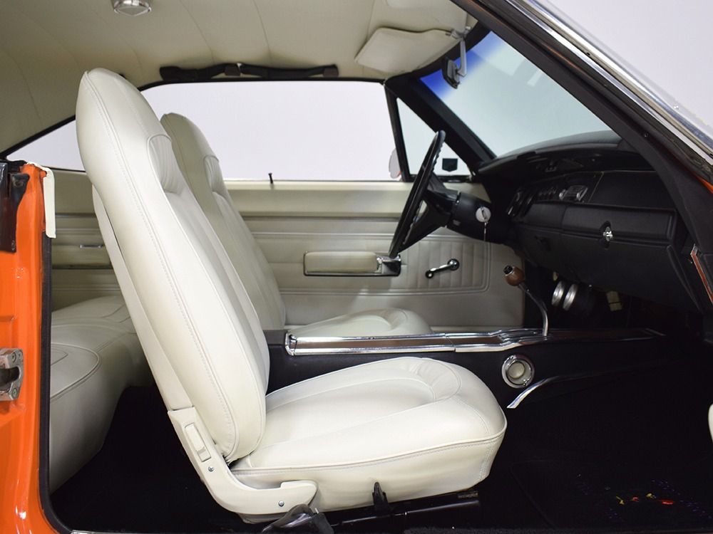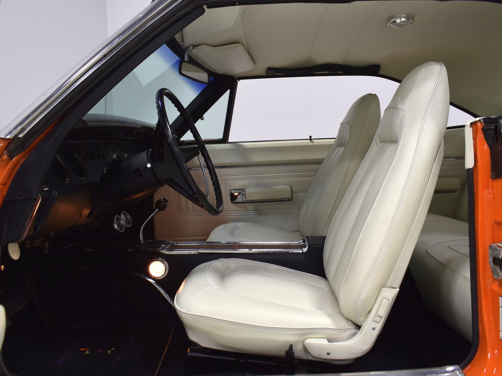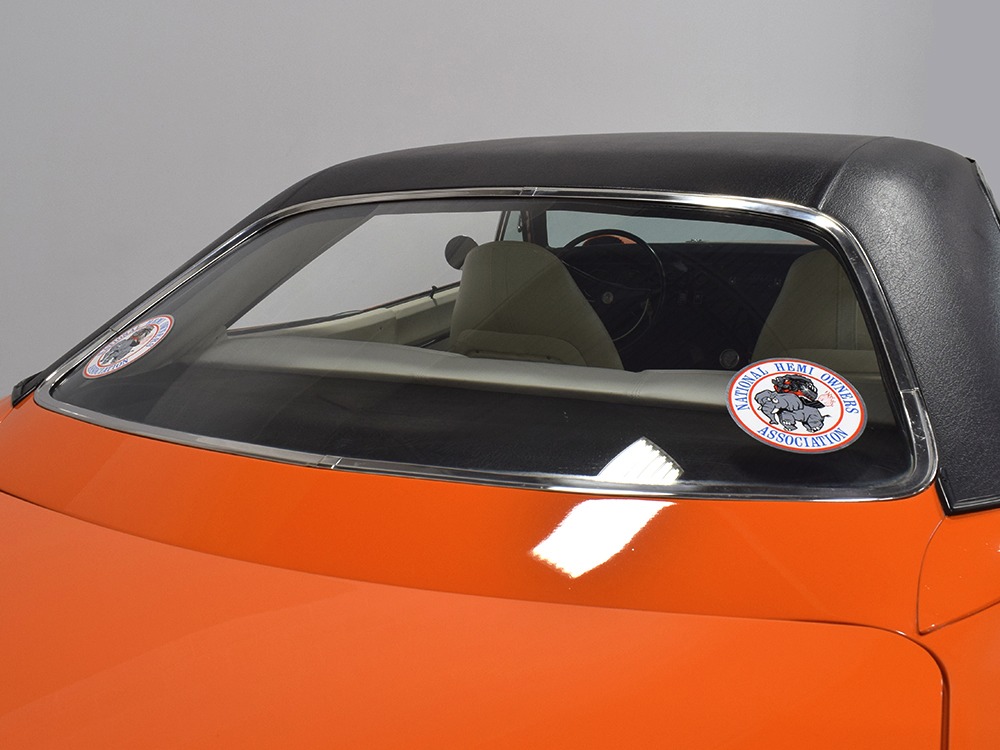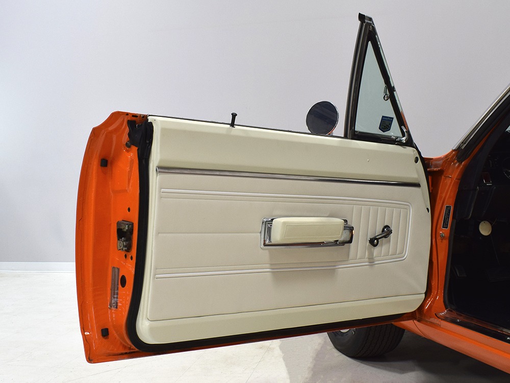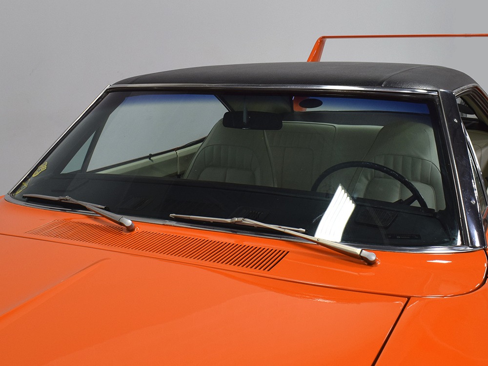 Finding a code P6XW white interior inside a Superbird is unusual but not unheard-of, and it is indeed how this car was originally ordered. The fender tag confirms this, but since it’s a Lynch Road car, the codes are kind of wonky, although it does also confirm bucket seats, a C16 console, the V19 black vinyl top that was unique to the Superbirds, and the EK2 Vitamin-C paint code, of which only 91 were built. We find the bright white upholstery to be very welcoming and it’s brand new, so it just sparkles inside the bright orange ‘Bird. Almost everything you can touch is new, including seat covers, door panels, carpets, and even the dash pad and headliner. The car is equipped with Rallye gauges—and they all work—as well as a set of more accurate Auto Meter dials down on the console for temperature and oil pressure. Only the tachometer is inoperable, but we have not investigated that situation. There’s also an unusual AM/8-track radio, surprising for a Superbird, most of which were lightly optioned. Embroidered floor mats will help keep it looking its best and the trunk is outfitted with a reproduction mat. You’ll note that the heavy-duty support stanchions for the wing are still in place—that wing is reportedly strong enough to support a grown man sitting on it, although I don’t think I’d care to test that claim.