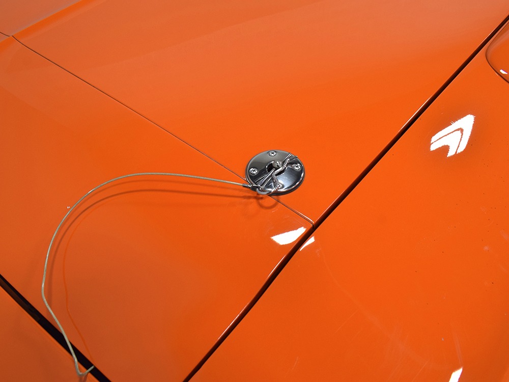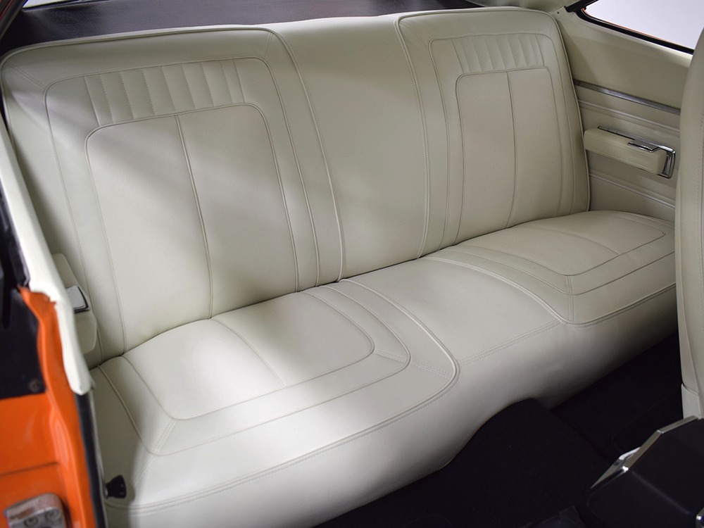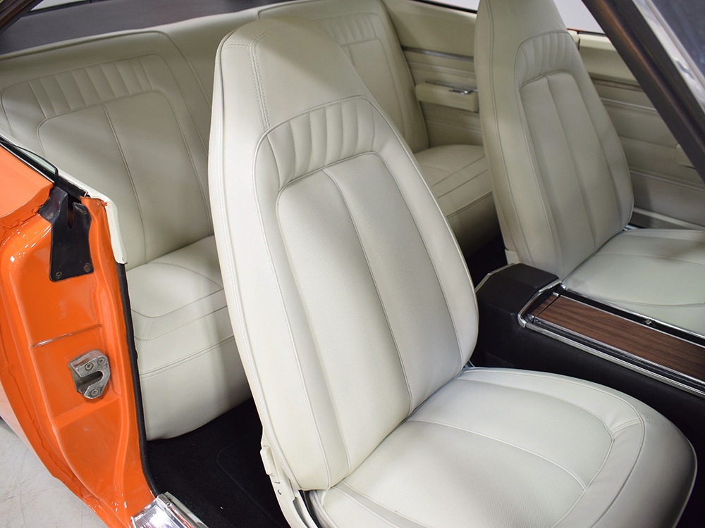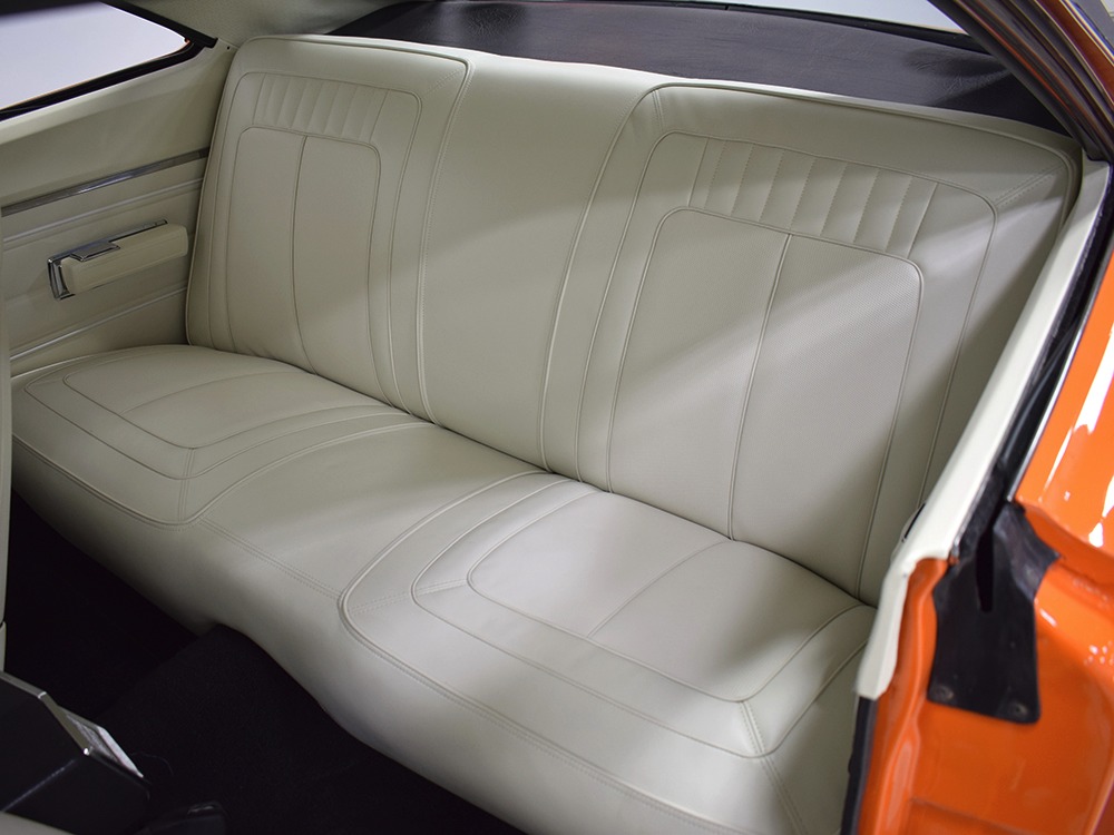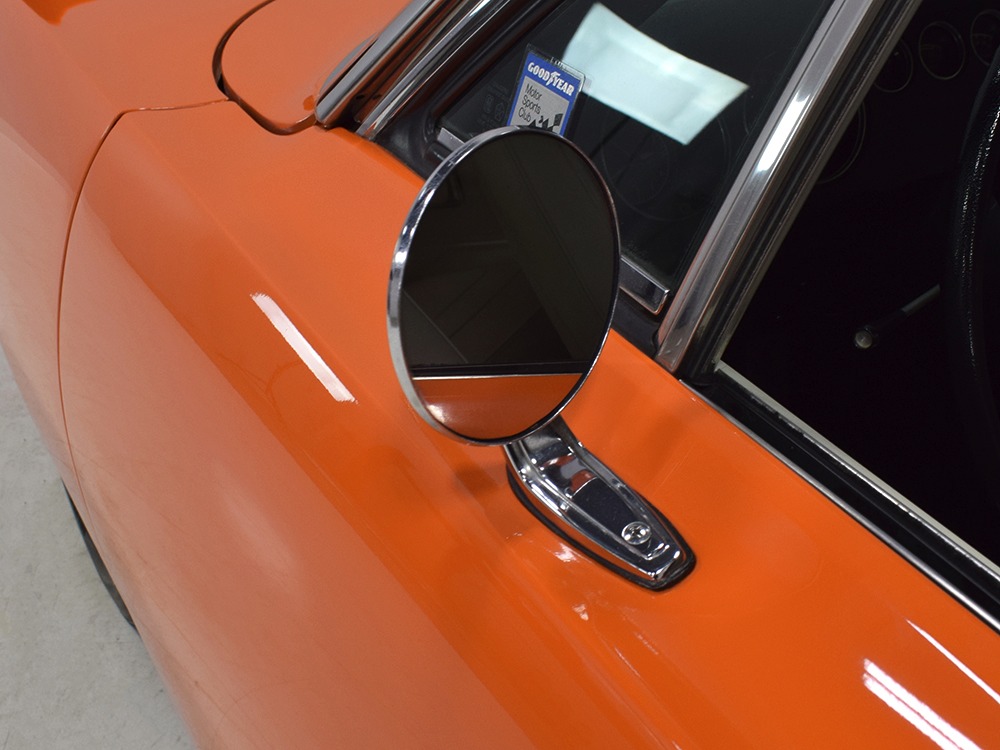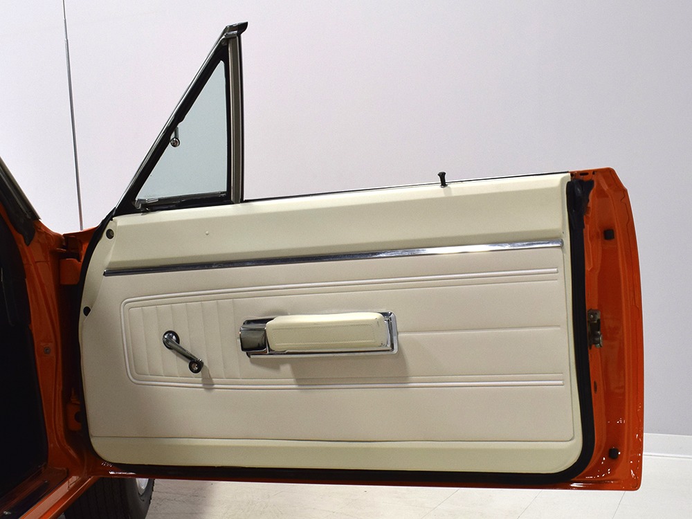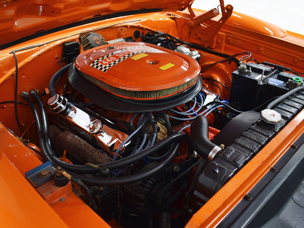 Finding a code P6XW white interior inside a Superbird is unusual but not unheard-of, and it is indeed how this car was originally ordered. The fender tag confirms this, but since it’s a Lynch Road car, the codes are kind of wonky, although it does also confirm bucket seats, a C16 console, the V19 black vinyl top that was unique to the Superbirds, and the EK2 Vitamin-C paint code, of which only 91 were built. We find the bright white upholstery to be very welcoming and it’s brand new, so it just sparkles inside the bright orange ‘Bird. Almost everything you can touch is new, including seat covers, door panels, carpets, and even the dash pad and headliner. The car is equipped with Rallye gauges—and they all work—as well as a set of more accurate Auto Meter dials down on the console for temperature and oil pressure. Only the tachometer is inoperable, but we have not investigated that situation. There’s also an unusual AM/8-track radio, surprising for a Superbird, most of which were lightly optioned. Embroidered floor mats will help keep it looking its best and the trunk is outfitted with a reproduction mat. You’ll note that the heavy-duty support stanchions for the wing are still in place—that wing is reportedly strong enough to support a grown man sitting on it, although I don’t think I’d care to test that claim.