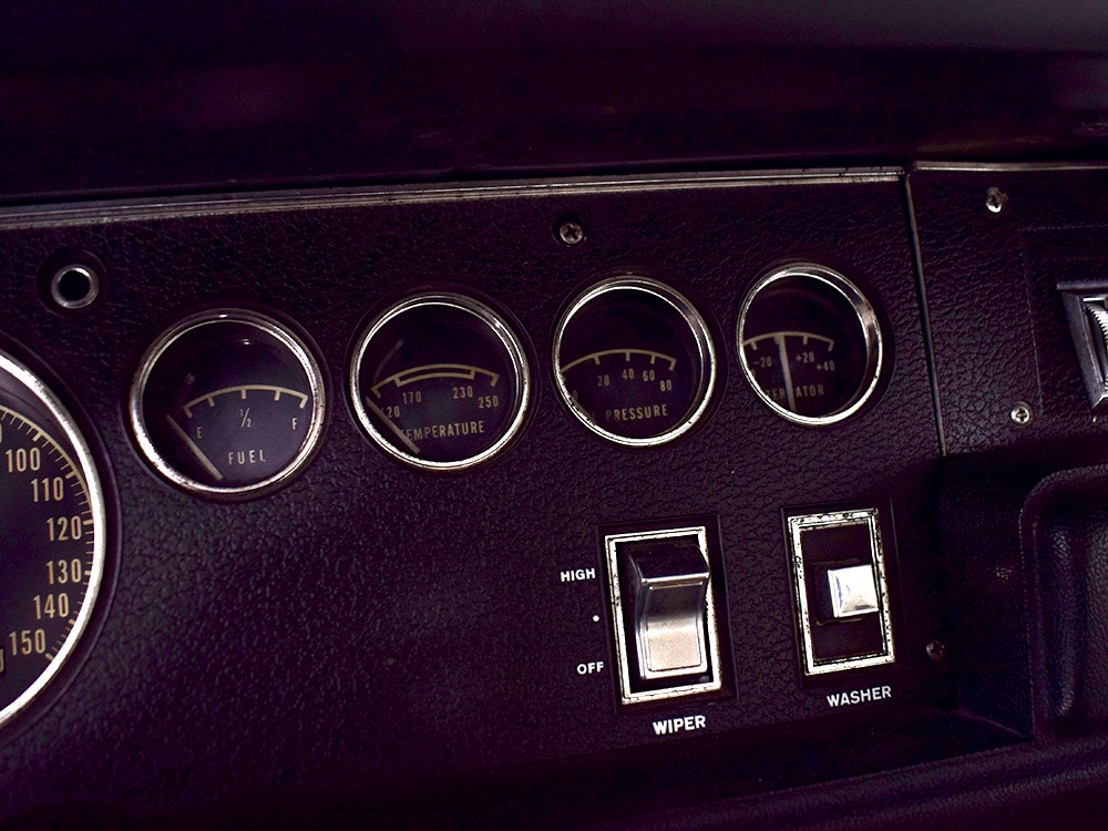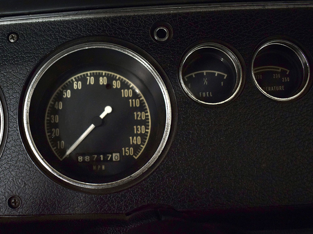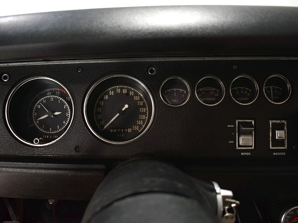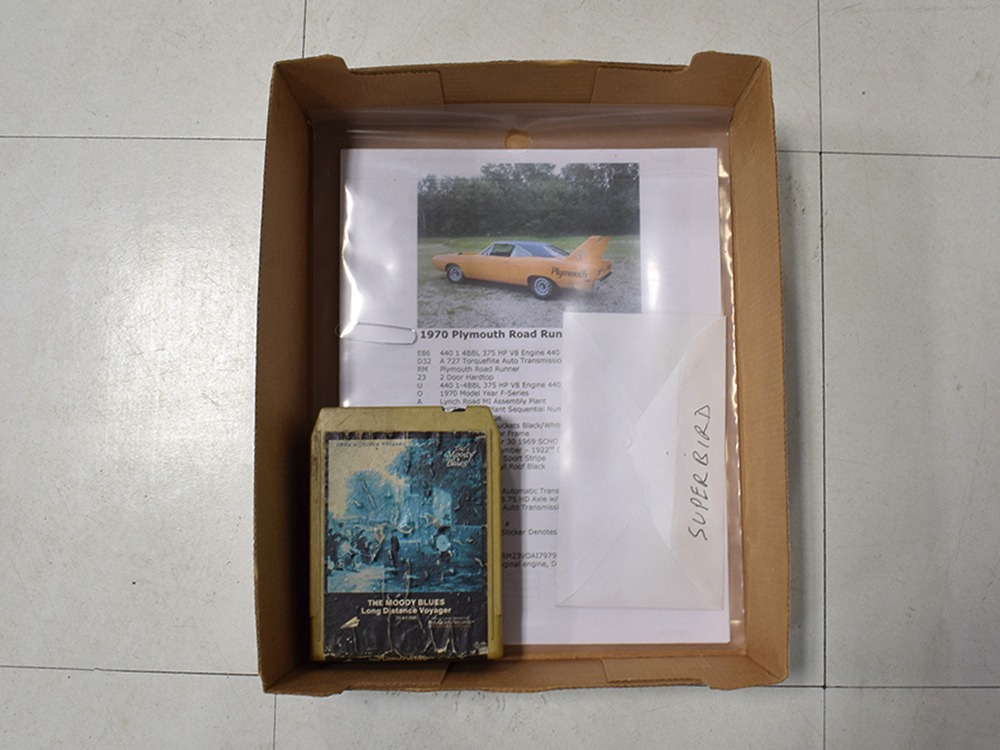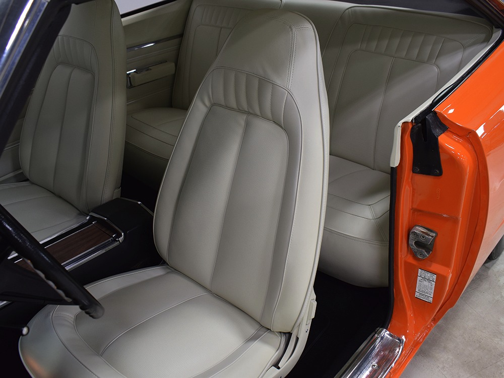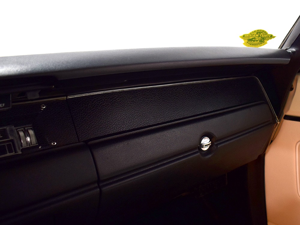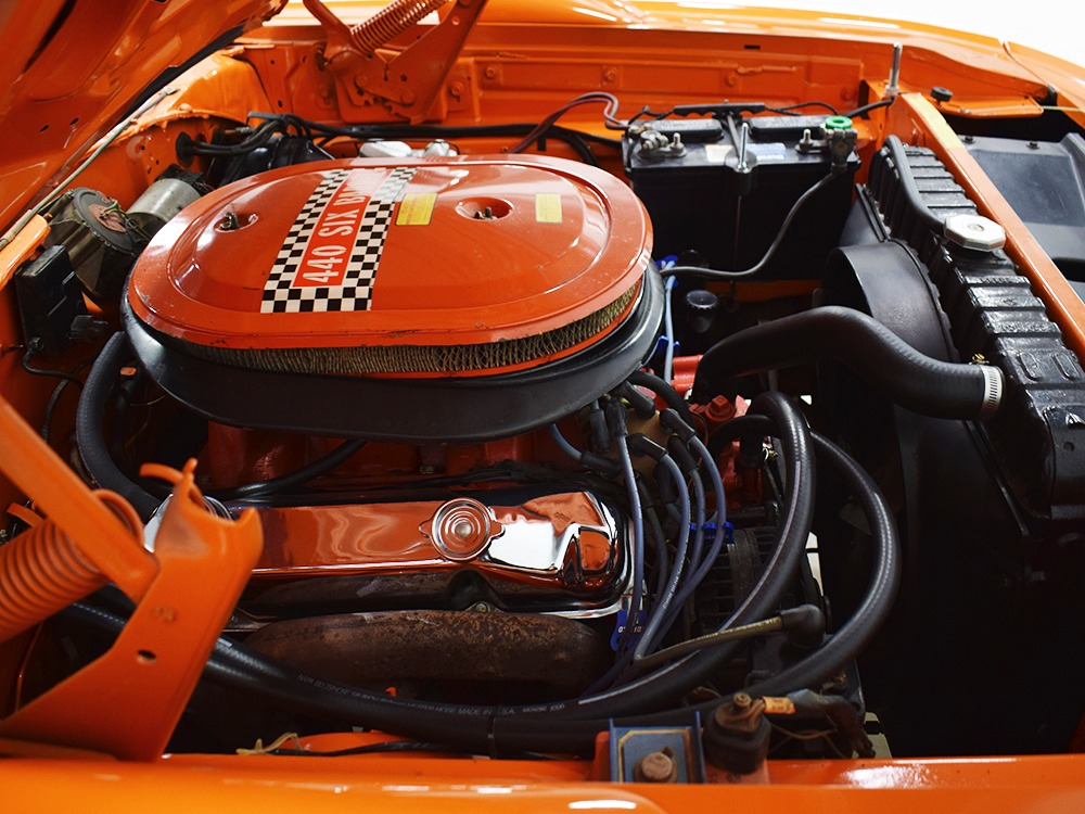 This Superbird also carries its original, numbers-matching 440 cubic inch V8 engine. The cowl tag says that it was originally topped by a 4-barrel carburetor, but as with many Mopars, somewhere along the way it acquired a complete and correct Six Pack setup, which is always a desirable addition (the original 4-barrel carburetor and intake manifold are included with the car). According to the notes in the car’s file, the engine was rebuilt in 1993, which was less than 3000 miles ago, so it remains quite fresh and runs superbly. The carbs are well-tuned so there’s no stumbling or rough idle, and the secondaries come online smoothly without a big hit, just the way they’re supposed to. Aside from a few details, the engine bay is quite correct, with a proper Six Pack air cleaner assembly, Hemi Orange paint on the engine itself, and those wild cast iron exhaust manifolds that go up and over the top of the ports. Power steering and power disc brakes were standard on the Superbird, which is probably a good idea, and all the hardware under the hood is faithful to the original. Change the hose clamps and the ignition wires, and it would look almost totally stock.