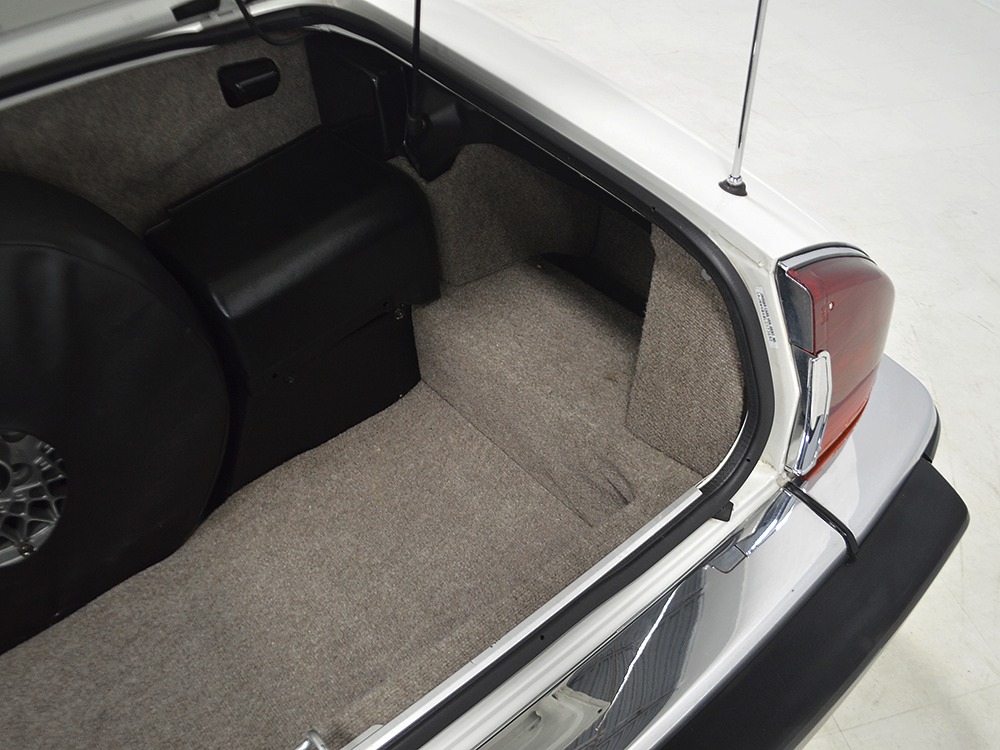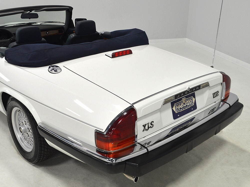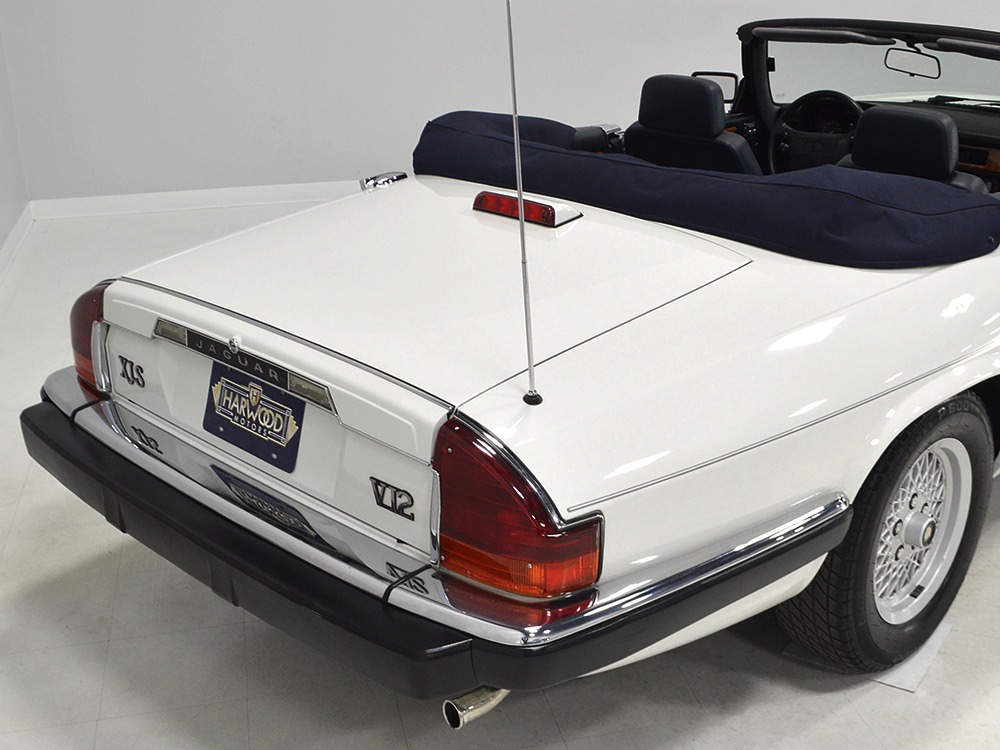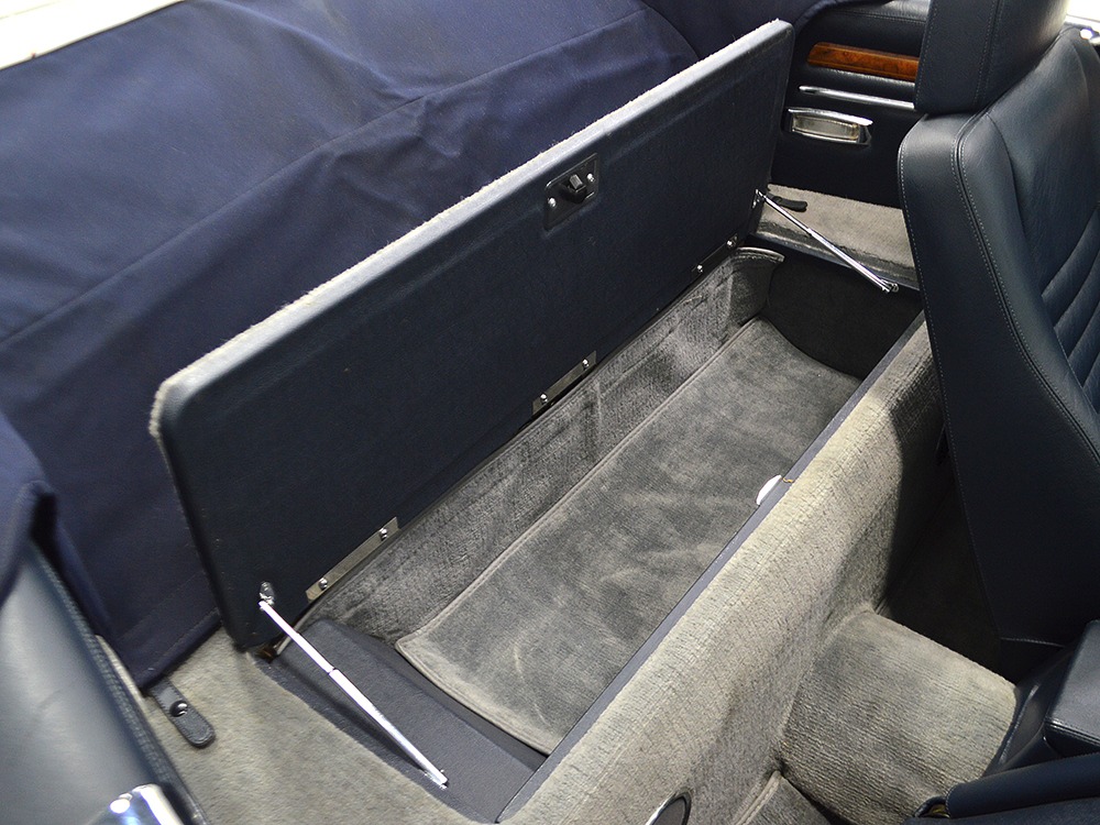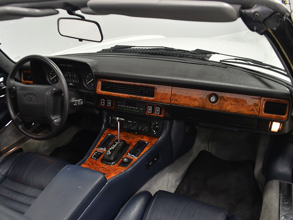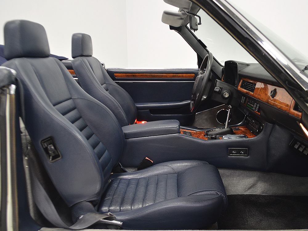 Nobody does interiors better than the British, starting with supple dark blue leather, plus wool carpeting, and real burled walnut on the dash. There are always the magazine clichés about a “gentleman’s club on wheels” but you will surely find that you’ve never driven a car that feels this right when your fingertips glide over the various materials and surfaces. By 1990, the XJ-S was a proper grand touring car, which means everything was standard, including power windows and locks, a powerful A/C system (complements of General Motors), a full set of gauges, and those very supportive heated leather seats. The gauges combine round speedometer and tach with delightful aircraft-style secondary indictors whose needles move vertically and the slender shifter for the automatic transmission should be mandatory study material for today’s interior designers. There are a myriad of buttons on the dash for the trip computer and AM/FM/cassette stereo, but this was the 1990s and buttons were technology. Everything works properly save for the power antenna, and it is obviously in fantastic shape with only light scuffing on the driver’s outer bolster. A matching blue canvas convertible top with heated glass rear window powers itself into a neat stack, where it’s hidden by a matching canvas boot. Jaguar dispensed with the coupe’s vestigial rear seats, instead giving the cabrio a rather nicely upholstered package shelf and a lockable storage compartment underneath. Of course, that’s in addition to the surprisingly spacious trunk, which includes a full-sized spare tire and wheel assembly as well as the battery box.