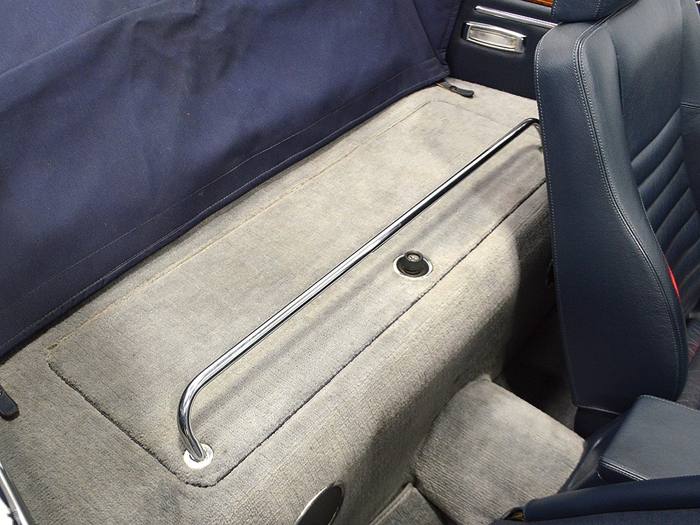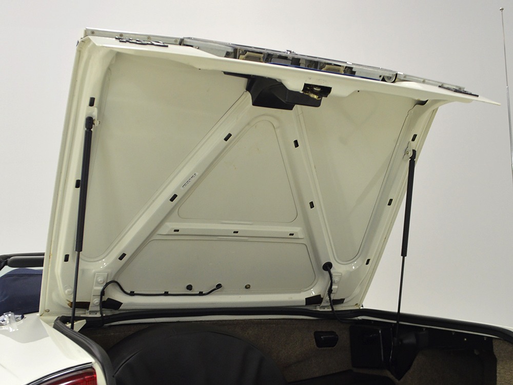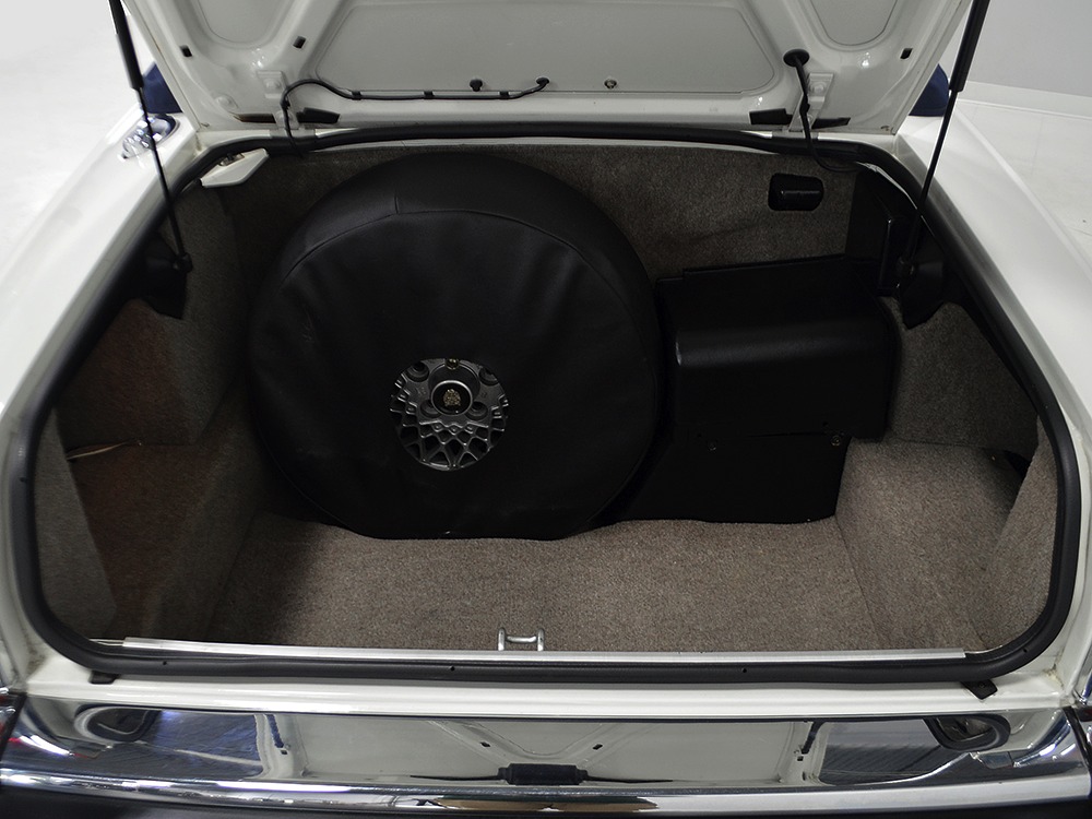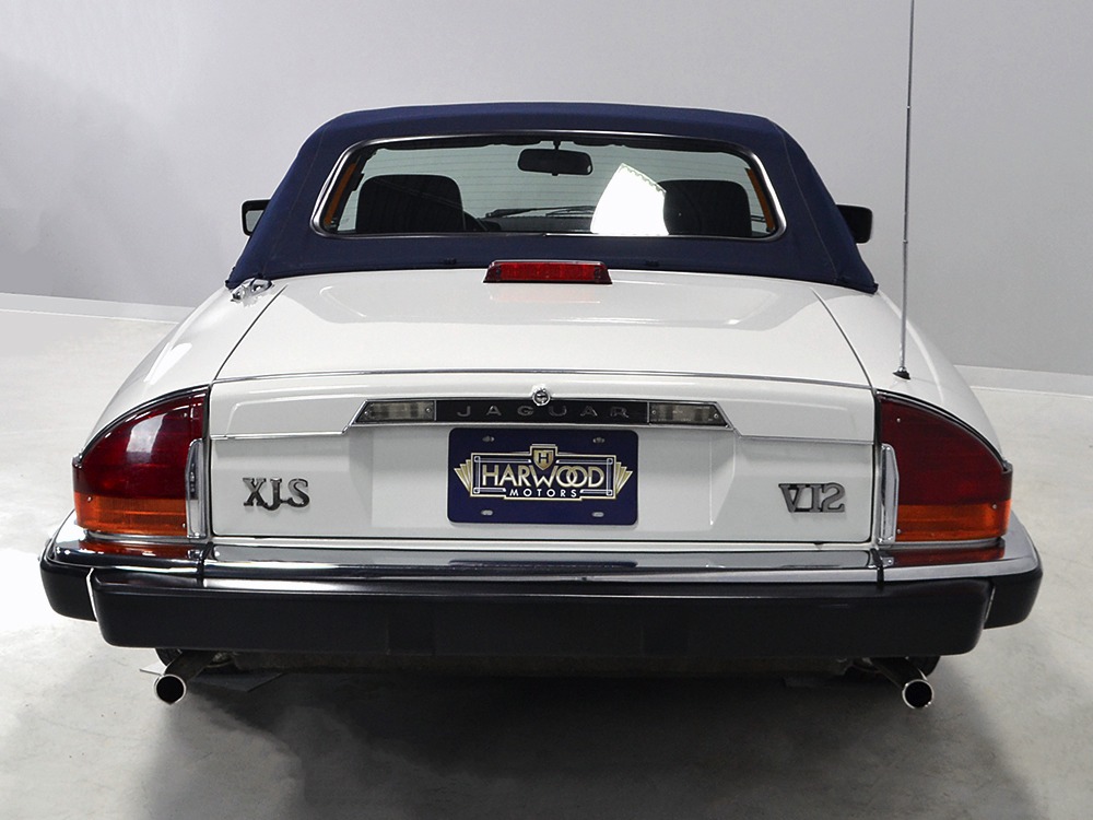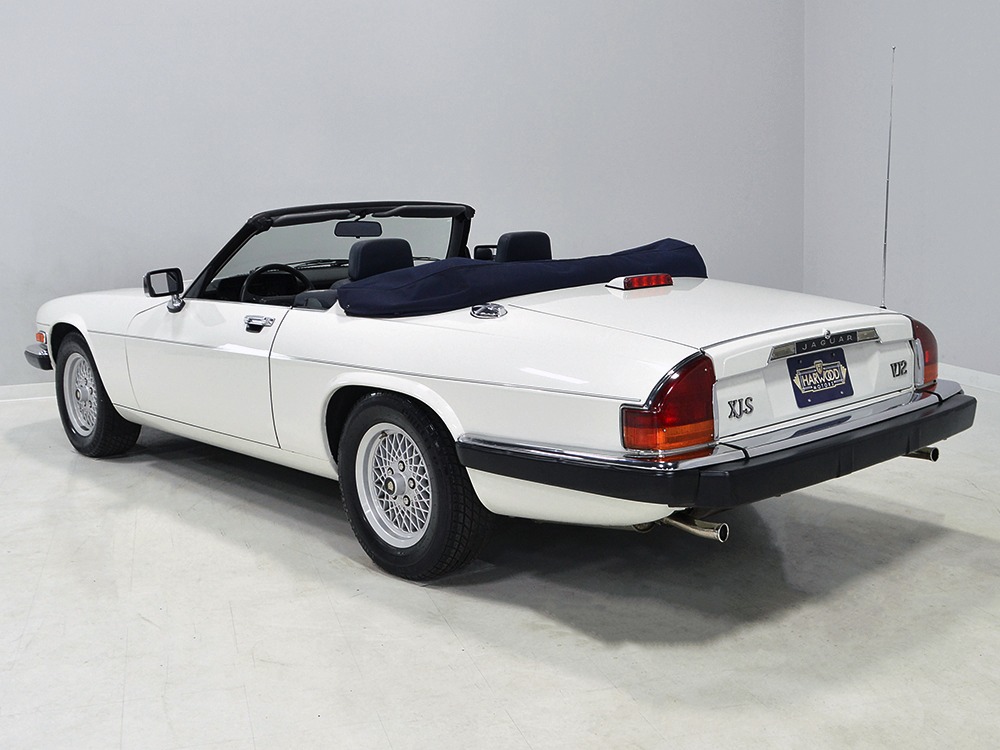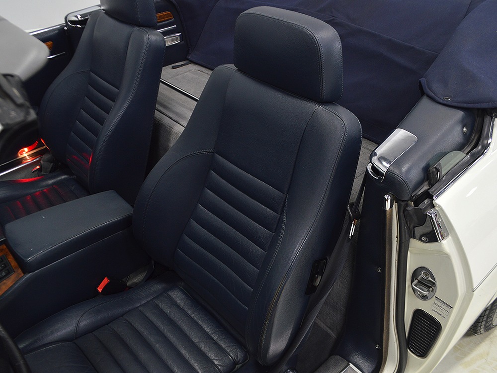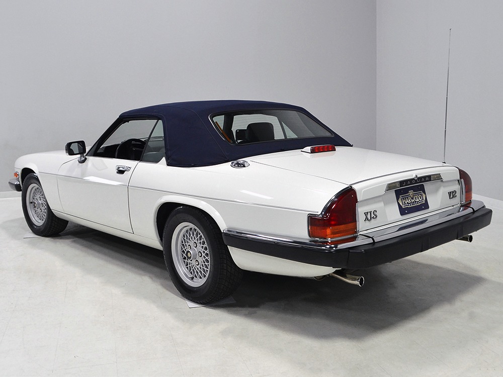 Nobody does interiors better than the British, starting with supple dark blue leather, plus wool carpeting, and real burled walnut on the dash. There are always the magazine clichés about a “gentleman’s club on wheels” but you will surely find that you’ve never driven a car that feels this right when your fingertips glide over the various materials and surfaces. By 1990, the XJ-S was a proper grand touring car, which means everything was standard, including power windows and locks, a powerful A/C system (complements of General Motors), a full set of gauges, and those very supportive heated leather seats. The gauges combine round speedometer and tach with delightful aircraft-style secondary indictors whose needles move vertically and the slender shifter for the automatic transmission should be mandatory study material for today’s interior designers. There are a myriad of buttons on the dash for the trip computer and AM/FM/cassette stereo, but this was the 1990s and buttons were technology. Everything works properly save for the power antenna, and it is obviously in fantastic shape with only light scuffing on the driver’s outer bolster. A matching blue canvas convertible top with heated glass rear window powers itself into a neat stack, where it’s hidden by a matching canvas boot. Jaguar dispensed with the coupe’s vestigial rear seats, instead giving the cabrio a rather nicely upholstered package shelf and a lockable storage compartment underneath. Of course, that’s in addition to the surprisingly spacious trunk, which includes a full-sized spare tire and wheel assembly as well as the battery box.