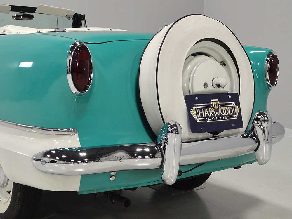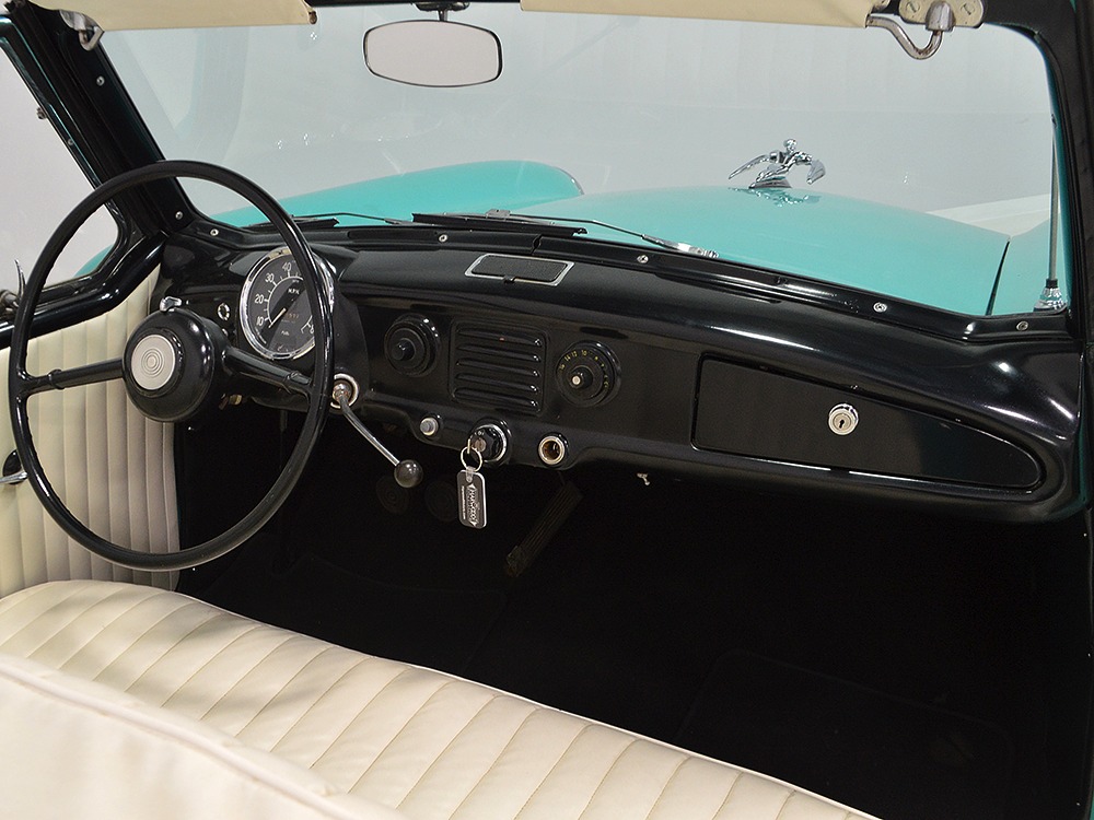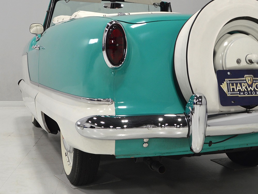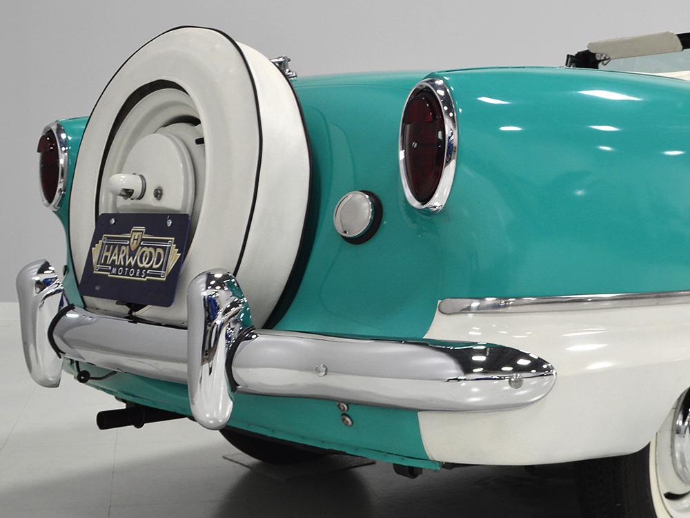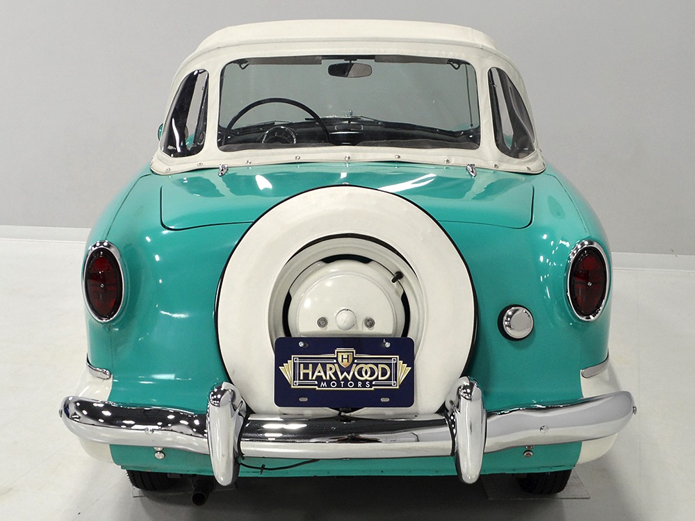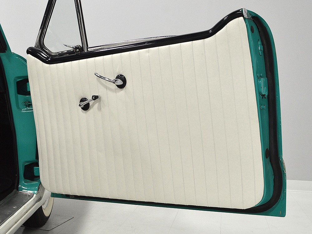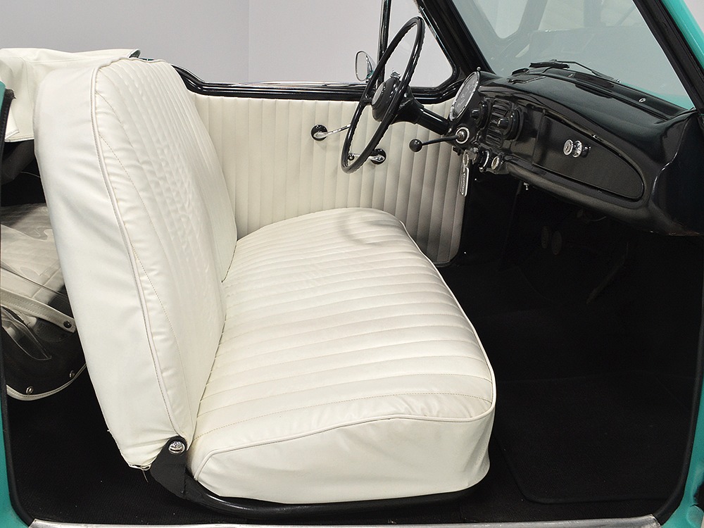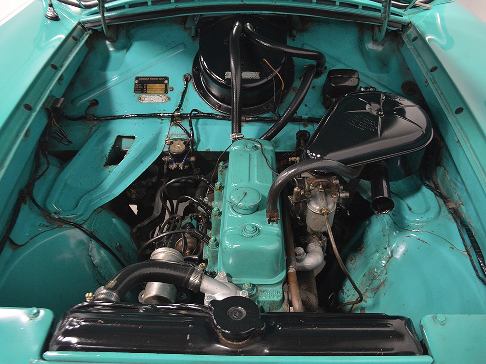 With jaunty and period-perfect Berkshire Green over Frost White paint, this can be nothing other than a product of the 1950s. The styling cleverly hides the car’s small proportions and the semi-skirted wheel openings were a Hudson and Nash styling trademark throughout the ‘50s, so it fits right in. This is a ’62 model, the final year of Metropolitan sales, and as such it has a simpler grille with only a stylized “M” badge to signify Metropolitan. The continental kit out back certainly helps it look substantial and adds space in the trunk area. This is an older restoration that was finished perhaps 15 or 20 years ago, but it is holding up quite well with nice paint that has a soft shine like period enamel. The cut lines and trim are right, the body fits together well, and we can find almost no evidence that this was ever a rusty car. It is not perfect, of course, but for a car that you’re going to drive and enjoy, it’s certainly going to get a lot of waves out on the road. It’s also got nice chrome and trim, including the Series III hood ornament with a touch of whimsy that’s ideal for the Met’s personality. If you want one to drive, this is a great choice.