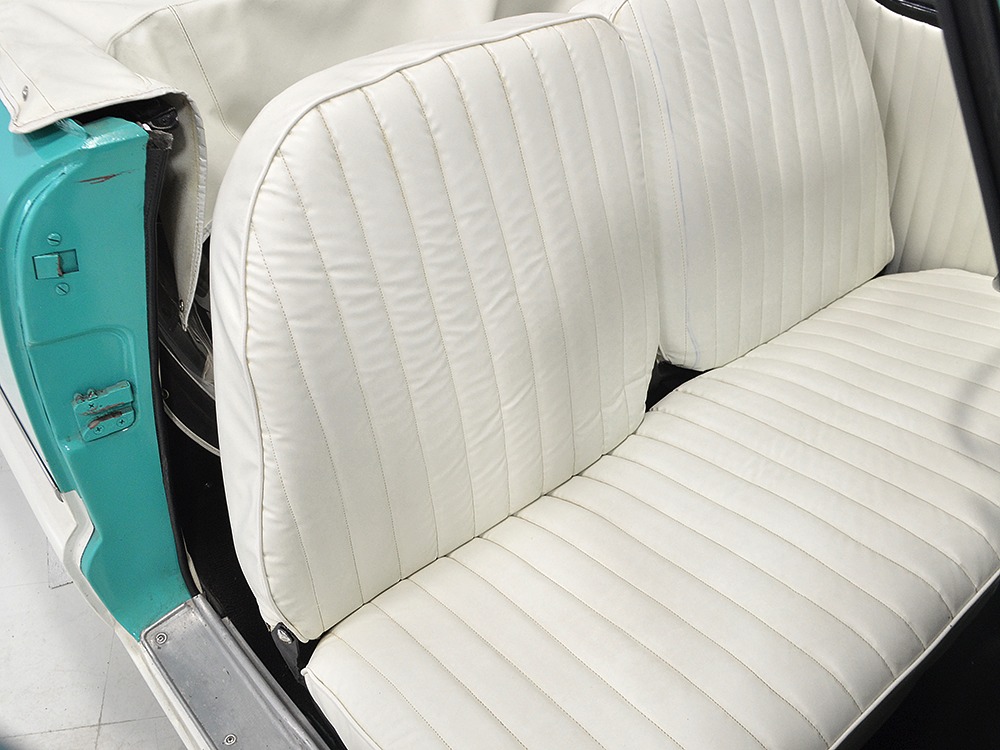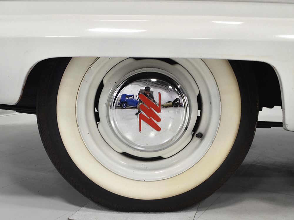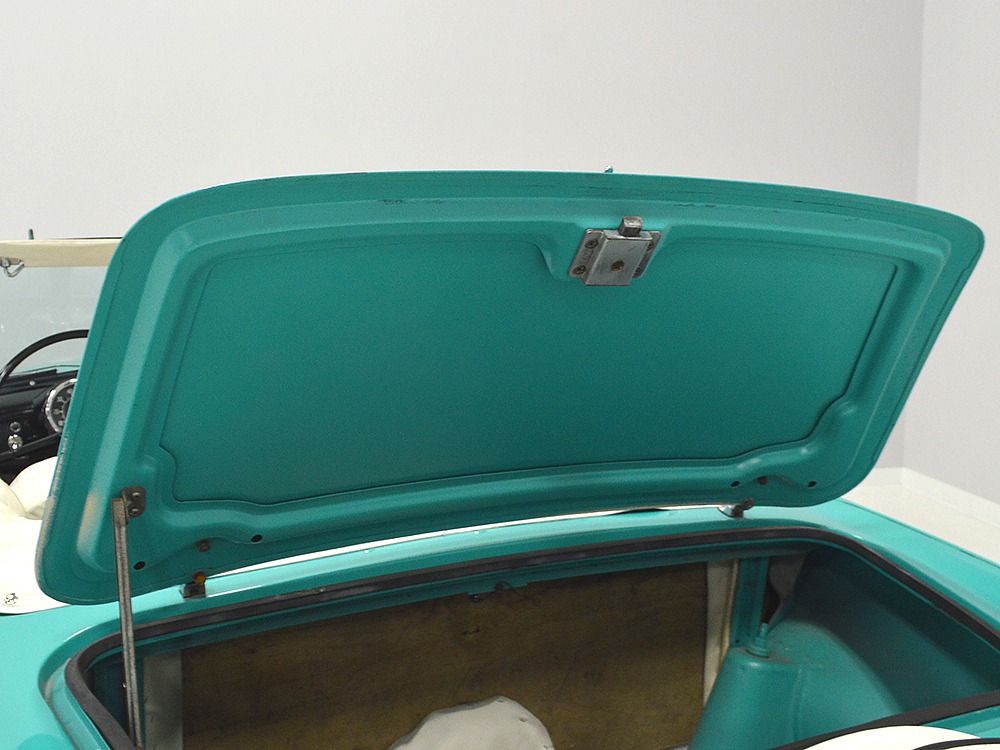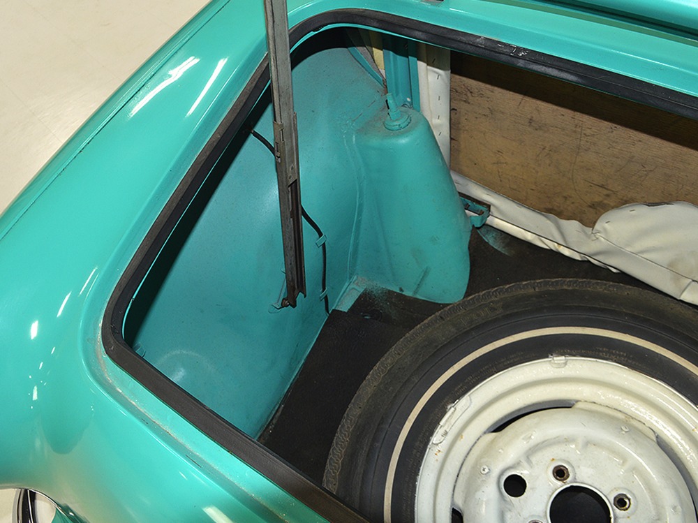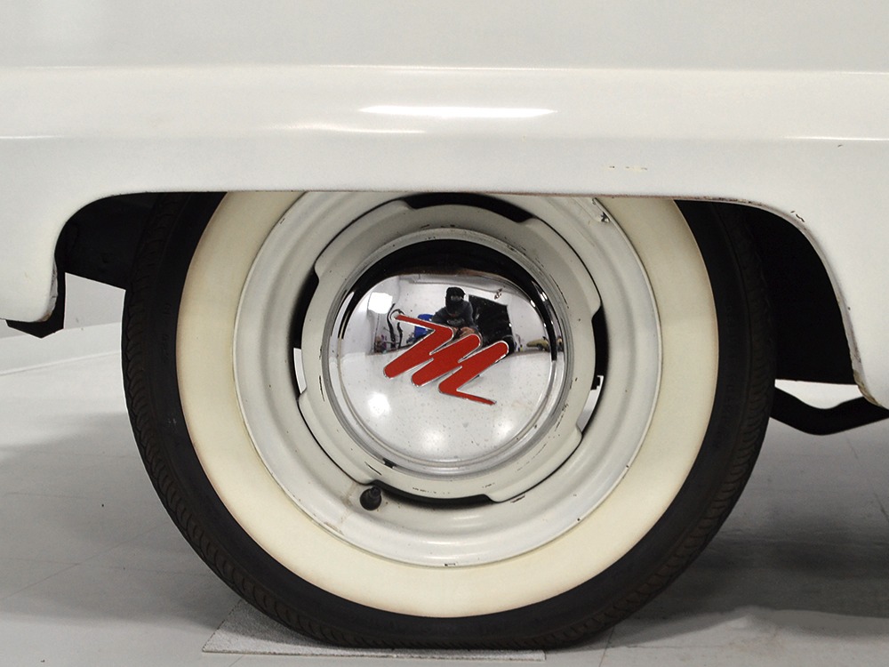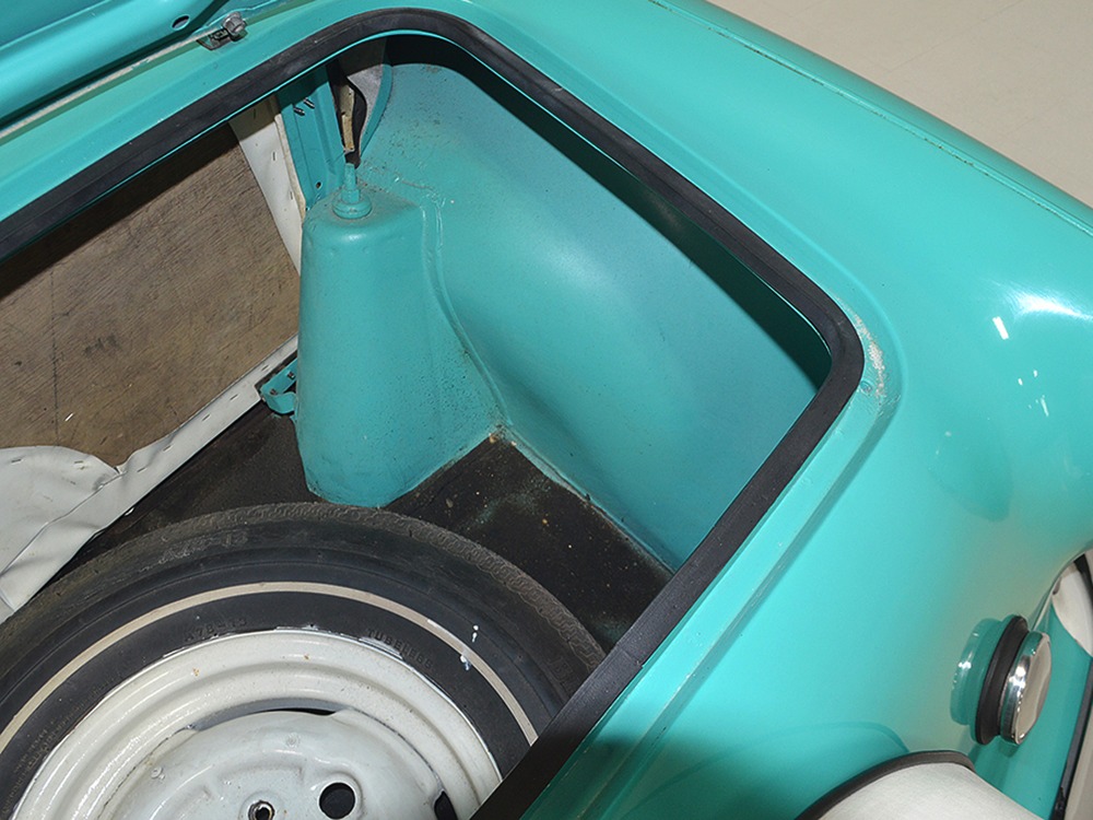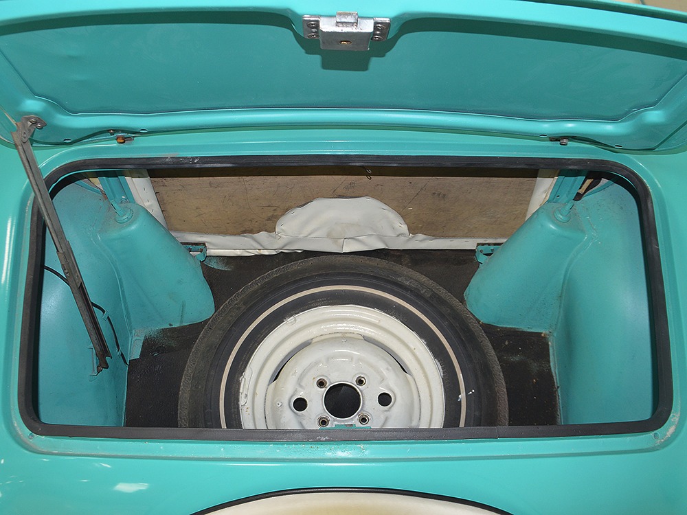 The interior isn’t quite correct with its white vinyl pleats, but it’s durable and, more importantly, weatherproof. The pattern looks very right for the period and the workmanship is good enough to work with the rest of the car. The material cleans up easily and is virtually impervious to moisture and dirt, so it should look great for years to come. Black carpets match the black dashboard to keep it from being white overload and despite its size, there’s a modest back seat that’s ideal for kids. Technically, the Met was designed in England, so the single gauge pod with speedometer and fuel gauge shouldn’t be too surprising and the steering wheel with its integral turn signal lever should feel familiar to MG and Triumph owners as well. The 3-speed manual shifter looks a little odd but it works just fine and the neat headlight switch integrated with the ignition key keeps the dash looking tidy. An accessory AM radio still lives in the dash, although it is sadly inoperable. The convertible top fits reasonably well and has no serious marks or tears, and while the trunk opening is way up high, there’s plenty of room in there, even with a spare wheel and tire assembly.