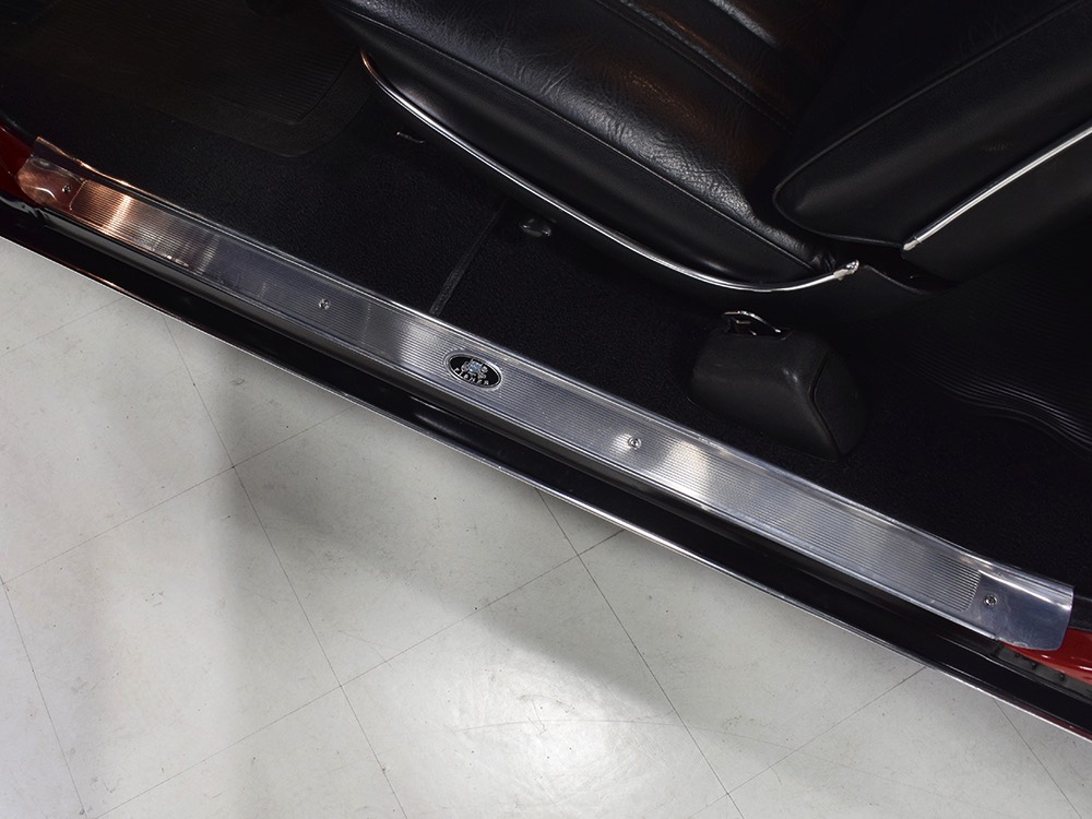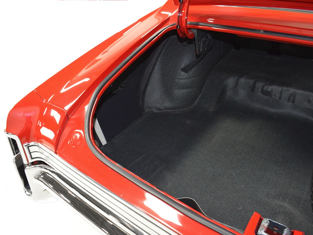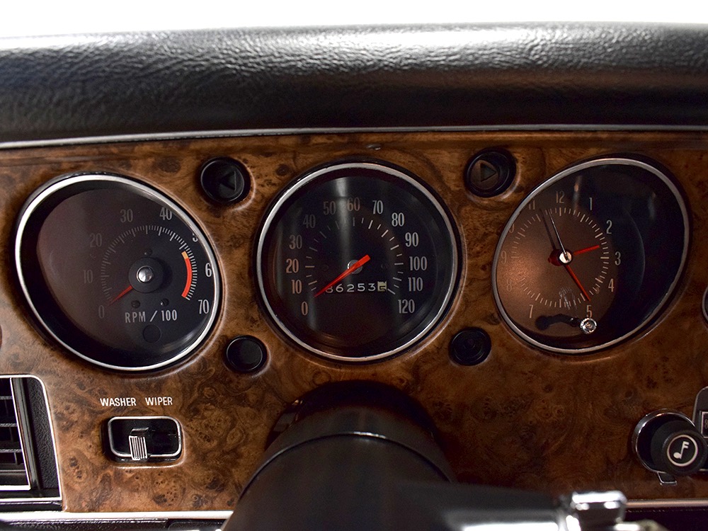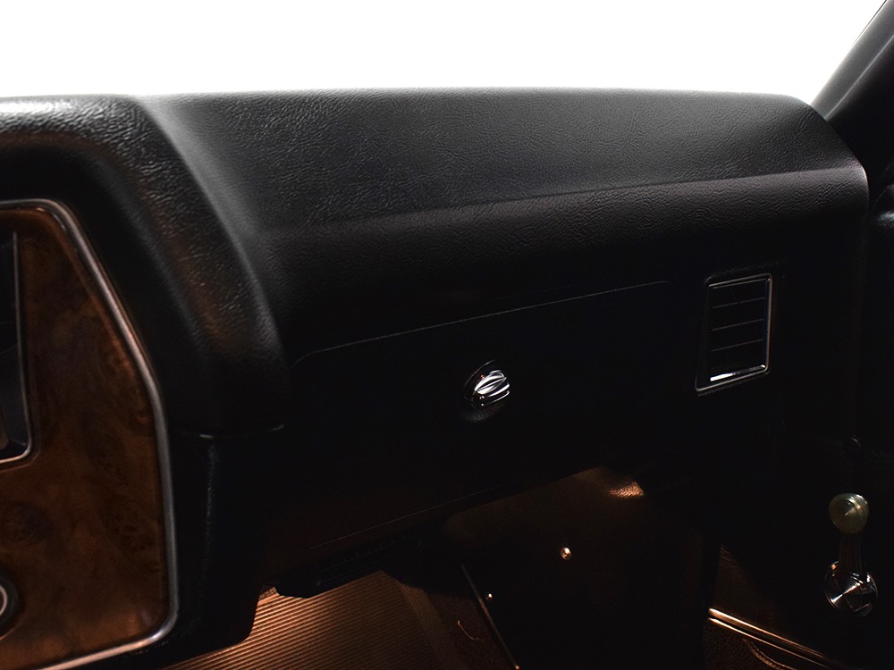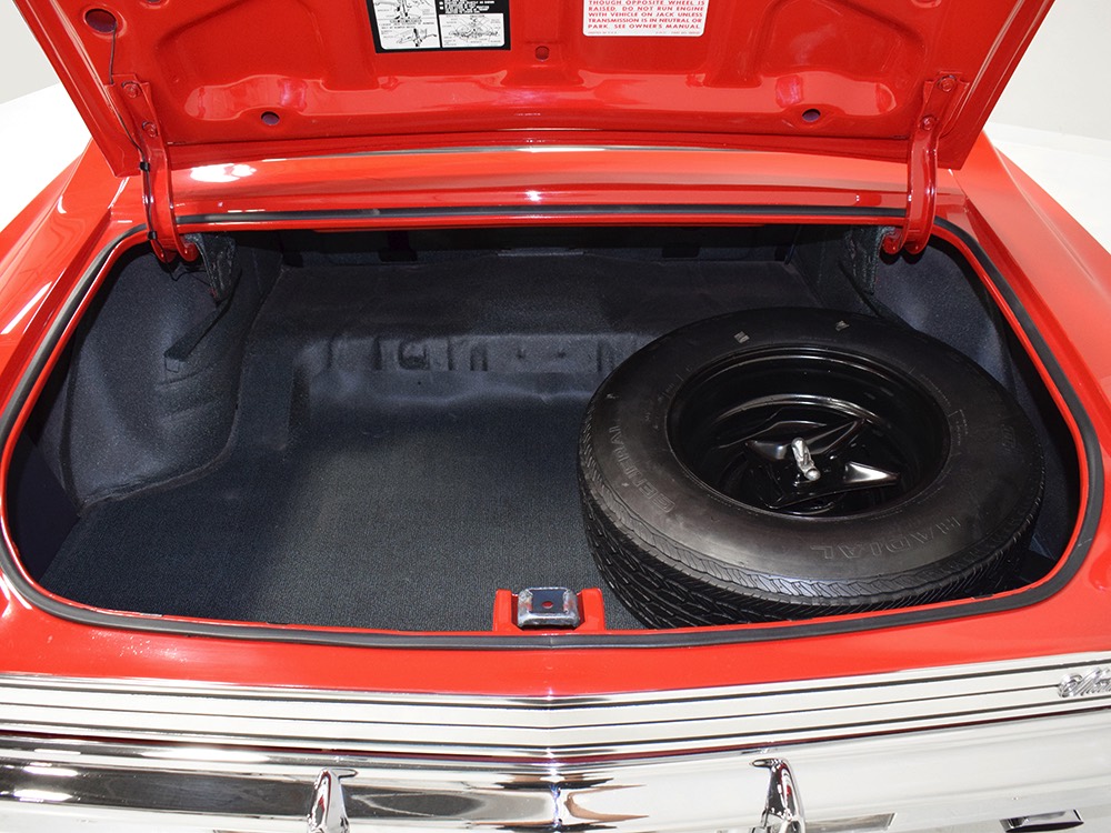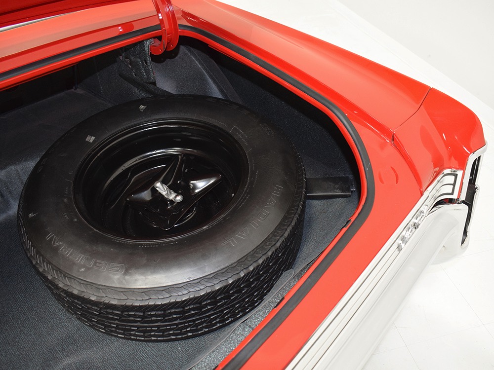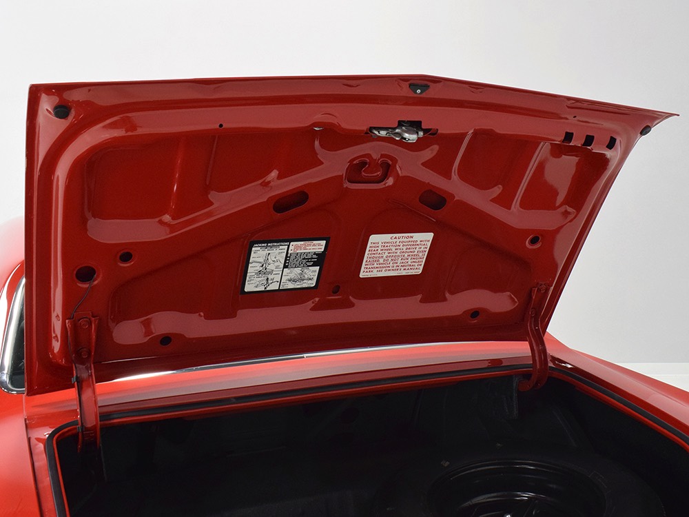 Believe it or not, the code 708 black vinyl interior with A51 bucket seats is almost entirely original. It was carefully removed during the restoration and every surface was cleaned and rejuvenated, and the carpets were replaced. The only detail that you might notice is that the seats were swapped so that they’d wear more evenly, although you probably can’t tell just by looking that one chair is more worn than the other. The preservation is really remarkable and it’s a tribute to the exceptionally fastidious fellow who performed the restoration. The burled walnut appliques on the dash and console are still bright and crisp, the gauges are downright beautiful, and everything works, including the rather rare tachometer. Even the original AM/FM radio is still in the dash. The A/C blows cold and still uses R12 inside the system for optimum performance and the horseshoe shifter remains our favorite way to select gears with an automatic. The new carpets are protected by a set of heavy-duty rubber mats, and you’ll note that even all the interior lights are fully operational. The fully restored trunk has been refinished with correct spatter paint and fitted with a correct mat, jack assembly, and what might just be the car’s original spare tire.
