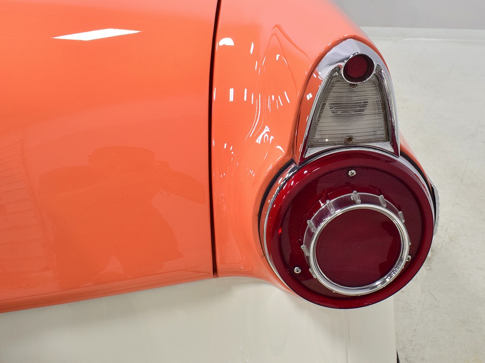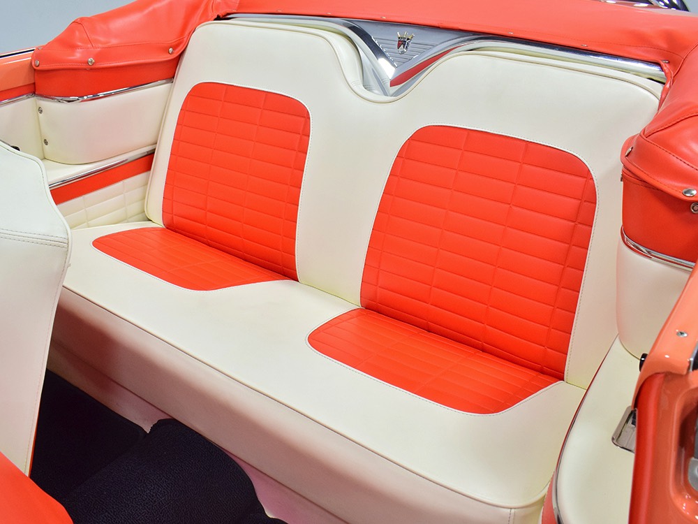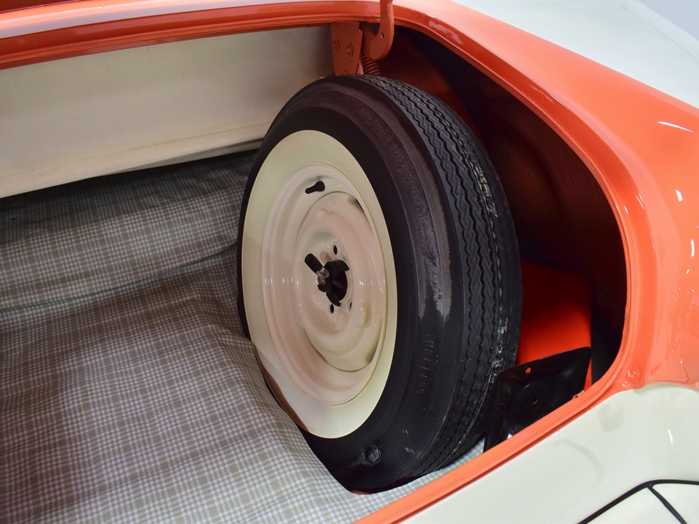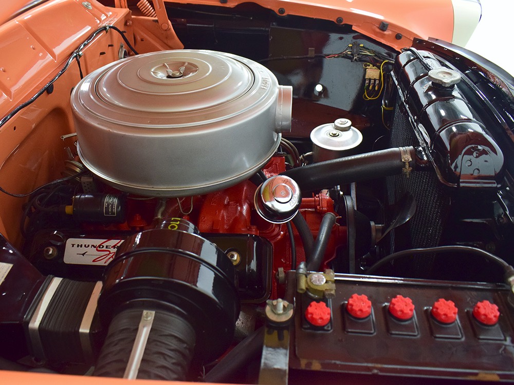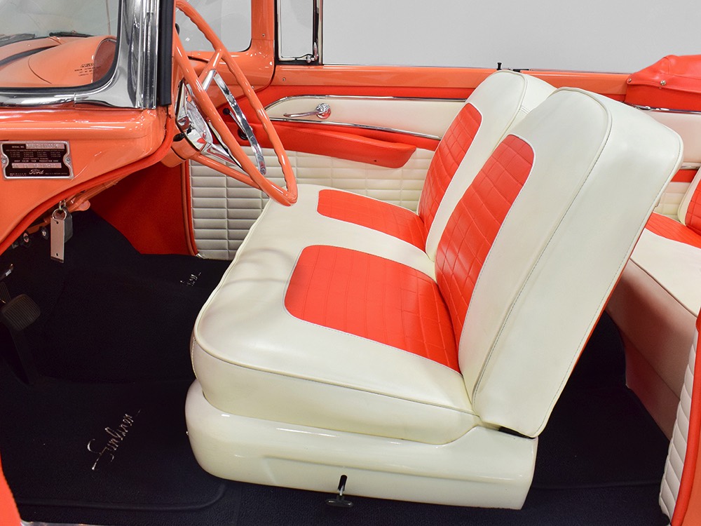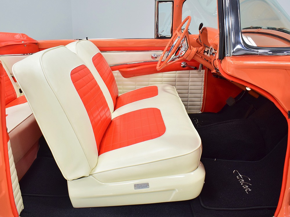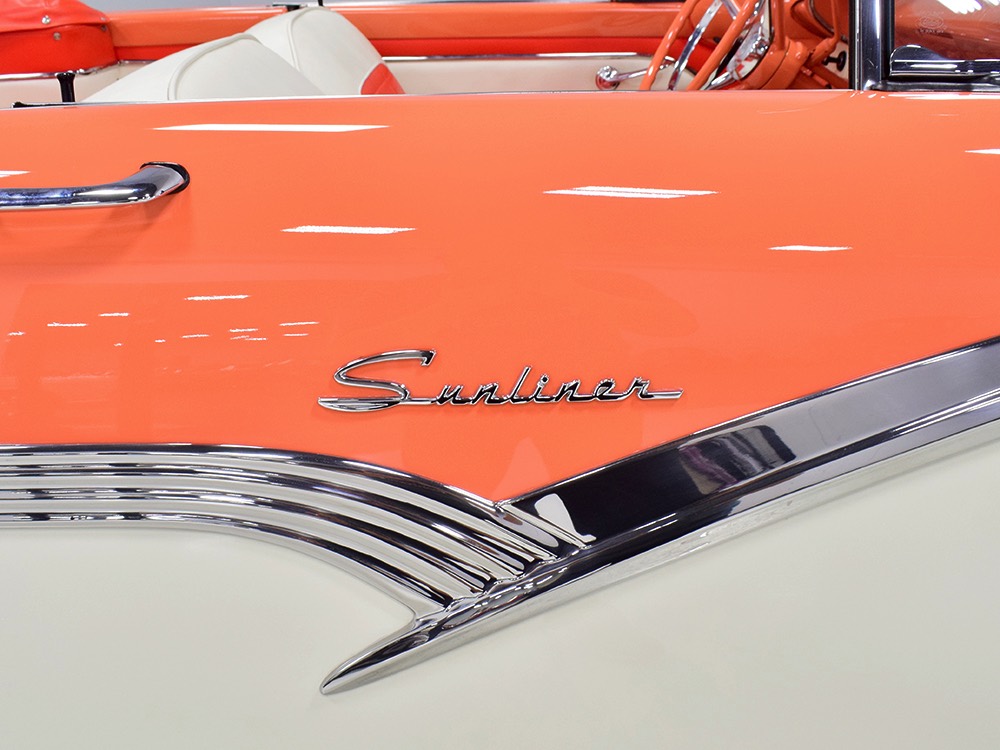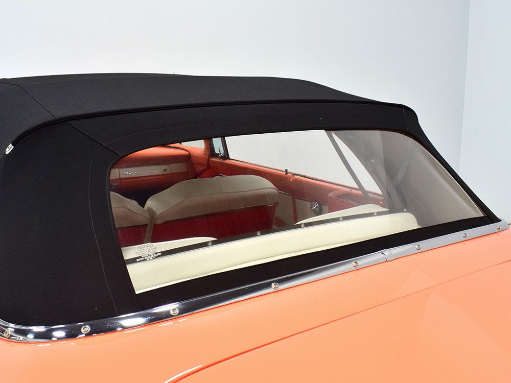 This stunning car comes from the estate of a collector who insisted on the very best, and the Sunliner certainly measures up. The striking color combination is authentic to the car, with the door tag showing code EN, which is Mandarin Orange over Colonial White. It’s just right for the ‘50s and don’t worry, the Mandarin Orange part isn’t too orange and it isn’t too pastel. It looks fantastic! Paint and bodywork are exceptional, with excellent gaps and panel alignment, befitting a car of this quality. The restoration was finished a few years ago but it shows few signs of use—just enough that we can’t quite call it perfect. The optional continental kit out back makes it look especially long and sleek and the many little details make it delightful to examine up close. The fluted side trim ends in painted “exhaust ports”, the delicate ‘Sunliner’ script on the doors makes it look official, and the awesome recessed hood ornament epitomizes the jet age in which it was born. All the bright stuff is fully restored to show condition and you’ll note that even the rear bumpers, through which the exhaust is routed, aren’t discolored. This car has been superbly maintained since it was completed.