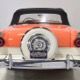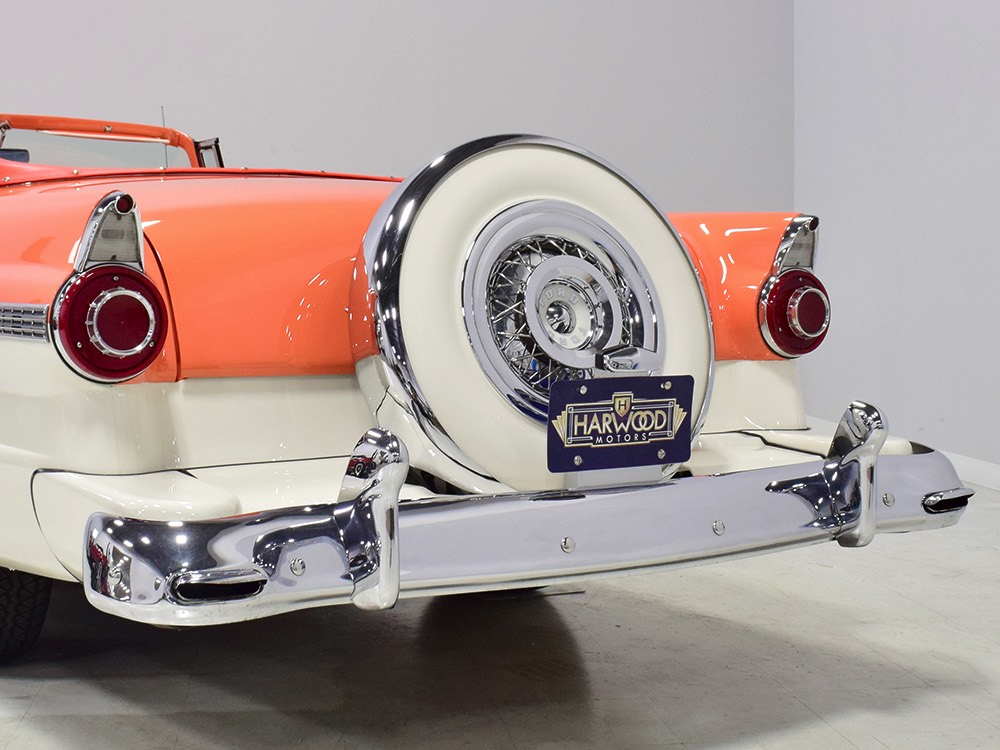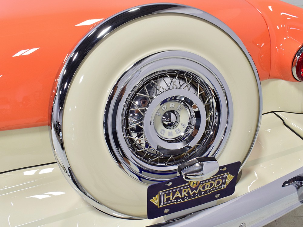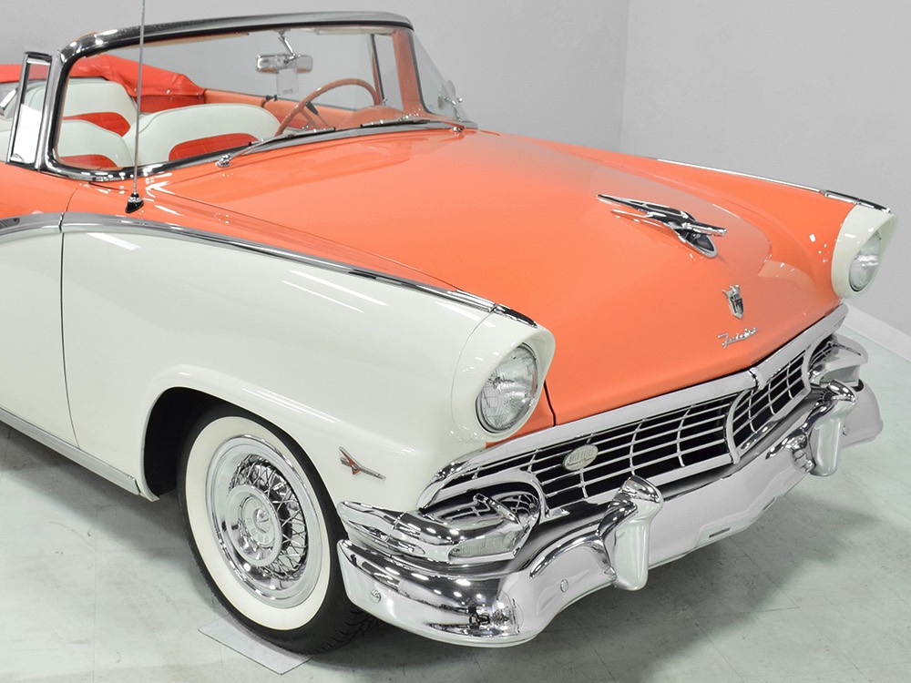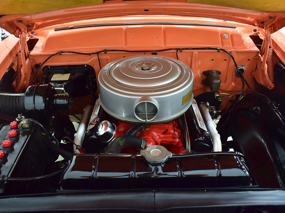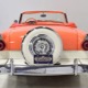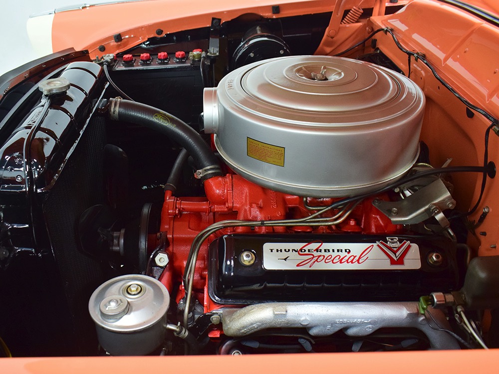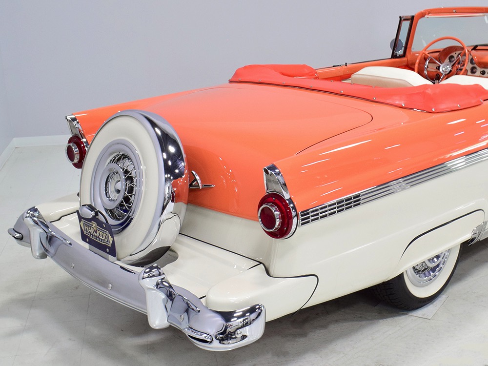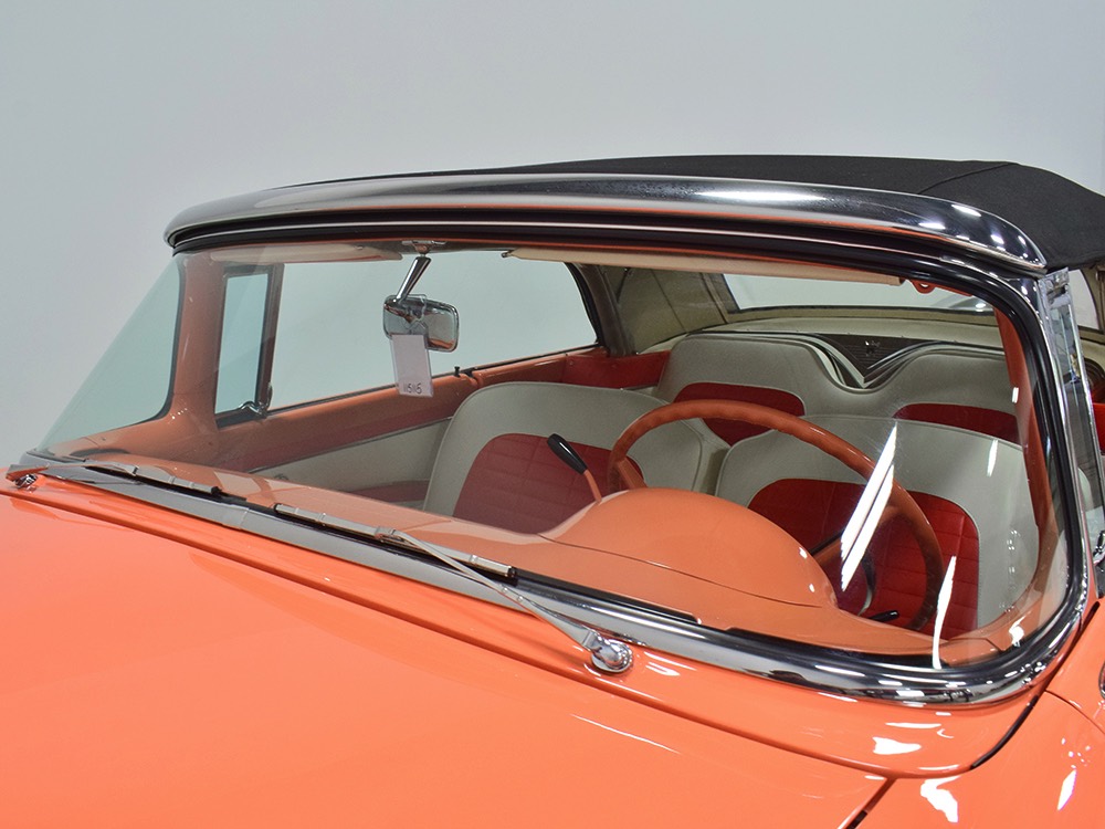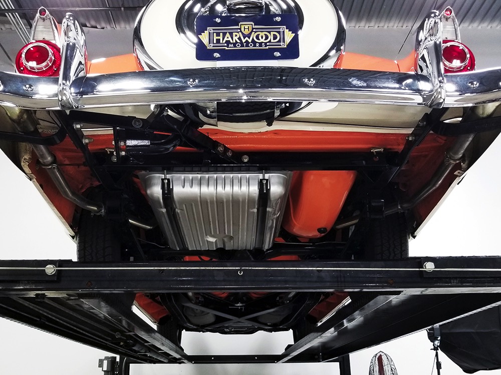 This stunning car comes from the estate of a collector who insisted on the very best, and the Sunliner certainly measures up. The striking color combination is authentic to the car, with the door tag showing code EN, which is Mandarin Orange over Colonial White. It’s just right for the ‘50s and don’t worry, the Mandarin Orange part isn’t too orange and it isn’t too pastel. It looks fantastic! Paint and bodywork are exceptional, with excellent gaps and panel alignment, befitting a car of this quality. The restoration was finished a few years ago but it shows few signs of use—just enough that we can’t quite call it perfect. The optional continental kit out back makes it look especially long and sleek and the many little details make it delightful to examine up close. The fluted side trim ends in painted “exhaust ports”, the delicate ‘Sunliner’ script on the doors makes it look official, and the awesome recessed hood ornament epitomizes the jet age in which it was born. All the bright stuff is fully restored to show condition and you’ll note that even the rear bumpers, through which the exhaust is routed, aren’t discolored. This car has been superbly maintained since it was completed.