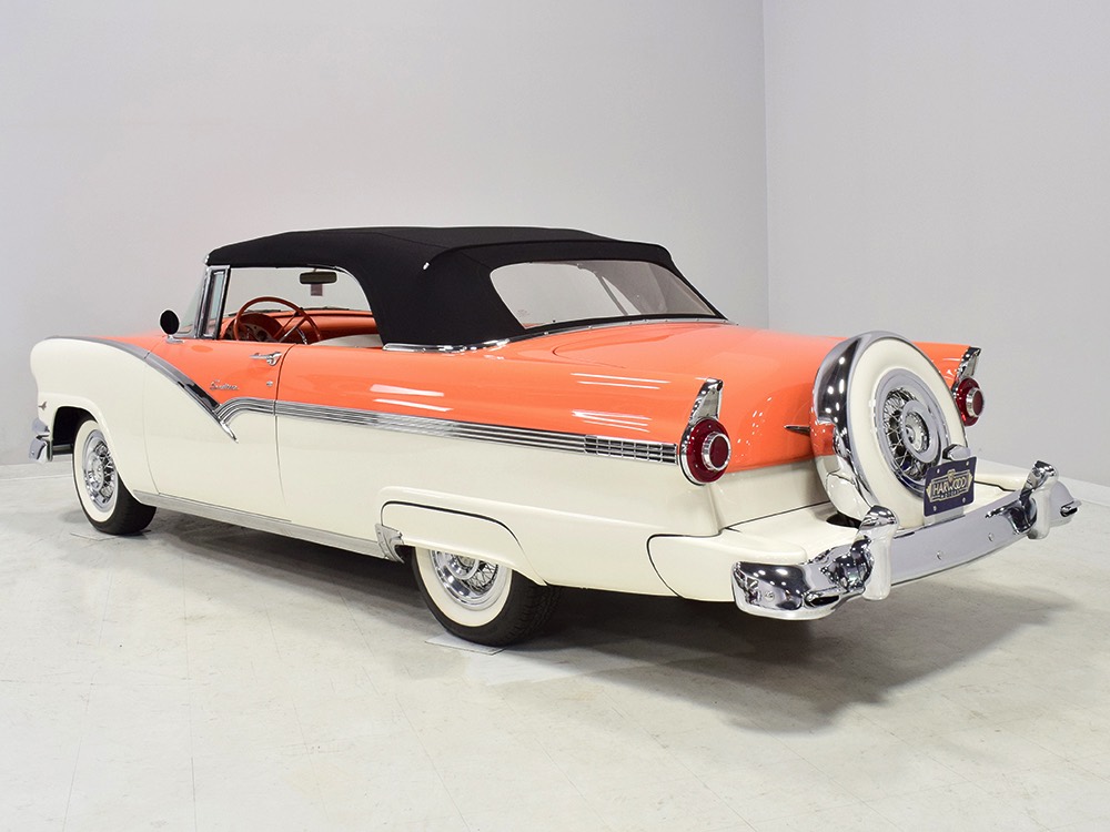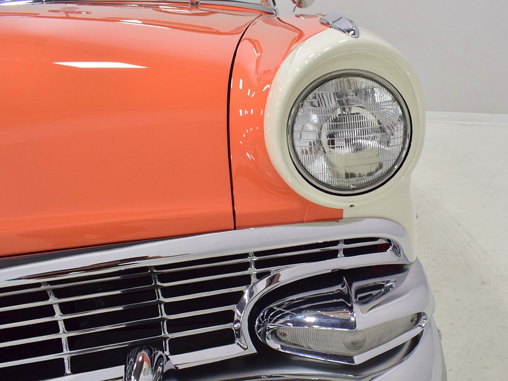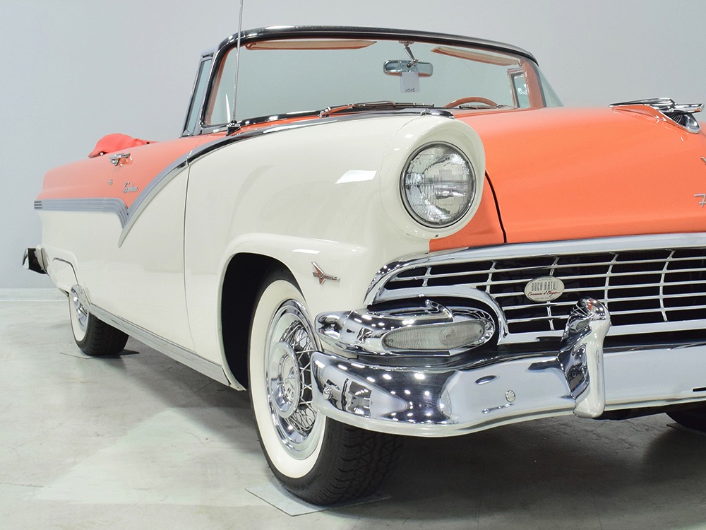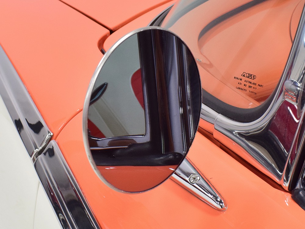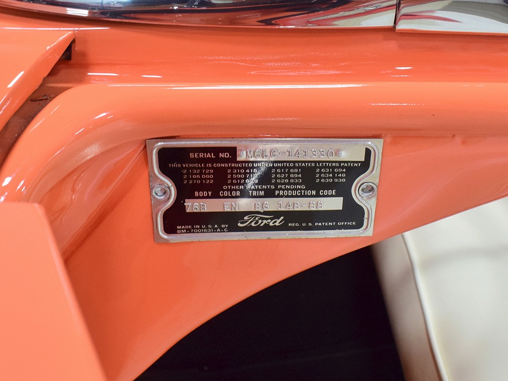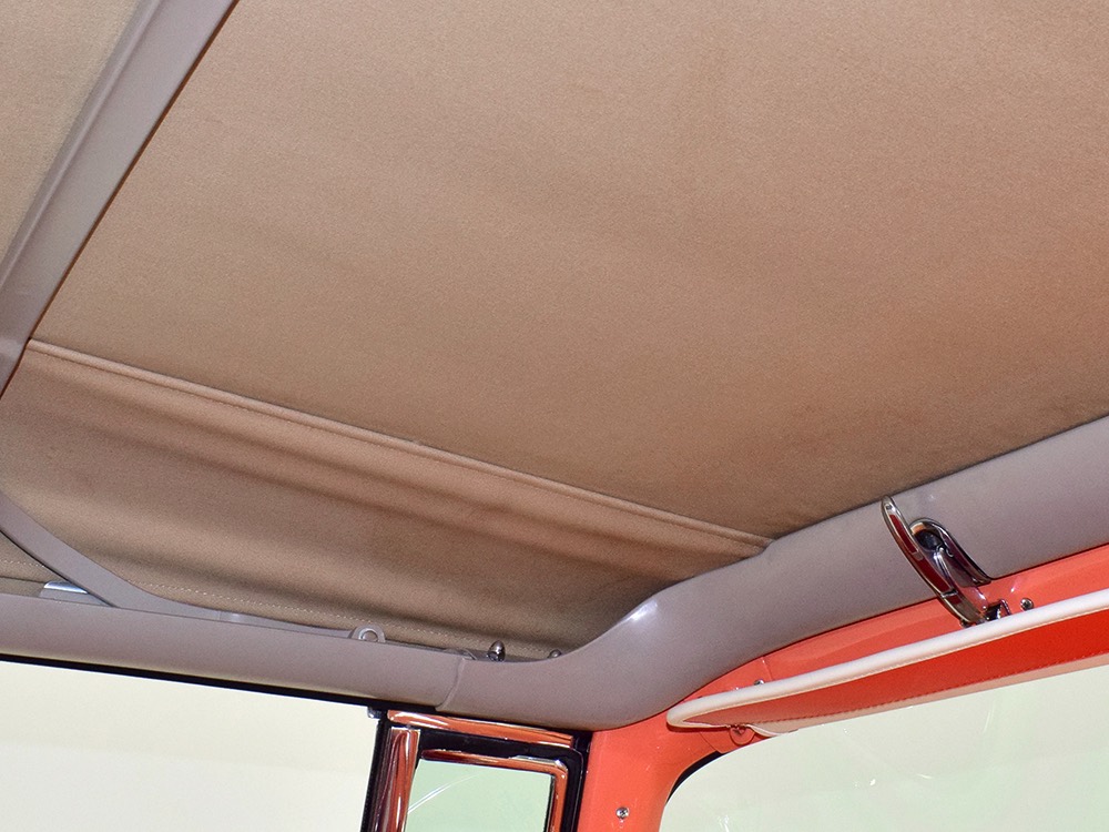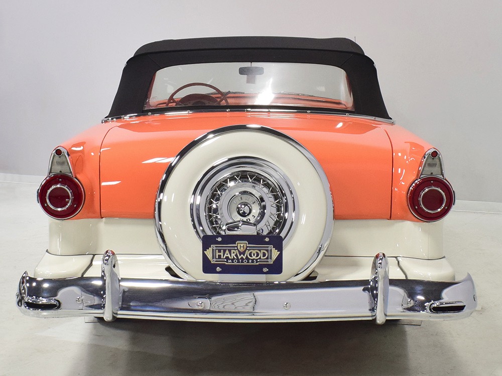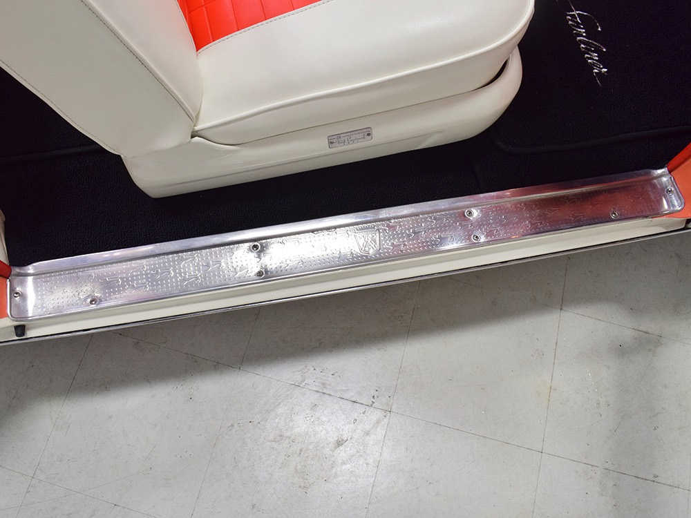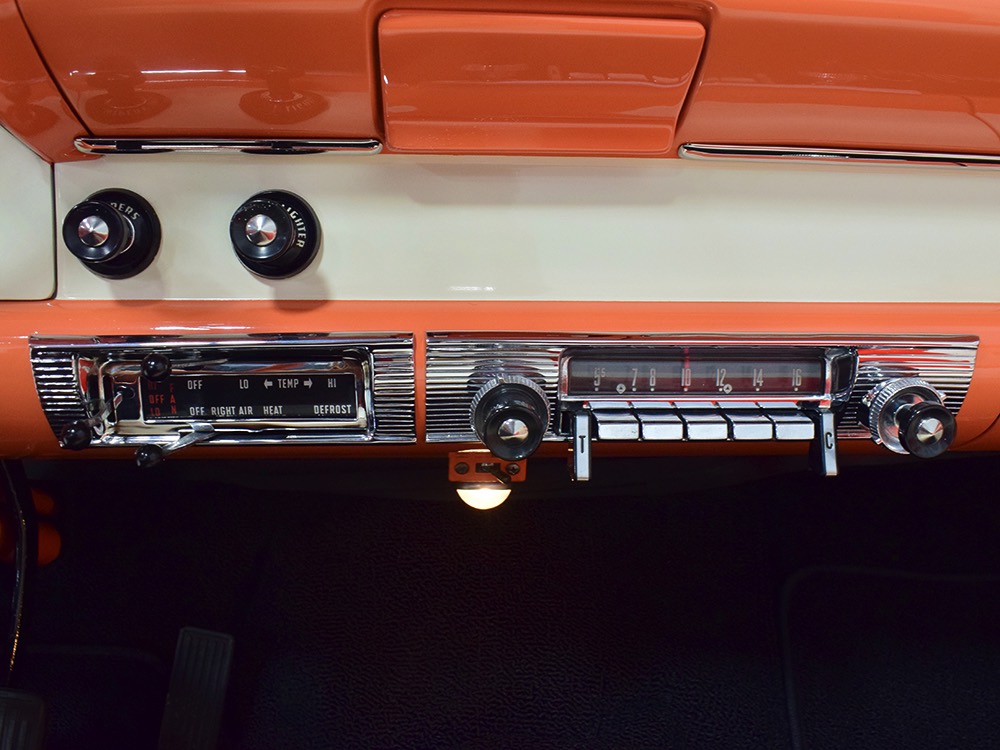 This stunning car comes from the estate of a collector who insisted on the very best, and the Sunliner certainly measures up. The striking color combination is authentic to the car, with the door tag showing code EN, which is Mandarin Orange over Colonial White. It’s just right for the ‘50s and don’t worry, the Mandarin Orange part isn’t too orange and it isn’t too pastel. It looks fantastic! Paint and bodywork are exceptional, with excellent gaps and panel alignment, befitting a car of this quality. The restoration was finished a few years ago but it shows few signs of use—just enough that we can’t quite call it perfect. The optional continental kit out back makes it look especially long and sleek and the many little details make it delightful to examine up close. The fluted side trim ends in painted “exhaust ports”, the delicate ‘Sunliner’ script on the doors makes it look official, and the awesome recessed hood ornament epitomizes the jet age in which it was born. All the bright stuff is fully restored to show condition and you’ll note that even the rear bumpers, through which the exhaust is routed, aren’t discolored. This car has been superbly maintained since it was completed.