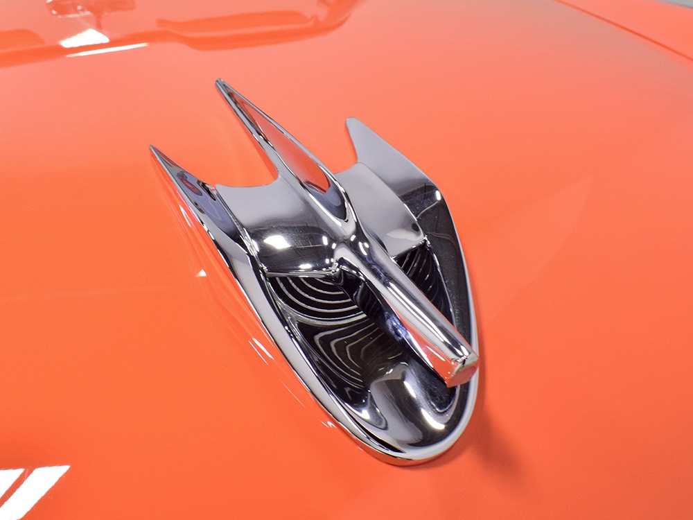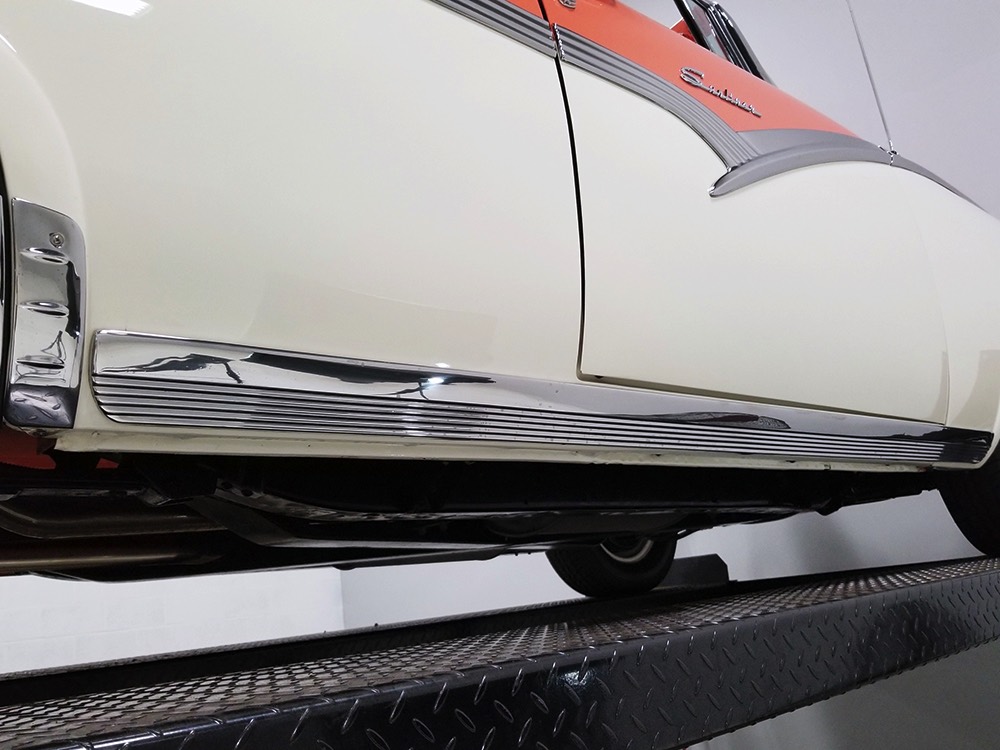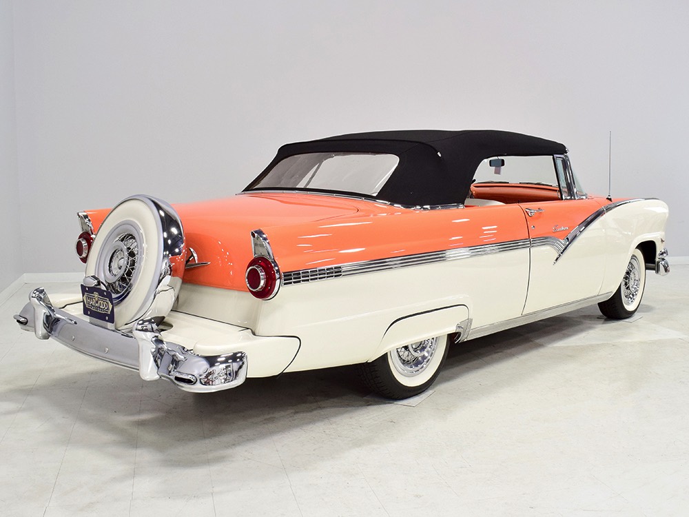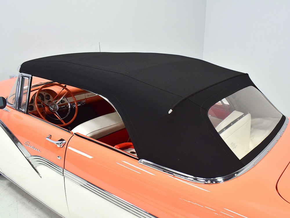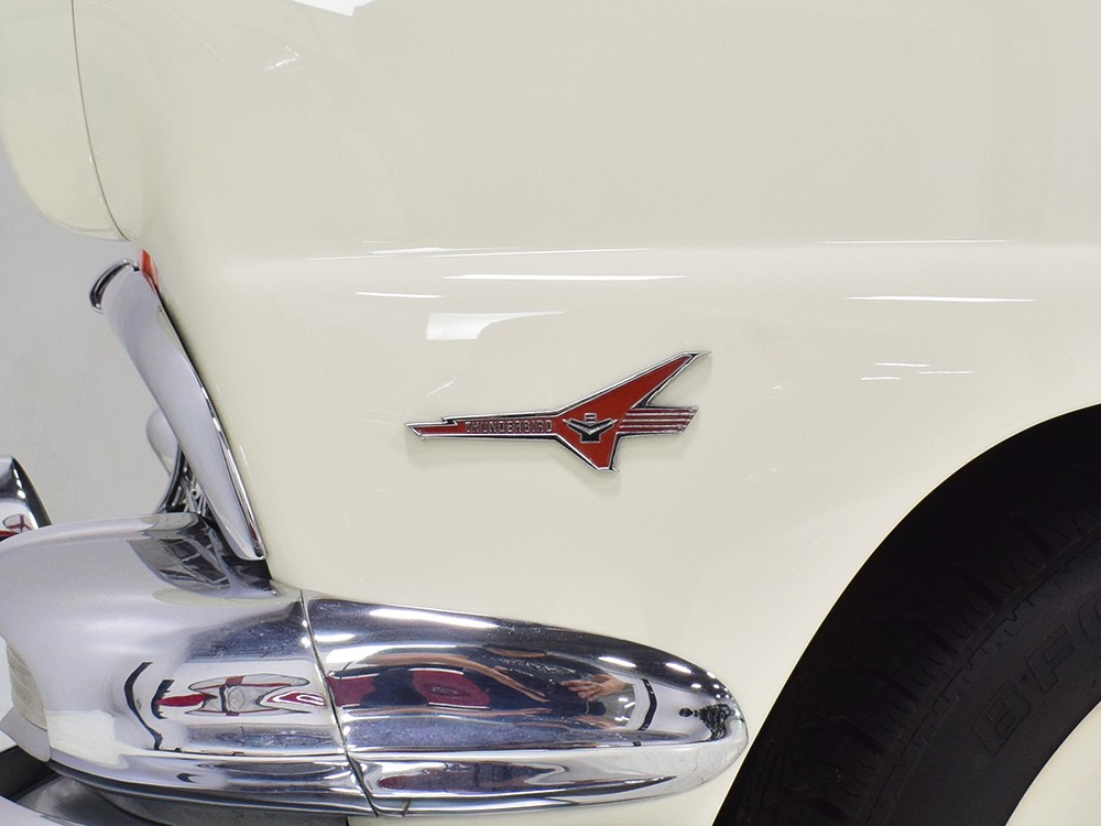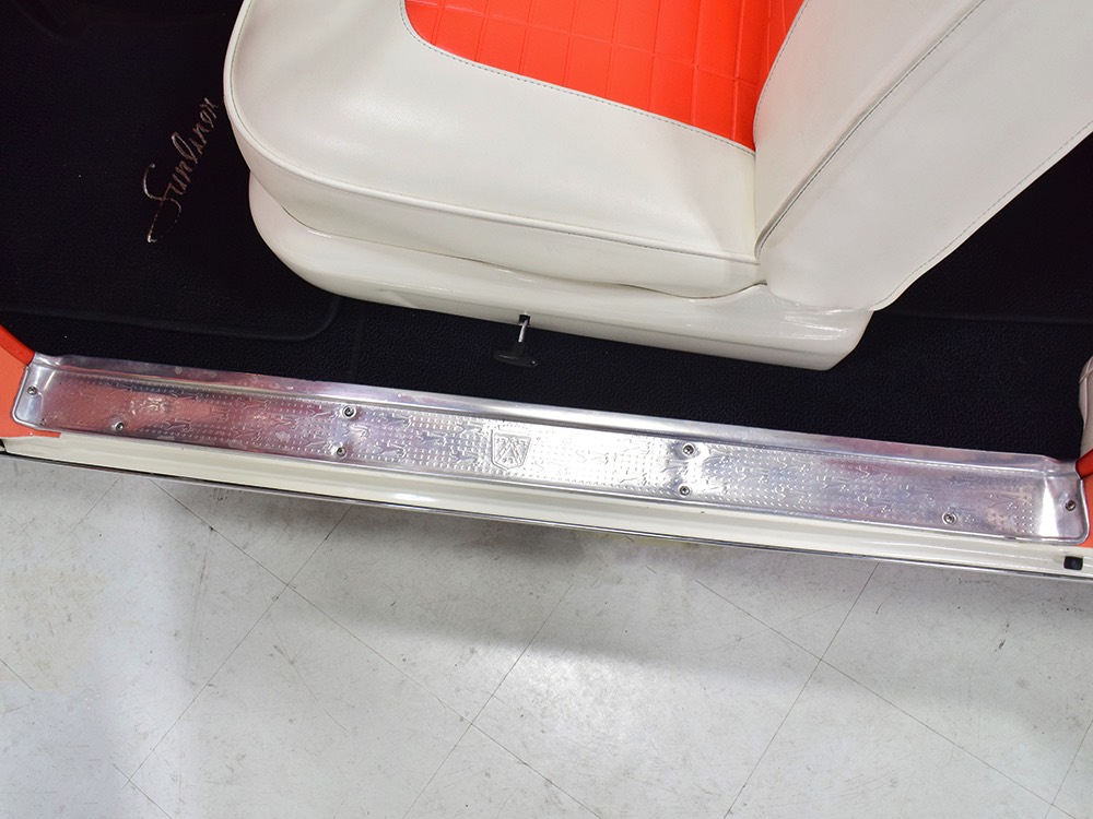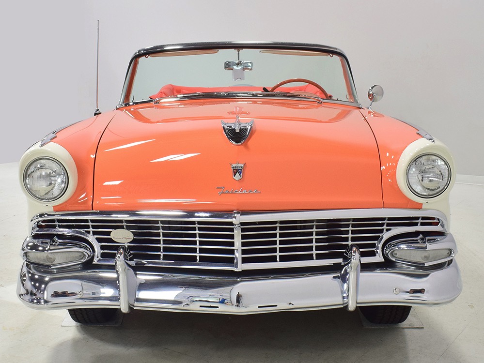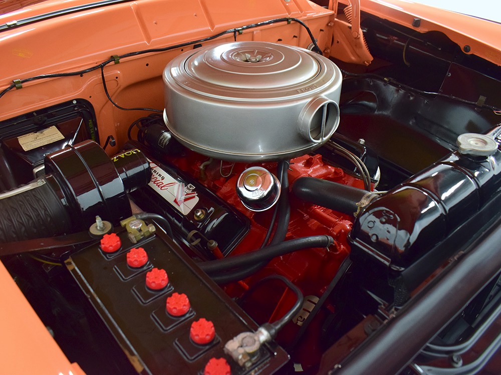 This stunning car comes from the estate of a collector who insisted on the very best, and the Sunliner certainly measures up. The striking color combination is authentic to the car, with the door tag showing code EN, which is Mandarin Orange over Colonial White. It’s just right for the ‘50s and don’t worry, the Mandarin Orange part isn’t too orange and it isn’t too pastel. It looks fantastic! Paint and bodywork are exceptional, with excellent gaps and panel alignment, befitting a car of this quality. The restoration was finished a few years ago but it shows few signs of use—just enough that we can’t quite call it perfect. The optional continental kit out back makes it look especially long and sleek and the many little details make it delightful to examine up close. The fluted side trim ends in painted “exhaust ports”, the delicate ‘Sunliner’ script on the doors makes it look official, and the awesome recessed hood ornament epitomizes the jet age in which it was born. All the bright stuff is fully restored to show condition and you’ll note that even the rear bumpers, through which the exhaust is routed, aren’t discolored. This car has been superbly maintained since it was completed.