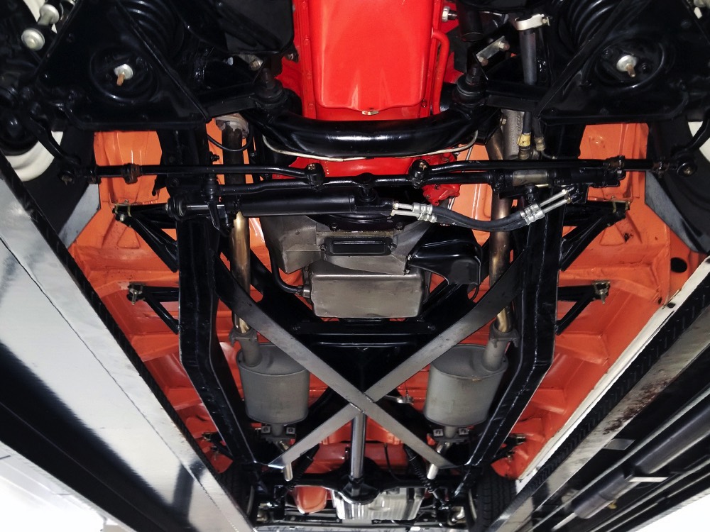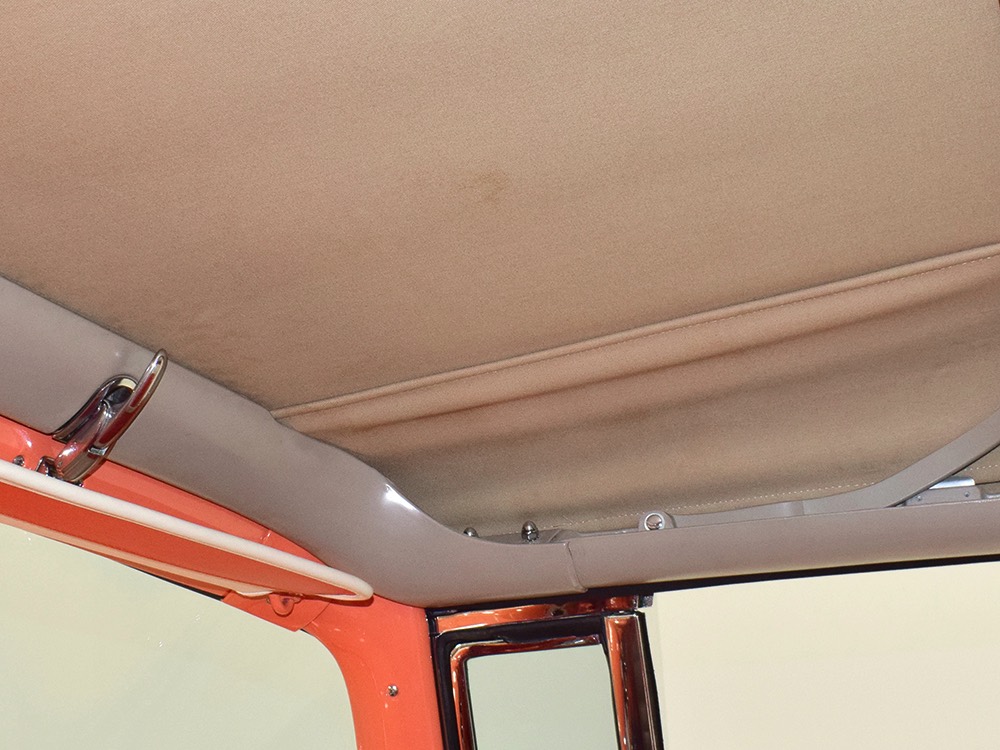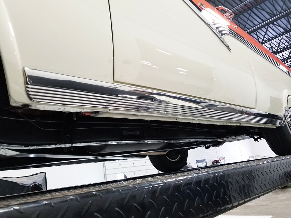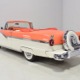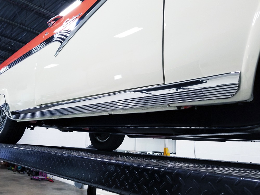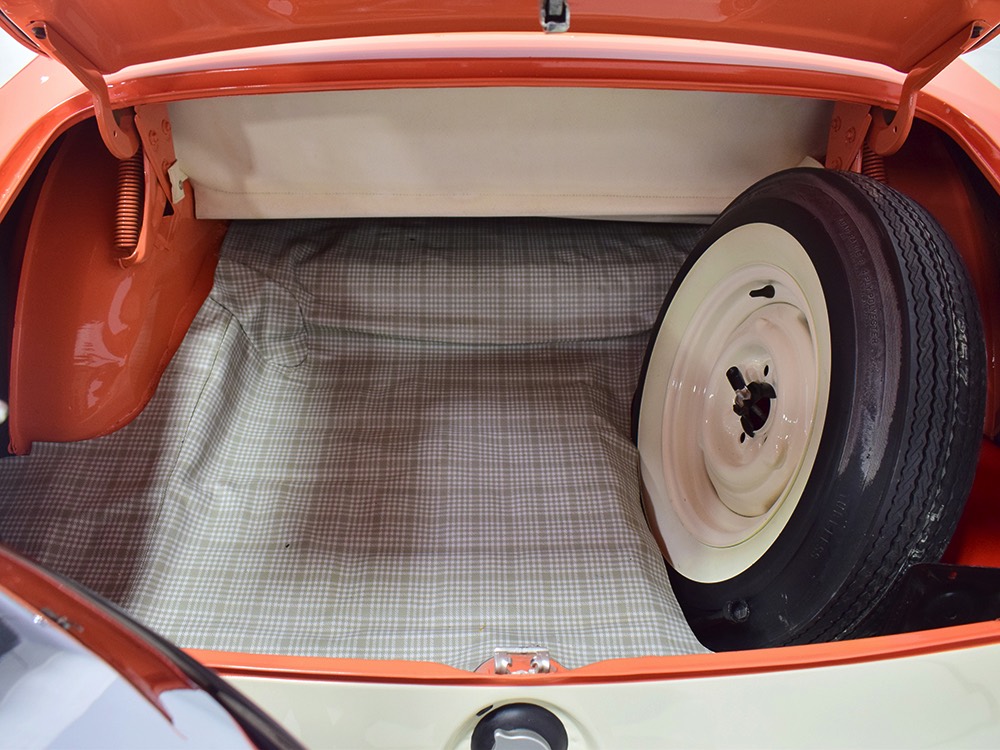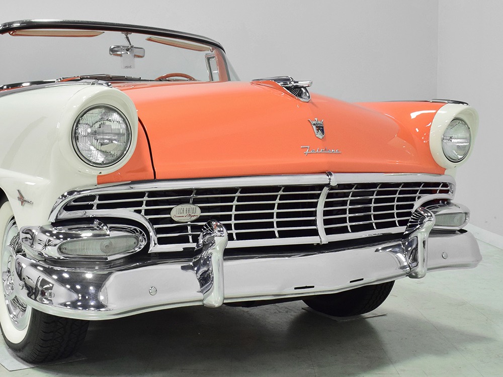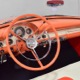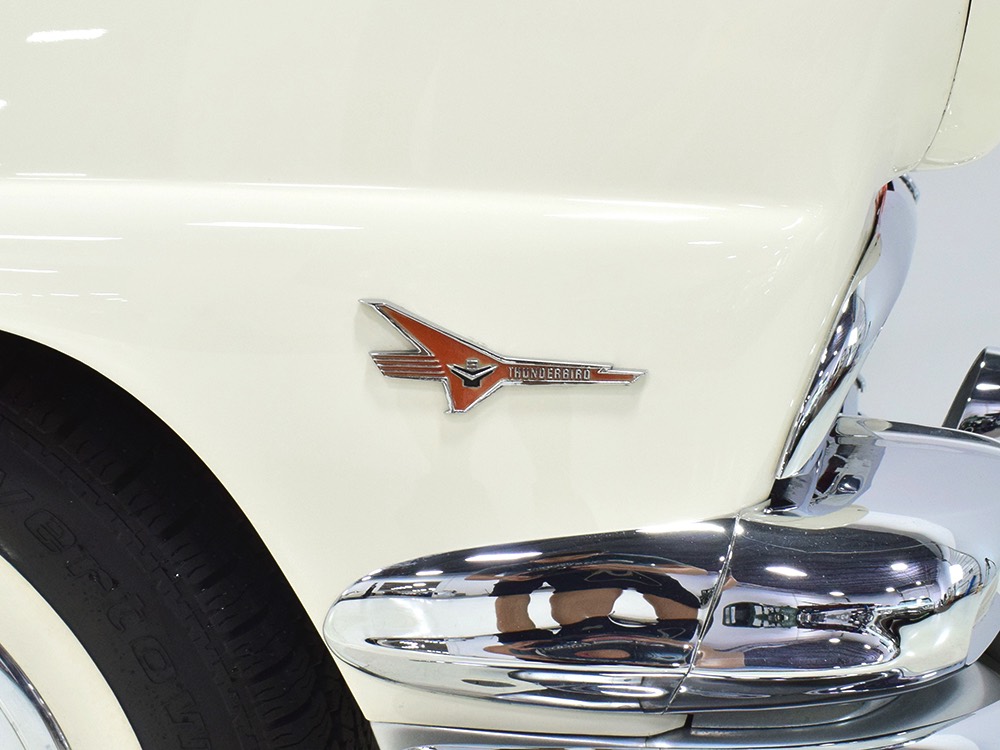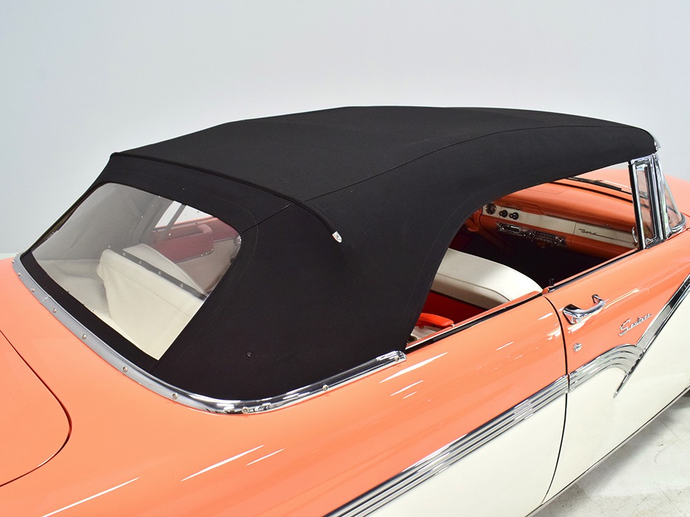 This stunning car comes from the estate of a collector who insisted on the very best, and the Sunliner certainly measures up. The striking color combination is authentic to the car, with the door tag showing code EN, which is Mandarin Orange over Colonial White. It’s just right for the ‘50s and don’t worry, the Mandarin Orange part isn’t too orange and it isn’t too pastel. It looks fantastic! Paint and bodywork are exceptional, with excellent gaps and panel alignment, befitting a car of this quality. The restoration was finished a few years ago but it shows few signs of use—just enough that we can’t quite call it perfect. The optional continental kit out back makes it look especially long and sleek and the many little details make it delightful to examine up close. The fluted side trim ends in painted “exhaust ports”, the delicate ‘Sunliner’ script on the doors makes it look official, and the awesome recessed hood ornament epitomizes the jet age in which it was born. All the bright stuff is fully restored to show condition and you’ll note that even the rear bumpers, through which the exhaust is routed, aren’t discolored. This car has been superbly maintained since it was completed.