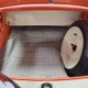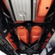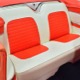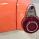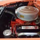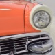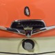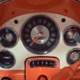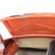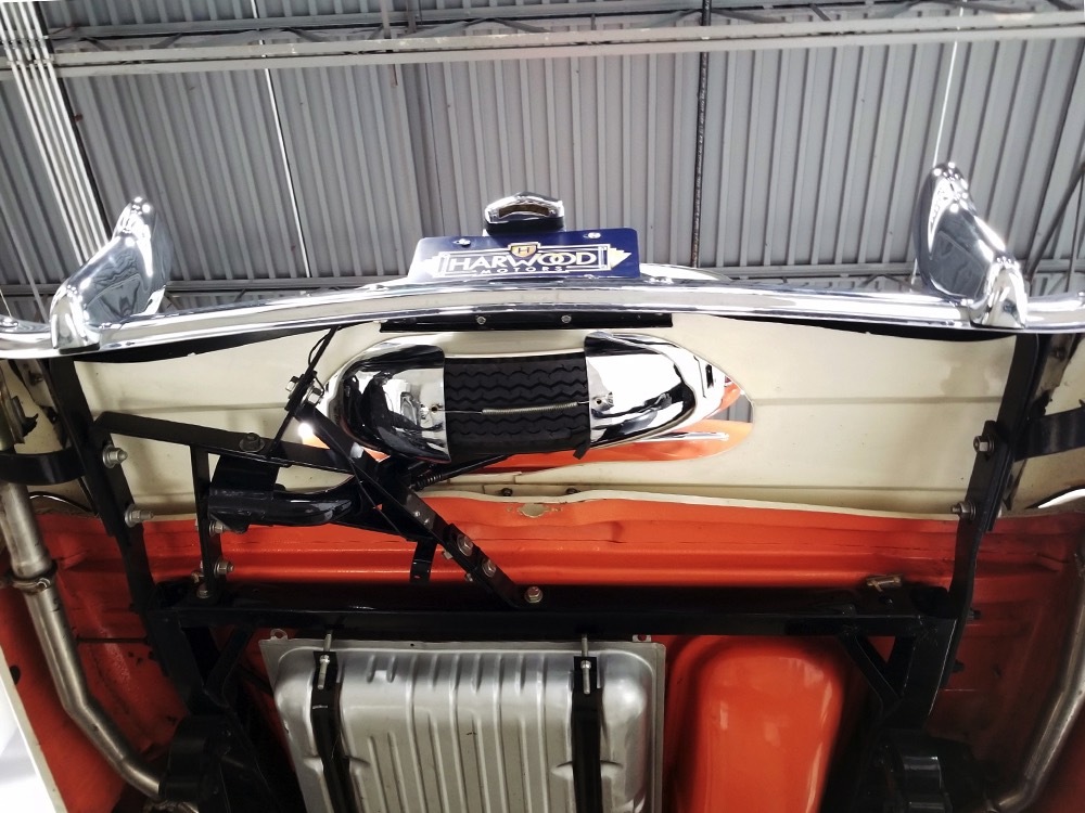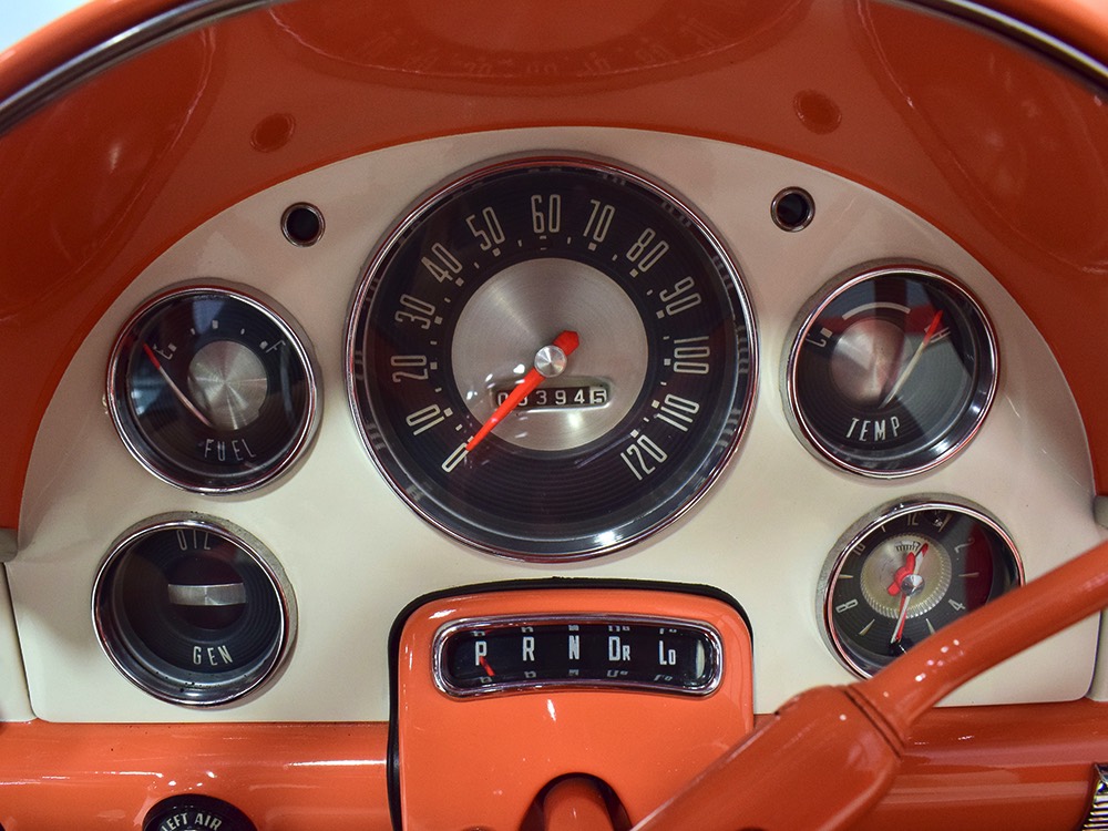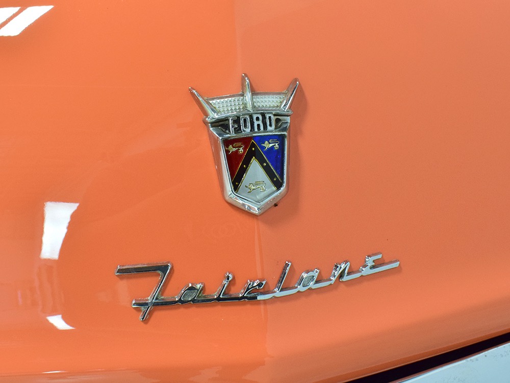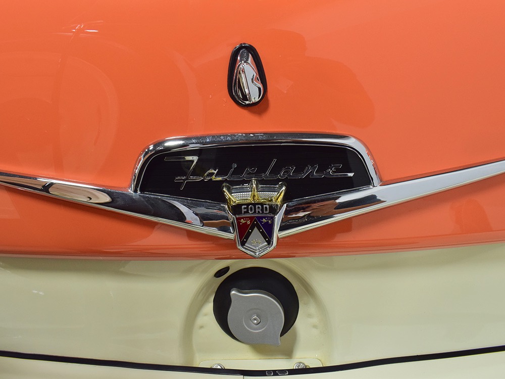 The code BF White and Orange vinyl interior is to original spec as well, and if you’re going to drive a high-profile ‘50s cruiser, there’s no point in going subtle inside. The seat covers replicate the original patterns exactly and the foam underneath remains firm and comfortable. Black carpets prevent it from being overwhelming, and the embroidered floor mats are a nice touch. The color-matched steering wheel is beautifully cast and the paint on the dashboard is every bit as nice as the exterior of the car—someone invested a lot of time color sanding and buffing all the little areas. The big, round gauges are crisply rendered with clear lenses and they’re all fully operational. Bright chrome accents around the heater controls and radio add some interest and the stylized Ford V8 emblem on the glove box door tells you that Ford was serious about taking the Fairlane upscale. The black power convertible top works properly and fits extremely well and stows under a color-matched orange boot. The trunk is likewise fully finished with a correct plaid mat, correct jack assembly, and a full-sized spare, just in case (the one in the continental kit is just too difficult to remove if you need it in an emergency).