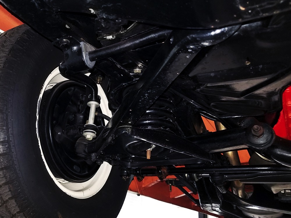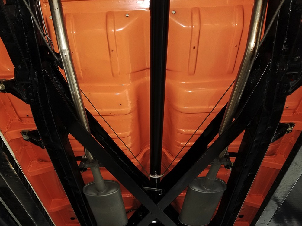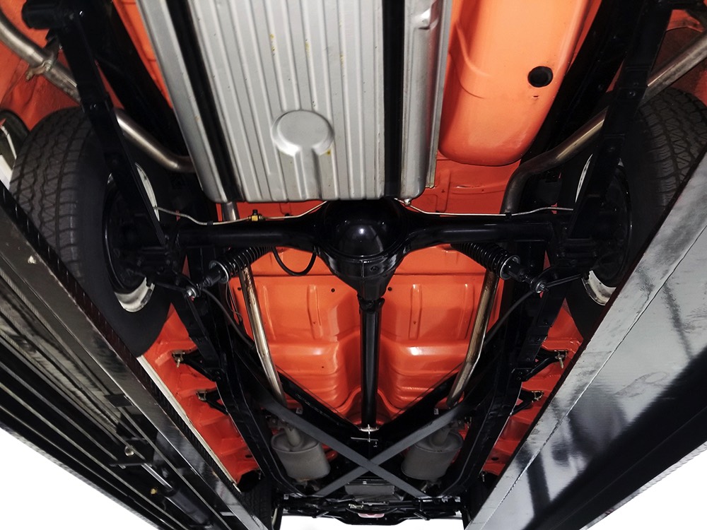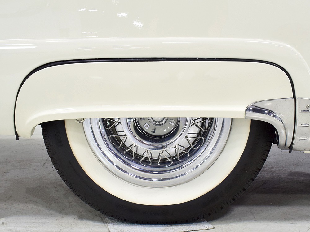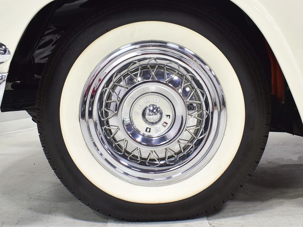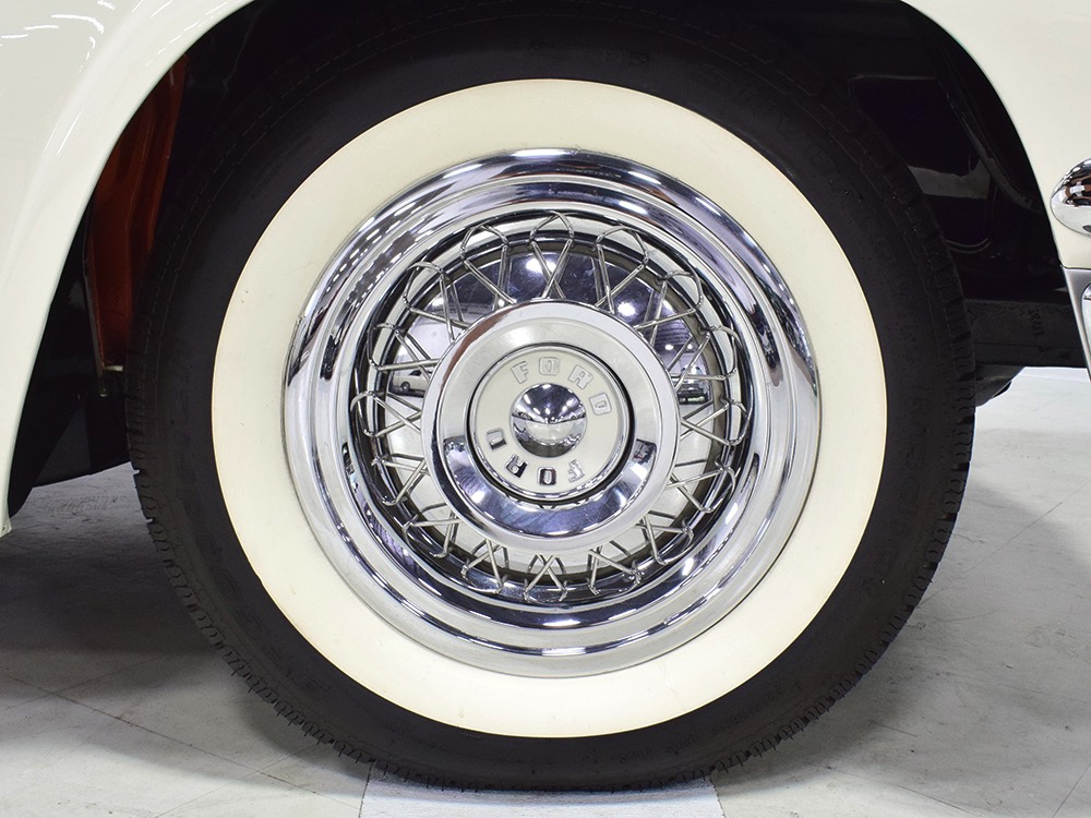 Underneath there’s a highly detailed chassis that is quite likely better than new. The Ford-O-Matic automatic transmission shifts crisply and there are 3.00 gears out back, so it’s an easy cruiser for long-distance trips. Body-colored floors provide a great backdrop for the semi-gloss black frame and suspension and we can find no evidence of floor patches or serious rust damage in the car’s past. There’s a new gas tank out back, a reproduction exhaust system with the right sound, and yes, those coil-over helper springs on the shocks are OEM, not an aftermarket addition. Even the spare tire well is in excellent condition with no signs of rot. It stops straight, rides smoothly, and generally acts like a top-of-the-line automobile. Painted steel wheels with familiar Ford wire wheel covers carry 215/75/15 BFGoodrich Silvertown radials, one of the few deviations from stock but a good choice for driving.